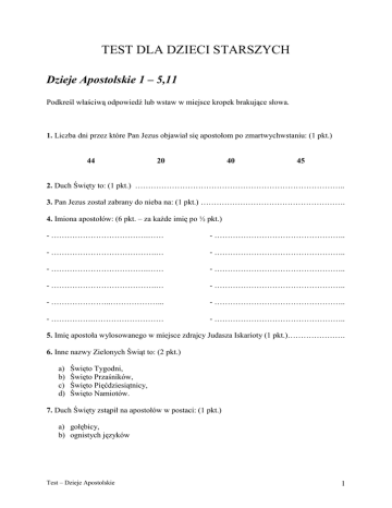 TEST DLA DZIECI STARSZYCH Dzieje Apostolskie 1 – 5,11 Podkreśl właściwą odpowiedź lub wstaw w miejsce kropek brakujące słowa. 1. Liczba dni przez które Pan Jezus objawiał się apostołom po zmartwychwstaniu: (1 pkt.) 44 20 40 45 2. Duch Święty to: (1 pkt.) …………………………………………………………………….. 3. Pan Jezus został zabrany do nieba na: (1 pkt.) ………………………………………………. 4. Imiona apostołów: (6 pkt. – za każde imię po ½ pkt.) - ……………………………….…… - ………………………………………….. - ………………………………….… - ………………………………………….. - ……………………………….…… - ………………………………………….. - ………………………………….… - ………………………………………….. - …………………..………………... - ………………………………………….. - …………….……………………… - ………………………………………….. 5. Imię apostoła wylosowanego w miejsce zdrajcy Judasza Iskarioty (1 pkt.)…………………. 6. Inne nazwy Zielonych Świąt to: (2 pkt.) a) b) c) d) Święto Tygodni, Święto Przaśników, Święto Pięćdziesiątnicy, Święto Namiotów. 7. Duch Święty zstąpił na apostołów w postaci: (1 pkt.) a) gołębicy, b) ognistych języków Test – Dzieje Apostolskie 1 8. Jaką umiejętność otrzymali apostołowie dzięki wylaniu na nich Ducha Świętego i do czego miała ona im służyć? (2 pkt.) ………………………………………………………………………………………………… ………………………………………………………………………………………………… ………………………………………………………………………………………………… ………………………………………………………………………………………………… 9. Podczas kazania w dzień zesłanie Ducha Świętego apostoł Piotr powiedział do zgromadzonych: (2 pkt.) „Upamiętajcie się i niech każdy z was da się …………………… w imię …………………….. 10. Po kazaniu apostoła Piotra w Zielone Święta pozyskanych zostało: (1 pkt.) a) 300 osób, b) 3 000 osób, c) 30 000 osób. 11. Pieniądze ofiarowane przez chrześcijan ze sprzedaży ich majętności apostołowie przeznaczali na: (1 pkt.) a) budowę świątyni, b) podróże misyjne, c) na wspólne potrzeby chrześcijan pierwszych zborów. 12. Kto został uzdrowiony przy bramie „Pięknej” świątyni; (1 pkt.) a) b) c) d) ślepy, trędowaty, chromy, głuchy. 13. W czyim imieniu apostołowie czynili znaki i cuda: (1 pkt.) a) we własnym, b) Jezusa Chrystusa 14. O czym nauczali apostołowie ludzi: (1 pkt.) a) o stworzeniu świata, b) o cudach Mojżesza, c) o Jezusie Chrystusie. Test – Dzieje Apostolskie 2 15. Czego zakazali apostołom uczeni w Piśmie i kapłani: (1 pkt.) a) uzdrawiać, b) wspomagać biednych, c) mówić i nauczać w imieniu Jezusa Chrystusa. 16. Kto zachował część pieniędzy ze sprzedaży posiadłości i okłamał apostoła Piotra co do ceny, za jaką sprzedał ziemię: (1 pkt.) ……………………………………… i …………………………………………. 17. Jaka kara spotkała kłamców: (1 pkt.) a) więzienie, b) odsunięcie od zboru, c) śmierć Punktacja: 22 - 25 21 - 18 17 – 14 13 – 10 9–0 bardzo dobry, dobry, dostateczny, dopuszczający, niedostateczny. Imię i nazwisko: ………………………………… Test – Dzieje Apostolskie Ocena: …………………………… 3