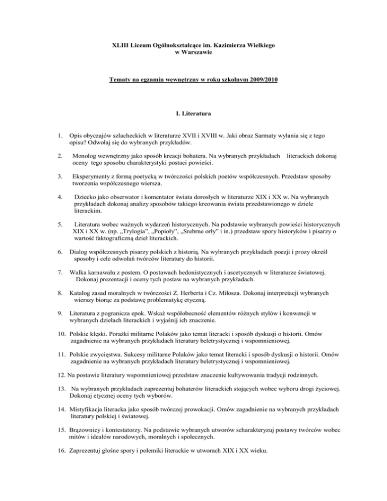 XLIII Liceum Ogólnokształcące im. Kazimierza Wielkiego w Warszawie Tematy na egzamin wewnętrzny w roku szkolnym 2009/2010 I. Literatura 1. Opis obyczajów szlacheckich w literaturze XVII i XVIII w. Jaki obraz Sarmaty wyłania się z tego opisu? Odwołaj się do wybranych przykładów. 2. Monolog wewnętrzny jako sposób kreacji bohatera. Na wybranych przykładach oceny tego sposobu charakterystyki postaci powieści. literackich dokonaj 3. Eksperymenty z formą poetycką w twórczości polskich poetów współczesnych. Przedstaw sposoby tworzenia współczesnego wiersza. 4. Dziecko jako obserwator i komentator świata dorosłych w literaturze XIX i XX w. Na wybranych przykładach dokonaj analizy sposobów takiego kreowania świata przedstawionego w dziele literackim. 5. Literatura wobec ważnych wydarzeń historycznych. Na podstawie wybranych powieści historycznych XIX i XX w. (np. „Trylogia”, „Popioły”, „Srebrne orły” i in.) przedstaw spory historyków i pisarzy o wartość faktograficzną dzieł literackich. 6. Dialog współczesnych pisarzy polskich z historią. Na wybranych przykładach poezji i prozy określ sposoby i cele odwołań twórców literatury do historii. 7. Walka karnawału z postem. O postawach hedonistycznych i ascetycznych w literaturze światowej. Dokonaj prezentacji i oceny tych postaw na wybranych przykładach. 8. Katalog zasad moralnych w twórczości Z. Herberta i Cz. Miłosza. Dokonaj interpretacji wybranych wierszy biorąc za podstawę problematykę etyczną. 9. Literatura z pogranicza epok. Wskaż współobecność elementów różnych stylów i konwencji w wybranych dziełach literackich i wyjaśnij ich znaczenie. 10. Polskie klęski. Porażki militarne Polaków jako temat literacki i sposób dyskusji o historii. Omów zagadnienie na wybranych przykładach literatury beletrystycznej i wspomnieniowej. 11. Polskie zwycięstwa. Sukcesy militarne Polaków jako temat literacki i sposób dyskusji o historii. Omów zagadnienie na wybranych przykładach literatury beletrystycznej i wspomnieniowej. 12. Na postawie literatury wspomnieniowej przedstaw znaczenie kultywowania tradycji rodzinnych. 13. Na wybranych przykładach zaprezentuj bohaterów literackich stojących wobec wyboru drogi życiowej. Dokonaj etycznej oceny tych wyborów. 14. Mistyfikacja literacka jako sposób twórczej prowokacji. Omów zagadnienie na wybranych przykładach literatury polskiej i światowej. 15. Brązownicy i kontestatorzy. Na podstawie wybranych utworów scharakteryzuj postawy twórców wobec mitów i ideałów narodowych, moralnych i społecznych. 16. Zaprezentuj głośne spory i polemiki literackie w utworach XIX i XX wieku. -2- 17. Symbol i alegoria jako metoda twórcza w dziele literackim. Omów cele, sposoby realizacji i funkcje artystyczne. 18. Problem z translacją. Porównując różne przekłady na język polski tych samych utworów poetyckich, wskaż, na czym polegają trudności z tłumaczeniem wiersza. 19. Przedstaw cele i sposoby animizacji przyrody w literaturze polskiego romantyzmu. Odwołaj się do wybranych przykładów. 20. „Wesele” jako źródło inspiracji dla pisarzy XX wieku. Przedstaw cele i dokonaj oceny artystycznych powrotów do dramatu S. Wyspiańskiego. 21. „Dziady” jako źródło inspiracji pisarzy polskich. Przedstaw cele i dokonaj oceny artystycznych powrotów do arcydzieła A. Mickiewicza. 22. Na wybranych przykładach dokonaj prezentacji różnych koncepcji czasu i przestrzeni w twórczości pisarzy XX wieku. 23. Analizując wybrane przykłady literackie oceń zasadność preferowania określonych gatunków literackich w określonych epokach. 24. Przedstaw i oceń różne sposoby wykorzystania paraboli w literaturze dydaktycznej i wychowawczej. Odwołaj się do wybranych przykładów. 25. Przedstaw losy Polaków na „nieludzkiej ziemi” po deportacjach w głąb ZSRR w świetle literatury wspomnieniowej i pamiętnikarskiej. Określ, jaki kodeks etyczny ułatwił tym ludziom ocalenie i przetrwanie. 26. Jan Kochanowski i jego twórczość jako źródło inspiracji pisarzy późniejszych epok. Dokonaj oceny artystycznych powrotów do poezji Jana z Czarnolasu. Odwołaj się do wybranych przykładów. 27. Bohater czytający. Wpływ literatury na świadomość i losy bohaterów literackich. Omów na wybranych przykładach. 28. Starość jako motyw literacki. Na wybranych przykładach przedstaw postawy bohaterów literackich u zmierzchu życia. Dokonaj oceny tych postaw. 29. Kłamstwo i jego wpływ na losy bohatera literackiego. Omów zagadnienie na wybranych utworach. 30. Pisarze polscy w poszukiwaniu straconego czasu. Literatura wspomnieniowa oraz autobiograficzna – jej wpływ na rozumienie autora i jego twórczości. Omów zagadnienie na podstawie wybranych utworów pisarzy współczesnych. 31. Problemy z literaturą faktu. Na wybranych przykładach dokonaj próby klasyfikacji rodzajowej i gatunkowej tego typu utworów XX wieku. 32. Cnota jako przedmiot dociekań filozofów i poetów. Interpretując celowo wybrane przykłady tekstów literackich oraz odwołując się do kontekstów filozoficznych, zaprezentuj ewolucję pojęcia. 33. Lord Paradoks i Lady Paradoks – przedstaw aforystykę Oscara Wilde’a i Wisławy Szymborskiej jako sposób komentowania rzeczywistości. 34. Stefan Żeromski wobec przeszłości narodowej. Przedstaw stosunek pisarza do mitów i faktów z historii Polski. Odwołaj się do wybranych przykładów. 35. Na podstawie utworów literatury XX wieku rozważ, czy prawdziwa jest sugestia, że wydarzenia historyczne mogą służyć interpretacji i ocenie zjawisk życia współczesnego. -3- 36. Na postawie utworów Juliana Tuwima przedstaw stanowisko poety wobec wydarzeń politycznych i społecznych w dwudziestoleciu międzywojennym w Polsce. 37. Wielkie dzieła literatury w homiliach papieża Jana Pawła II – określ kontekst i cele odwołań papieża do tych dzieł. 38. Poeta jako bohater literacki. Na podsta