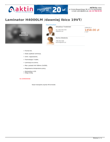 Laminator H4000LM /dawniej Ibico 19VT/ Twój konsultant Arkadiusz Trzebiński tel. 503 030 555 [email protected] NOWOŚĆ W OFERCIE 1599.00 zł 1458.00 zł z VAT Karina Gładecka 796 603 606 [email protected] Format A2, Stała szybkość laminacji, 2min. nagrzewanie, Technologia: 4 wałki, Laminacja na zimno, Max. grubość folii 500mic (2x500), Regulowana temperatura pracy, Wyświetlacz LCD Waga 6,9kg, NA ZAMÓWIENIE Koszt transportu wynosi 49 zł brutto Strona 1 / 1 Powered by TCPDF (www.tcpdf.org)