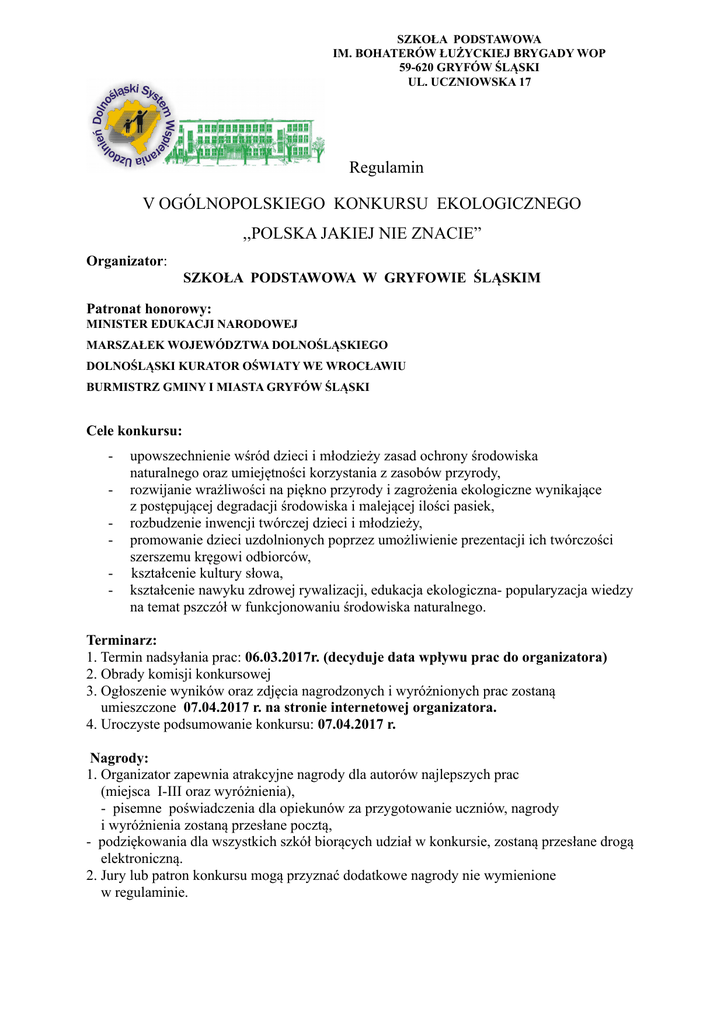 SZKOŁA PODSTAWOWA IM. BOHATERÓW ŁUŻYCKIEJ BRYGADY WOP 59-620 GRYFÓW ŚLĄSKI UL. UCZNIOWSKA 17 Regulamin V OGÓLNOPOLSKIEGO KONKURSU EKOLOGICZNEGO ,,POLSKA JAKIEJ NIE ZNACIE” Organizator: SZKOŁA PODSTAWOWA W GRYFOWIE ŚLĄSKIM Patronat honorowy: MINISTER EDUKACJI NARODOWEJ MARSZAŁEK WOJEWÓDZTWA DOLNOŚLĄSKIEGO DOLNOŚLĄSKI KURATOR OŚWIATY WE WROCŁAWIU BURMISTRZ GMINY I MIASTA GRYFÓW ŚLĄSKI Cele konkursu: - upowszechnienie wśród dzieci i młodzieży zasad ochrony środowiska naturalnego oraz umiejętności korzystania z zasobów przyrody, rozwijanie wrażliwości na piękno przyrody i zagrożenia ekologiczne wynikające z postępującej degradacji środowiska i malejącej ilości pasiek, rozbudzenie inwencji twórczej dzieci i młodzieży, promowanie dzieci uzdolnionych poprzez umożliwienie prezentacji ich twórczości szerszemu kręgowi odbiorców, kształcenie kultury słowa, kształcenie nawyku zdrowej rywalizacji, edukacja ekologiczna- popularyzacja wiedzy na temat pszczół w funkcjonowaniu środowiska naturalnego. Terminarz: 1. Termin nadsyłania prac: 06.03.2017r. (decyduje data wpływu prac do organizatora) 2. Obrady komisji konkursowej 3. Ogłoszenie wyników oraz zdjęcia nagrodzonych i wyróżnionych prac zostaną umieszczone 07.04.2017 r. na stronie internetowej organizatora. 4. Uroczyste podsumowanie konkursu: 07.04.2017 r. Nagrody: 1. Organizator zapewnia atrakcyjne nagrody dla autorów najlepszych prac (miejsca I-III oraz wyróżnienia), - pisemne poświadczenia dla opiekunów za przygotowanie uczniów, nagrody i wyróżnienia zostaną przesłane pocztą, - podziękowania dla wszystkich szkół biorących udział w konkursie, zostaną przesłane drogą elektroniczną. 2. Jury lub patron konkursu mogą przyznać dodatkowe nagrody nie wymienione w regulaminie. Warunki uczestnictwa w konkursie I. „Ekolog – plastyk”: Warunkiem uczestnictwa w konkursie jest oddanie we wskazanym terminie: pracy plastycznej formatu A-3 ( technika dowolna) związanej z tematem: „Co słychać w ulu?” Konkurs jest przeznaczony dla uczniów klas: I – III, IV-VI szkół podstawowych. Kryteria oceniania prac: a) walory artystyczne, b) inwencja twórcza i wrażliwość autora, c) trafne i oryginalne opracowanie tematu, d) czytelność i estetyka pracy, e) trud włożony w samodzielne tworzenie pracy, f) kolorystyka i pomysłowość, Prace będą oceniane w kategoriach wiekowych: I-III, IV-VI II. „Ekolog – poeta”: Warunkiem uczestnictwa w konkursie jest oddanie we wskazanym terminie samodzielnie napisanego wiersza, wydrukowanego w czterech egzemplarzach ( czcionka 12 ) związanego z tematem: „Co słychać w ulu?” Konkurs jest przeznaczony dla uczniów klas: I – III, IV-VI szkół podstawowych. Kryteria oceniania prac: a) walory artystyczne, b) inwencja twórcza i wrażliwość autora, c) zgodność z tematem, d) trud włożony w samodzielne tworzenie pracy, e) kultura języka, Prace będą oceniane w kategoriach wiekowych: I-III, IV-VI Prace plastyczne i literackie należy opatrzyć metryczką zawierającą: a) imię i nazwisko autora, b) nazwę szkoły, c) klasę, d) nazwisko nauczyciela, pod kierunkiem którego praca została wykonana. Warunkiem udziału w Konkursie jest załączenie do przesłanej pracy, pisemnego oświadczenia prawnych opiekunów autora o wyrażeniu zgody na przetwarzanie danych osobowych podopiecznego. Szkoła przeprowadza eliminacje we własnym zakresie. Należy przesłać na adres: SZKOŁA PODSTAWOWA IM. BOHATERÓW ŁUŻYCKIEJ BRYGADY WOP, UL. UCZNIOWSKA 17 59-620 GRYFÓW ŚLĄSKI do 5 prac literackich i 5 plastycznych z każdej grupy wiekowej oraz listę zbiorczą uczestników konkursu z adresem i e-mailem szkoły. Każda praca oceniana będzie przez niezależnych jurorów. Suma punktów przez nich przyznana wyłoni laureatów. Prace nie spełniające wymogów określonych w regulaminie nie będą oceniane. Od decyzji komisji nie przysługuje odwołanie. Informacje dodatkowe: 1. Uczestnik konkursu z chwilą przekazania pracy konkursowej udziela organizatorowi i patronom nieodpłatnie licencji do publikacji nadesłanych prac w mediach, Internecie i wydawnictwach pokonkursowych w celach promocyjnych oraz wyraża zgodę na przetwarzanie danych osobowych i wykorzystanie wizerunku. 2. W przypadku, jeśli nadesłane prace będą naruszać prawa osób trzecich, całkowitą odpowiedzialność za to ponosi autor prac i jego opiekun. 3. Organizator nie ponosi odpowiedzialności za uszkodzenie lub zniszczenie prac w trakcie przesyłki. 4. Przekazanie prac na konkurs oznacza akceptację regulaminu. 5. 6. 7. 8. Prace nie podlegają zwrotowi i pozostają do dyspozycji organizatora. Decyzje jury mają charakter ostateczny. Sprawy nie ujęte w regulaminie rozstrzyga organizator. Regulamin konkursu znajduje się w informatorze konkursów na stronie internetowej Kuratorium Oświaty i Wychowania we Wrocławiu oraz na stronie internetowej organizatora www.spgryfow.internetdsl.pl 9. Odpowiedzi na dodatkowe pytania związane z konkursem udziela nauczyciel koordynujący konkurs Jadwiga Hawryluk pod numerem telefonu: 075-78-13-486 wew. 36