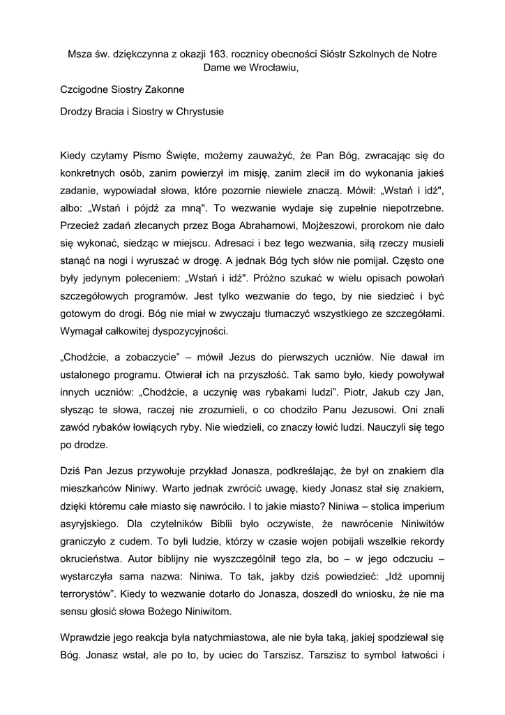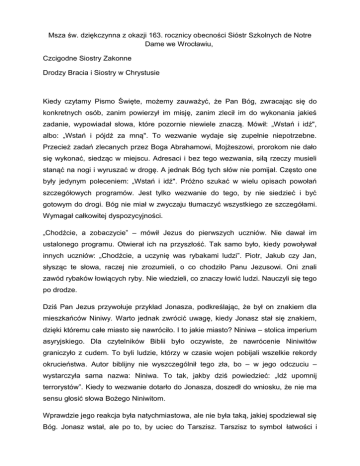 Msza św. dziękczynna z okazji 163. rocznicy obecności Sióstr Szkolnych de Notre Dame we Wrocławiu, Czcigodne Siostry Zakonne Drodzy Bracia i Siostry w Chrystusie Kiedy czytamy Pismo Święte, możemy zauważyć, że Pan Bóg, zwracając się do konkretnych osób, zanim powierzył im misję, zanim zlecił im do wykonania jakieś zadanie, wypowiadał słowa, które pozornie niewiele znaczą. Mówił: „Wstań i idź", albo: „Wstań i pójdź za mną". To wezwanie wydaje się zupełnie niepotrzebne. Przecież zadań zlecanych przez Boga Abrahamowi, Mojżeszowi, prorokom nie dało się wykonać, siedząc w miejscu. Adresaci i bez tego wezwania, siłą rzeczy musieli stanąć na nogi i wyruszać w drogę. A jednak Bóg tych słów nie pomijał. Często one były jedynym poleceniem: „Wstań i idź". Próżno szukać w wielu opisach powołań szczegółowych programów. Jest tylko wezwanie do tego, by nie siedzieć i być gotowym do drogi. Bóg nie miał w zwyczaju tłumaczyć wszystkiego ze szczegółami. Wymagał całkowitej dyspozycyjności. „Chodźcie, a zobaczycie” – mówił Jezus do pierwszych uczniów. Nie dawał im ustalonego programu. Otwierał ich na przyszłość. Tak samo było, kiedy powoływał innych uczniów: „Chodźcie, a uczynię was rybakami ludzi”. Piotr, Jakub czy Jan, słysząc te słowa, raczej nie zrozumieli, o co chodziło Panu Jezusowi. Oni znali zawód rybaków łowiących ryby. Nie wiedzieli, co znaczy łowić ludzi. Nauczyli się tego po drodze. Dziś Pan Jezus przywołuje przykład Jonasza, podkreślając, że był on znakiem dla mieszkańców Niniwy. Warto jednak zwrócić uwagę, kiedy Jonasz stał się znakiem, dzięki któremu całe miasto się nawróciło. I to jakie miasto? Niniwa – stolica imperium asyryjskiego. Dla czytelników Biblii było oczywiste, że nawrócenie Niniwitów graniczyło z cudem. To byli ludzie, którzy w czasie wojen pobijali wszelkie rekordy okrucieństwa. Autor biblijny nie wyszczególnił tego zła, bo – w jego odczuciu – wystarczyła sama nazwa: Niniwa. To tak, jakby dziś powiedzieć: „Idź upomnij terrorystów”. Kiedy to wezwanie dotarło do Jonasza, doszedł do wniosku, że nie ma sensu głosić słowa Bożego Niniwitom. Wprawdzie jego reakcja była natychmiastowa, ale nie była taką, jakiej spodziewał się Bóg. Jonasz wstał, ale po to, by uciec do Tarszisz. Tarszisz to symbol łatwości i wygody. Wybrać Tarszisz, to znaczy robić coś innego niż wymaga nasze powołanie. To może oznaczać miejsce, które daje zadowolenie, w przeciwieństwie do Niniwy. Ona symbolizuje zadanie, którego nie chcemy spełnić, osoby, które wolelibyśmy unikać, miejsca, do których nie chcemy pójść. Pójść do Niniwy to iść ku temu, czego się boimy, co może budzić w nas niechęć. Bóg często woła nas w inne miejsce niż to, które lubimy i znamy. Daje zadanie, którego może nigdy nie robiliśmy, i do którego może czujemy się nieprzygotowani. Ale tylko człowiek, który wypełnia Bożą wolę i idzie tam, gdzie Bóg go posyła, może być znakiem. Do momentu, kiedy sami wybieramy sobie miejsca czy zadania, nie będziemy znakiem dla nikogo. Jonasz stał się znakiem dla mieszkańców Niniwy dopiero wtedy, gdy zrozumiał, że to nie on wybiera miejsce, gdzie ma pełnić swoją misję, nie on wybiera dla siebie zadania. Bo w takim momencie człowiek może popaść w ospałość i robić tylko to, co lubi i co sprawia mu przyjemność. Rozumiały to doskonale bł. Maria Teresa od Jezusa, założycielka Sióstr Szkolnych de Notre Dame, i św. Jadwiga, którą także dziś wspominamy. Ma to swoje uzasadnienie, ponieważ historia zgromadzenia została w ciekawy sposób połączona z osobą patronki Śląska. Wrocławski klasztor, w którym siostry zamieszkały 163 lata temu, powstał na terenie dawnego zamku Piastów wrocławskich. Dziś już można podziwiać pozostałości tego zamku z komnatą św. Jadwigi, gdzie, jak głosi legenda, siadała ona przy oknie, rozdając ubogim chleb. Znamienne jest także to, że pierwsze pięć sióstr de Notre Dame przyjechało do Wrocławia 15 października, a więc dzień przed liturgicznym wspomnieniem Świętej. Oddajemy cześć bł. Marii Teresie i św. Jadwidze nie dlatego, że angażowały się w pomoc innym, że dostrzegały potrzebujących wokół siebie. Oddajemy im cześć, bo w tym, co robiły, stały się podobne do Jezusa, wypełniając do końca Bożą wolę. To jest zadanie, które Jezus postawił swoim uczniom. Owszem wzywał ich do unikania grzechu, do czynienia dobra w imię miłości. Sam czynił dobro, ale wyraźnie wskazywał, że nie możemy się na tym zatrzymać. Trzeba iść dalej i dawać świadectwo prawdzie. Każdemu z nas, a szczególnie osobom powołanym do życia zakonnego czy kapłaństwa, Jezus może powiedzieć: Nie po to cię wybrałem, abyś wykonywał takie czy inne zajęcie. Nie po to cię wybrałem, abyś stała przy kuchni, nie po to cię wybrałem, abyś był kierowcą, abyś mył podłogę, pisał artykuły. To wszystko mogłeś czynić jako osoba świecka. Wybrałem cię po to, byś dała (dał) świadectwo prawdzie, aby ludzie, którzy się z tobą spotkają, wszystko jedno w którym miejscu, rozpoznali prawdę, aby Twoje życie, Twoje postępowanie prowokowało do postawienia pytania o źródło i pozwoliło świadczyć o Bogu. Jezus wypełnił to zadanie, pozostając całkowicie posłuszny Ojcu. To jest droga do świętości. W czasach św. Jadwigi wielu fundowało kościoły, wielu pomagało biednym, jednak niewielu zostało wyniesionych na ołtarze. W naszych czasach także wielu prowadzi szkoły, szpitale, domy dla osób starszych i chorych. To jednak automatycznie nie otwiera drogi do świętości. Świętość to przede wszystkim stać się podobnym do Jezusa w Jego posłusznym wypełnianiu woli Ojca. Błogosławiona Maria Teresa wyraziła to pięknym stwierdzeniem: „Co Bóg chce, jak Bóg chce, ponieważ Bóg chce, 