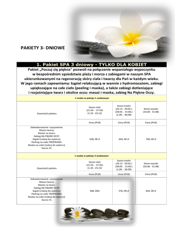 PAKIETY 3- DNIOWE 1. Pakiet SPA 3 dniowy - TYLKO DLA KOBIET Pakiet „Poczuj się piękna" pozwoli na połączenie wspaniałego wypoczynku w bezpośrednim sąsiedztwie plaży i morza z zabiegami w naszym SPA ukierunkowanymi na regenerację skóry ciała i twarzy dla Pań w każdym wieku. W jego ramach zapewniamy: kąpiel relaksującą w wannie z hydromasażem, zabiegi upiększające na całe ciało (peeling i maska), a także zabiegi dotleniające i rozjaśniające twarz i okolice oczu: masaż i maska, zabieg Na Piękne Oczy. 1 osoba w pokoju 1 osobowym Zawartość pakietu Zakwaterowanie i wyżywienie. Masaż twarzy. Maska na twarz. Zabieg NA PIĘKNE OCZY. Kąpiel (rodzaj do wyboru). Peeling na ciało TROPIKANA. Maska na ciało (rodzaj do wyboru). Sauna 1h. Sezon niski (21.02. - 27.03) (1.10 - 23.12) Sezon średni (24.12 - 20.02.) (28.03. - 15.06.) (1.09. - 30.09) Sezon wysoki (16.06 - 31.08) Cena (PLN) Cena (PLN) Cena (PLN) 638, 00 zł 644, 00 zł 760, 00 zł Sezon niski (21.02. - 27.03) (1.10 - 23.12) Sezon średni (24.12 - 20.02.) (28.03. - 15.06.) (1.09. - 30.09) Sezon wysoki (16.06 - 31.08) Cena (PLN) Cena (PLN) Cena (PLN) 568, 00zł 576, 00 zł 644, 00 zł 1 osoba w pokoju 2 osobowym Zawartość pakietu Zakwaterowanie i wyżywienie. Masaż twarzy. Maska na twarz. Zabieg NA PIĘKNE OCZY. Kąpiel (rodzaj do wyboru). Peeling na ciało TROPIKANA. Maska na ciało (rodzaj do wyboru). Sauna 1h. 2. Pakiet SPA 3 dniowy - TYLKO DLA MĘŻCZYZN Pakiet „Tylko dla mężczyzn" pozwoli Panom w każdym wieku i niezależnie od profesji na połączenie wspaniałego pobytu w bezpośrednim sąsiedztwie plaży i morza z zabiegami w naszym SPA ukierunkowanymi na przywrócenie skórze ciała świeżości i sprężystości. W jego ramach zapewniamy: kąpiel relaksującą w wannie z hydromasażem, odprężający masaż całego ciała z wybraną oliwką, a także zabieg kompleksowy na twarz dedykowany specjalnie Panom: EXTREMALE MEN. Nie zapominamy też o stopach: zabieg „go soft" pozbawi je wszelkich zgrubień i nierówności. 1 osoba w pokoju 1 osobowym Zawartość pakietu Zakwaterowanie i wyżywienie. Kąpiel (rodzaj do wyboru). Zabieg na twarz EXTREMALE MEN. Zabieg GO SOFT. Masaż relaksacyjny całego ciała. Sauna 1h. Sezon niski (21.02. - 27.03) (1.10 - 23.12) Sezon średni (24.12 - 20.02.) (28.03. - 15.06.) (1.09. - 30.09) Sezon wysoki (16.06 - 31.08) Cena (PLN) Cena (PLN) Cena (PLN) 628, 00 zł 634, 00 zł 750, 00 zł Sezon niski (21.02. - 27.03) (1.10 - 23.12) Sezon średni (24.12 - 20.02.) (28.03. - 15.06.) (1.09. - 30.09) Sezon wysoki (16.06 - 31.08) Cena (PLN) Cena (PLN) Cena (PLN) 1 osoba w pokoju 2 osobowym Zawartość pakietu Zakwaterowanie i wyżywienie. Kąpiel (rodzaj do wyboru). Zabieg na twarz EXTREMALE MEN. Zabieg GO SOFT. Masaż relaksacyjny całego ciała. Sauna 1h. 566, 00 zł 548, 00 zł 634, 00 zł 3. Pakiet SPA 3 dniowy- RELAKS DLA DWOJGA Pakiet „Relaks dla dwojga" pozwoli Parom w każdym wieku na połączenie romantycznego pobytu w bezpośrednim sąsiedztwie plaży i morza z zabiegami w naszym SPA, które są tak dobrane, aby w przyjemny, relaksujący sposób pozbyć się oznak zmęczenia skóry. W jego ramach(wszystkie zabiegi wykonujemy jednorazowo) zapewniamy: KĄPIEL DLA DWOJGA z kolorowym oświetleniem LED i aromaterapią, zabiegi upiększające na całe ciało (peeling i maska) oraz HOT STONE - masaż częściowy z wykorzystaniem gorących kamieni, a także zabiegi dotleniające i rozjaśniające twarz: masaż i maska. Natomiast specjalnie dedykowany dla Pana - EXTREMALE MEN - kompleksowy zabieg na twarz i szyję, intensywnie nawilży i odświeży te partie ciała. 2 osoby w pokoju 2 osobowym Zawartość pakietu Zakwaterowanie i wyżywienie. Peeling na ciało. Maska na ciało. Masaż twarzy. Maska na twarz. Zabieg na twarz EXTREMALE MEN. Masaż częściowy kamieniami HOT STONE. Kąpiel dla dwojga. Sauna 1h. Sezon niski (21.02. - 27.03) (1.10 - 23.12) Sezon średni (24.12 - 20.02.) (28.03. - 15.06.) (1.09. - 30.09) Sezon wysoki (16.06 - 31.08) Cena (PLN) Cena (PLN) Cena (PLN) 956, 00 zł 992, 00 zł 1 128, 00 zł