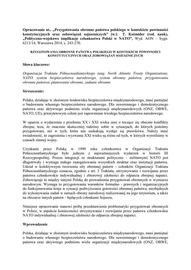 Opracowanie nt.. „Przygotowania obronne państwa polskiego w kontekście powinności konstytucyjnych oraz zobowiązań sojuszniczych” [w:] T. Kośmider (red. nauk), „Polityczno-wojskowe implikacje członkostwa Polski w NATO”, Wyd. AON – Sygn. 6213/14, Warszawa 2014, s. 243-270. RZYGOTOWANIA OBRONNE PAŃSTWA POLSKIEGO W KONTEKŚCIE POWINNOŚCI KONSTYTUCYJNYCH ORAZ ZOBOWIĄZAŃ SOJUSZNICZYCH Słowa kluczowe: Organizacja Traktatu Północnoatlantyckiego (ang. North Atlantic Treaty Organization), NATO; system bezpieczeństwa narodowego, system obronny państwa, przygotowania obronne państwa, planowanie obronne, zadanie obronne Streszczenie: Polska, działając w złożonym środowisku bezpieczeństwa międzynarodowego, musi pamiętać o budowaniu własnego bezpieczeństwa narodowego. Dla suwerennego i demokratycznego państwa oraz aktywnego podmiotu wielu organizacji międzynarodowych (ONZ, OBWE, NATO, UE), priorytetowym celem jest zapewnienie trwałego bezpieczeństwa narodowego. W oparciu o wydarzenia z przełomu XX i XXI wieku oraz o toczące się obecnie konflikty zbrojne, teza, że znacznie skuteczniej radzimy sobie w sytuacjach, do których jesteśmy przygotowani, niż w tych, które nas zaskakują wydaje się prawdziwa. Należy mieć świadomość, że zagrożenia i wyzwania XXI wieku są różne od tych, w których wyrośliśmy w czasach zimnej wojny. Uzyskanie przez Polskę w 1999 roku członkostwa w Organizacji Traktatu Północnoatlantyckiego było jednym z najważniejszych wydarzeń w historii III Rzeczypospolitej. Proces integracji ze strukturami polityczno – militarnymi NATO jest długotrwały i wymaga stałego zaangażowania wszystkich struktur oraz instytucji państwa. Udział w kolektywnym tworzeniu siły obronnej państw - członków Organizacji Traktatu Północnoatlantyckiego oznacza, zgodnie z art. 3 Traktatu, utrzymywanie i rozwijanie przez państwa członkowskie indywidualnej i zbiorowej zdolności do odparcia zbrojnej napaści. Zobowiązuje to między innymi Polskę do prowadzenia przygotowań obronnych w wymiarze narodowym. Wymaga to przygotowania warunków formalno - prawnych i organizacyjnych do funkcjonowania kraju w sytuacji podwyższania gotowości obronnej państwa, niezbędnych do wykonywania zadań w ramach obrony narodowej realizowanej na jego terytorium, a także na obszarze innych państw - będących członkami Sojuszu. Niniejsze opracowanie stanowi próbę przedstawienia problematyki przygotowań obronnych w Polsce, w aspekcie konieczności utrzymywania i rozwijania przez państwa członkowskie NATO indywidualnej i zbiorowej zdolności do odparcia zbrojnej napaści. Wprowadzenie Polska, działając w złożonym środowisku bezpieczeństwa międzynarodowego, musi pamiętać o budowaniu własnego bezpieczeństwa narodowego. Dla suwerennego i demokratycznego państwa oraz aktywnego podmiotu wielu organizacji międzynarodowych (ONZ, OBWE, NATO, UE), priorytetowym celem jest zapewnienie trwałego bezpieczeństwa narodowego. Jest to szczególnie ważne z uwagi na geostrategiczne znaczenie Polski dla bezpieczeństwa międzynarodowego oraz bolesne doświadczenia historyczne. Należy podkreślić, że „dla narodu polskiego, który w okresie minionych czterech wieków doznał bezmiaru tragedii wojen, powstań, niewoli i okupacji, zapewnienie trwałego bezpieczeństwa narodowego jest nie tylko warunkiem przetrwania, ale także dziejową szansą dla nadrobienia opóźnienia gospodarczego i kulturalnego w stosunku do poziomu cywilizacyjnego wspólnoty Unii Europejskiej” . W oparciu o wydarzenia z przełomu XX i XXI wieku oraz o toczące się obecnie konflikty zbrojne, prawdziwa jest teza, że znacznie skuteczniej radzimy sobie w sytuacjach, do których jesteśmy przygotowani, niż w tych, które nas zaskakują. Należy mieć świadomość, że „zagrożenia i wyzwania XXI wieku są różne od tych, w których wyrośliśmy w czasach zimnej wojny. Wówczas polityka była zamrożona, a sfera obronności statyczna. Zagrożeniom obronności można było stawić czoła w sposób obronny. Dzisiejszy świat już tak nie działa. Działalność polityczna, gospodarcza i militarna muszą zostać zintegrowane. Terroryści, upadające reżimy, broń masowego rażenia – to w równej mierze wyzwania polityczne, co militarne. Obrona ojczyzny zaczyna się za granicą, a troszczyć się o bezpieczeństwo trzeba zawsze, we własnym sercu i umyśle (…) Granice pomiędzy bezpieczeństwem wewnętrznym i zewnętrznym, policją i wojskiem, zapobieganie kryzysom oraz ich rozwiązywaniem, walka z kryminalną i finansową przestępczością, tropienie terroryzmu i radzenie sobie z upadającymi reżimami stają się sztuczne i niewyraźne” . Akcesja Polski do NATO nie zakończyła procesu integracji z jego strukturami polityczno militarnymi, gdyż jest to proces długotrwały i wymaga stałego zaangażowania wszystkich struktur oraz instytucji państwa. Udział w kolektywnym tworzeniu siły obronnej państw członków Organizacji Traktatu Północnoatlantyckiego oznacza, zgodnie z art. 3 Traktatu, utrzymywanie i rozwijanie przez państwa członkowskie indywidualnej i zbiorowej zdolności do odparcia zbrojnej napaści. Zobowiązuje to między innymi Polskę do prowadzenia przygotowań obronnych w wymiarze narodowym. Wymaga to przygotowania warunków formalno - prawnych i organizacyjnych do funkcjonowania kraju w sytuacji podwyższania gotowości obronnej państwa, niezbędnych do wykonywania zadań w ramach obrony narodowej realizowanej na jego terytorium, a także na obszarze innych państw - będących członkami Sojuszu. Podkreślenia wymaga również konieczność implementowania dorobku prawnego Organizacji Traktatu Północnoatlantyckiego w obszarze spraw dotyczących m. in. zasad pobytu wojsk obcych na terytorium innego państwa czy też planowania obronnego, w sposób zgodny z zasadami i procedurami przyjętymi w Sojuszu. Zaprezentowane w niniejszym opracowaniu t