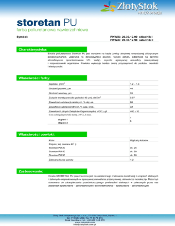 PKWiU: 20.30.12.90 składnik I PKWiU: 20.30.12.90 składnik II Symbol: Charakterystyka: Emalia poliuretanowa Storetan Pu jest wyrobem na bazie żywicy akrylowej utwardzanej alifatycznym poliizocyjanianem. Zapewnia to dekoracyjność powłoki, wysoki połysk, odporność na czynniki atmosferyczne (promieniowanie UV, wodę), czynniki agresywnej atmosfery przemysłowej i rozpuszczalniki organiczne. Powłoka wykazuje bardzo dobrą przyczepność do podłoża, twardość i elastyczność. Właściwości farby: Gęstość, g/cm3 1,2 – 1,3 Grubość powłoki, µm 40 Grubość warstwy, µm 70 Zużycie teoretyczne (dla grubości 40 m), dm /m 3 2 0.07 Zawartość substancji nielotnych, % obj. ok. 60 Zawartość substancji lotnych, % wag. śred.. 32 Zawartość Lotnych Związków Organicznych ( VOC ), g/l 400 10 Czas schnięcia powłoki (temp. 20°C), h max. 1 8 stopień 1 stopień 3 Właściwości powłoki: Wg karty kolorów Kolor º Połysk ( kąt pomiaru 60 ): Storetan PU 20 ok. 25 Storetan PU 50 ok. 50 Storetan PU 90 ok. 90 Zalecana liczba warstw 1-2 Zastosowanie: Emalia STORETAN PU przeznaczona jest do ostatecznego malowania konstrukcji i urządzeń stalowych i żeliwnych eksploatowanych w agresywnej atmosferze przemysłowej, atmosferze morskiej itp. Może być stosowana do zabezpieczania przeciwkorozyjnego powierzchni stalowych w polecanych przez nas zestawach epoksydowo – poliuretanowych i etylokrzemianowo – epoksydowo – poliuretanowych. Sposób stosowania: 1. PRZYGOTOWANIE PODŁOŻA: Powłoka farby epoksydowej (Stonox FOS, Stonox MIO), sucha, pozbawiona śladów tłuszczu, kurzu i innych zanieczyszczeń. 2. PRZYGOTOWANIE FARBY: Składnik I farby dokładnie wymieszać, a następnie zmieszać ze składnikiem II w proporcji: 100:16 wagowo, czyli 100:20 objętościowo. Mieszaninę pozostawić na około 15 minut. Po tym czasie farba nadaje się do użycia. W zależności od techniki malowania można ją rozcieńczyć do lepkości roboczej rozcieńczalnikiem do emalii poliuretanowej Storetan PU (prod. Złoty Stok Antykorozja Sp. z o. o. w Złotym Stoku), dodając od 5 – 15 % obj rozcieńczalnika. Czas przydatności mieszaniny składników do stosowania (w 20ºC) – 8 h. 3. METODA NAKŁADANIA: natrysk pneumatyczny, natrysk hydrodynamiczny, pędzel. Zalecane parametry natrysku: kąt natrysku, °: - 65-80 średnica dyszy, mm - 0.38-0.43 ciśnienie zasilające, kPa - 500-700 przełożenie aparatu - 45:1 4. WARUNKI PODCZAS MALOWANIA Minimalna temperatura podłoża, °C 5 Temperatura podłoża co najmniej 3 °C wyższa od punktu rosy. Wilgotność względna powietrza w czasie malowania, max 80% Minimalna temperatura otoczenia podczas utwardzania powłoki, ºC 10 Czas do nałożenia kolejnych warstw: najkrótszy, h - 8 Podane czasy dotyczą powłoki jednowarstwowej o zalecanej grubości, schnącej w warunkach dobrej wentylacji w temperaturze 20ºC i wilgotności względnej 65%. Czasy te mogą ulec zmianie wraz ze zmianą temperatury, warunków wentylacji, ilości warstw i grubości pokrycia. Najkrótszy czas od wymalowania do eksploatacji powłoki - 7 dni Mycie narzędzi po malowaniu: rozcieńczalnik do emalii poliuretanowej Storetan PU (prod. Złoty Stok Antykorozja Sp. z o. o. w Złotym Stoku). Okres gwarancji: Składnik I - 9 miesięcy od daty produkcji Składnik II - 6 miesięcy od daty produkcji Wskazówki bhp i przeciwpożarowe: Ze względu na obecność w farbie rozpuszczalników organicznych prace należy prowadzić w pomieszczeniach dobrze wentylowanych. Należy przestrzegać ogólnych zasad i przepisów BHP i przeciwpożarowych. UWAGA: farba zawiera szkodliwe rozpuszczalniki a składnik II - poliizocyjaniany. Pomieszczenia zamknięte w których stosowano Storetan Pu w trakcie prac malarskich i po ich zakończeniu należy intensywnie wietrzyć, a po zaniku specyficznego zapachu można oddać do użytku. Magazynowanie: W pomieszczeniach dobrze wentylowanych, z dala od źródeł zapłonu. W oryginalnych, szczelnie zamkniętych opakowaniach producenta. Opakowania: Pojemniki blaszane o pojemności 15l, tak że na jedno opakowanie 15l składnika I przypada jedno opakowanie 2,5l składnika II z zachowaniem stosunku mieszania. Wszystkie informacje i zalecenia oparte są na naszym doświadczeniu i posiadanej wiedzy. Wrzesień 2009 r.