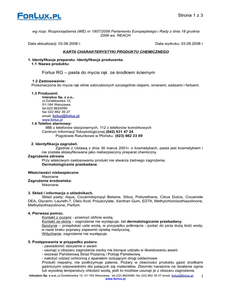 Strona 1 z 3 wg rozp. Rozporządzenia (WE) nr 1907/2006 Parlamentu Europejskiego i Rady z dnia 18 grudnia 2006 ws. REACH Data aktualizacji: 03.08.2008 r. Data wydruku: 03.08.2008 r KARTA CHARAKTERYSTYKI PRODUKTU CHEMICZNEGO 1. Identyfikacja preparatu. Identyfikacja producenta. 1.1 Nazwa produktu: Forlux RG – pasta do mycia rąk ze środkiem ściernym 1.2 Zastosowanie: Przeznaczona do mycia rąk silnie zabrudzonych szczególnie olejami, smarami, sadzami i farbami. 1.3 Producent: Interplus Sp. z o.o., ul.Działdowska 12, 01-184 Warszawa, tel.022 8624090 fax 022 862 39 27 email: [email protected] www.forlux.pl 1.4 Telefon alarmowy: 988 z telefonów stacjonarnych, 112 z telefonów komórkowych Centrum Informacji Toksykologicznej (042) 631 47 24 Pogotowie Ratunkowe w Płońsku (023) 662 23 09 2. Identyfikacja zagrożeń. Zgodnie z Ustawą z dnia 30 marca 2001r. o kosmetykach, pasta jest kosmetykiem i nie została sklasyfikowana jako niebezpieczny preparat chemiczny. Zagrożenia zdrowia Przy właściwym zastosowaniu produkt nie stwarza żadnego zagrożenia. Dermatologicznie przebadane. Właściwości niebezpieczne: Nieznane Zagrożenia środowiska: Nieznane. 3. Skład i informacja o składnikach. Skład pasty: Aqua, Cocamidopropyl Betaine, Silica, Poliurethane, Citrus Dulcis, Cocamide DEA, Glycerin, Laureth-7, Oleic Acid, Polyacrylate, Xanthan Gum, EDTA, Methylchloroisothiazolinone, Methylisothiazolinone, Parfum. 4. Pierwsza pomoc. Kontakt z oczami - przemyć obficie wodą; Kontakt ze skórą – zagrożenie nie występuje, żel dermatologicznie przebadany; Spożycie – przepłukać usta wodą, w przypadku połknięcia - podać do picia dużą ilość wody, w razie braku poprawy zapewnić opiekę medyczną; Wdychanie: zagrożenie nie występuje. 5. Postępowania w przypadku pożaru. - zawiadomić otoczenie o awarii - usunąć z obszaru zagrożenia osoby nie biorące udziału w likwidowaniu awarii - wezwać Państwową Straż Pożarną i Policję Państwową - nałożyć odzież ochronną z aparatem izolującym drogi oddechowe Produkt niepalny, nie podtrzymuje palenia. Pożary w obecności produktu gasić środkami gaśniczymi odpowiednimi dla palących się materiałów. Zbiorniki narażone na działanie ognia lub wysokiej temperatury chłodzić wodą, jeśli to możliwe usunąć je z obszaru zagrożenia. Interplus Sp. z o.o.,ul.Działdowska 12, 01-184 Warszawa, tel.(22) 8624090, fax (22) 862 39 27 email: [email protected], www.forlux.pl 1 Strona 2 z 3 Środki gaśnicze: rozpylona woda, piany, proszki gaśnicze, dwutlenek węgla. 6. Postępowanie w przypadku niezamierzonego uwolnienia do środowiska. Środki ochrony osobistej: Ochrona rąk: nie wymagane Ochrona oczu: nie wymagane Ochrona skóry: fartuch ochronny Ochrona techniczna magazynu: zadaszenie i ogrzewanie Postępowanie przy wycieku: Zabezpieczyć wyciek. Zebrać żel w pojemniki, a zanieczyszczoną powierzchnię spłukać wodą. 7. Postępowanie z preparatem i jego magazynowanie. Magazynowanie: - przechowywać w zamkniętych opakowaniach, w suchych pomieszczeniach. Postępowanie z preparatem: Nie są konieczne żadne szczególne środki ostrożności 8. Kontrola narażenia i środki ochrony indywidualnej. Stosowane środki ochrony osobistej powinny spełniać wymogi Rozporządzenia Ministra Gospodarki z dnia 21 grudnia 2005 r. w sprawie zasadniczych wymagań dla środków ochrony indywidualnej (Dz.U. Nr 259, poz. 2173). Ochrona rąk: nie wymagane Ochrona oczu: nie wymagane Inne: ubranie robocze Ochrona techniczna magazynu: zadaszenie i ogrzewanie Kontrola zagrożenia: najwyższe dopuszczalne stężenia NDS, NDSCh – nie oznaczono 9. Właściwości fizykochemiczne. Postać: żel z zawieszonymi drobinami ściernymi Kolor: jasnożółty do jasnobeżowego z wtrąceniami koloru czerwonego i żółtego Zapach: przyjemny, charakterystyczny dla użytej kompozycji pH: 6,0 Temperatura zapłonu: nie dotyczy Rozpuszczalność w wodzie: dobra, z wyłączeniem drobin ściernych 10. Stabilność i reaktywność. Produkt stabilny w warunkach normalnych. Dobrze rozpuszcza się w wodzie. Niebezpieczne produkty rozkładu nie są znane przy właściwym zastosowaniu. 11. Informacje toksykologiczne. Drogi przenikania: połknięcie, kontakt ze skórą i oczami Działanie: - oczy – brak działania drażniącego; - skóra – brak działania drażniącego i uczulającego; dermatologicznie przebadane - układ pokarmowy – podrażniające w przypadku spożycia - układ oddechowy – brak szkodliwego działania 12. Informacje ekologiczne. Środki powierzchniowo czynne zawarte w tym preparacie spełniają kryteria biodegradowalności zgodnie z Rozporządzeniem WE/648/2004 w sprawie detergentów. 13. Postępowanie z odpadami. Produkt i opakowanie usunąć zgodnie z lokalnie obowiązującymi przepisami i regulacjami ochrony środowiska. Opakowanie jednorazowego użytku przekazać do upoważnionego odbiorcy odpadów. Opakowanie wielorazowego użytku, jeśli to konieczne po uprzednim oczyszczeniu, może być powtórnie zastosowane. 14. Informacje o transporcie. Interplus Sp. z o.o.,ul.Działdowska 12, 01-184 Warszawa, tel.(22) 8624090, fax (22) 862 39 27 email: [email protected], www.forlux.pl 2 Strona 3 z 3 Materiał bezpieczny w rozumieniu przepisów RID i ADR. Grupa pakowania: bez ograniczeń Numer UN: Numer rozpoznawczy zagrożenia: Nalepka ostrzegawcza: nie dotyczy 15. Informacje dotyczące uregulowań prawnych. 1. 2. 3. 4. 5. 6. 7. 8. 9. 10. 11. Rozporządzenie MZiOS, Dz.U. 11 poz. z dn. 11 stycznia 2001r. „O substancjach i preparatach chemicznych” (z późn. zmianami). Rozporządzenie MZ: Dz.U. Nr 171, poz. 1666 z 2 września 2003r. w sprawie kryteriów i sposobu klasyfikacji substancji i preparatów chemicznych Rozporządzenie MZ: Dz.U. Nr 128, poz.1348 z dn. 30 kwietnia 2004 r. w sprawie substancji niebezpiecznych i preparatów niebezpiecznych, których opakowania zaopatruje się w zamknięcia utrudniające otwarcie przez dzieci i wyczuwalne dotyk