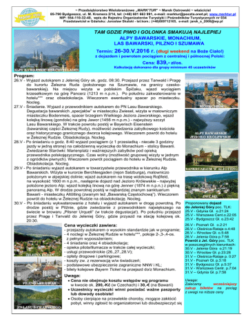 ~ Przedsiębiorstwo Wielobranżowe „MARK’TUR” ~ Marek Ostrowski ~ właściciel 85-790 Bydgoszcz, ul. M. Kromera 2/14, tel: (+48) 601 663 991, e-mail: [email protected]; www.marktur.pl NIP: 554-110-32-40, wpis do Rejestru Organizatorów Turystyki i Pośredników Turystycznych nr 034 Przedstawiciel w Gdańsku: Jarosław Skalski - tel.kom.: (+48)609712165, e-mail: [email protected] TAM GDZIE PIWO I GOLONKA SMAKUJĄ NAJLEPIEJ ALPY BAWARSKIE, MONACHIUM, LAS BAWARSKI, PILZNO I SZUMAWA Termin: 26-30.V.2016 r. (długi weekend na Boże Ciało!) z dojazdem i powrotem pociągiem z centralnej i północnej Polski: Cena: 839,- zł/os. Kalkulację dokonano dla grupy minimum 45 uczestników Program: 26.V - Wyjazd autokarem z Jeleniej Góry ok. godz. 08:30. Przejazd przez Tanwald i Pragę do kurortu Železna Ruda (położonego na Szumawie, na granicy czeskobawarskiej). Na miejscu wizyta w pobliskim Špičaku, wjazd wyciągiem krzesełkowym na górę Pancerz (1213 m n.p.m.). Po południu zakwaterowanie w hotelu*** oraz obiadokolacja. Wieczorem ewentualny spacer po miasteczku. Nocleg. 27.V - Śniadanie. Wyjazd z przewodnikiem autokarem do PN Lasu Bawarskiego. Degustacja bawarskich „specjałów” w miasteczku Zwiesel, wizyta w malowniczym miasteczku Bodenmeis, spacer brzegiem Wielkiego Jeziora Jaworskiego, wjazd kolejką linową (gondole) na górę Jawor (1456 m n.p.m.) - najwyższy szczyt Lasu Bawarskiego. W trakcie powrotu postój w Bayerisch Eisenstein (bawarskiej części Železnej Rudy), możliwość zwiedzenia zabytkowego kościoła oraz historycznego granicznego dworca kolejowego. Wieczorem powrót do hotelu w Železnej Rudzie. Obiadokolacja. Nocleg. 28.V - Po śniadaniu o godz. 8:40 wyjazd pociągiem (z 1 przesiadką - niecałe 3 godziny jazdy w jedną stronę) na całodzienną wycieczkę do Monachium - stolicy Bawarii. Zwiedzanie Starówki: Marienplatz i ważniejszych zabytków pod opieką przewodnika polskojęzycznego. Czas wolny (możliwość grupowej wizyty w jednym z ogródków piwnych). Wieczorem powrót pociągiem do hotelu w Železnej Rudzie. Obiadokolacja. Nocleg. 29.V - Po śniadaniu wyjazd autokarem w towarzystwie przewodnika w kierunku Alp Bawarskich. Wizyta w kurorcie Berchtesgaden (rejon Salzburga), malowniczo położonym w alpejskiej dolinie; wjazd autokarem na trasę widokową Roβfeld, na wysokość 1600 m n.p.m., następnie dojazd nad Jezioro Królewskie - najwyżej położone jezioro Alp; wjazd kolejką linową na górę Jenner (1874 m n.p.n.) z piękną panoramą Alp. W drodze powrotnej postój w najbardziej znanym sanktuarium Bawarii - miasteczku Altötting (zwanym też „Bawarską Częstochową”). Wieczorem powrót do hotelu w Železnej Rudzie na obiadokolację. Nocleg. 30.V - Po śniadaniu wykwaterowanie z hotelu i wyjazd autokarem w drogę powrotną. Po drodze postój w Pilźnie, gdzie zwiedzanie z przewodnikiem największego na świecie w browaru „Pilsner Urquell” (w trakcie degustacja!). Po południu przejazd przez Pragę i Tanvald do Jeleniej Góry, gdzie przyazd na stację kolejową ok. 20:30. Cena wycieczki zawiera: - przejazdy autokarem o wysokim standardzie jak w programie; - 4 noclegi w Železnej Rudzie w hotelu***, pokoje 2-,3-,4-os. z pełnym wyposażeniem; - 4 śniadania oraz 4 obiadokolacje; - opieka pilota/tłumacza w trakcie całej wycieczki; - usługi przewodnickie (26.,27.,28.V); - opłaty drogowe i parkingowe; - koszty zw. z rezerwacją w/w świadczeń; - podstawowe ubezpieczenie zagraniczne NNW i KL; - bilety kolejowe Bayern Ticket na przejazd do/z Monachium. Uwaga: Cena nie obejmuje kosztu wstępów wg programu w kwocie ok. 200,-Kč (w Czechach) i 30,-€ (na Bawarii) Uczestnicy wycieczki winni posiadać ważne paszporty lub dowody osobiste! Osoby cierpiące na przewlekle choroby, mogące zakłócić pobyt, winny zgłosić to organizatorowi lub doubezpieczyć się. Proponowany dojazd do Jeleniej Góry poc. TLK: 25.V - Gdynia Gł. o.21:24 25.V - Warszawa Cent.o.22:05 25.V - Bydgoszcz Gł. o.23:42 26.V - Poznań Gł. o.2:21 26.V – Oleśnica-Rataje o.4:48 26.V – Wrocław Gł. o.5:48 26.V - Jelenia Góra p.7:58 Powrót z Jel. Góry poc. TLK w poszczególnych kierunkach: 30.V - Jelenia Góra o.21:19 30.V – Wrocław Gł. p.23:28 31.V – Oleśnica-Rataje p. 0:27 31.V - Poznań Gł. p.3:18 31.V - Bydgoszcz Gł. p.5:37 31.V - Warszawa Centr. p.7:04 31.V – Gdynia Gł. p.7:58 Uwaga: Zalecamy wcześniejszy zakup biletów na pociąg z uwagi na niższe ceny
