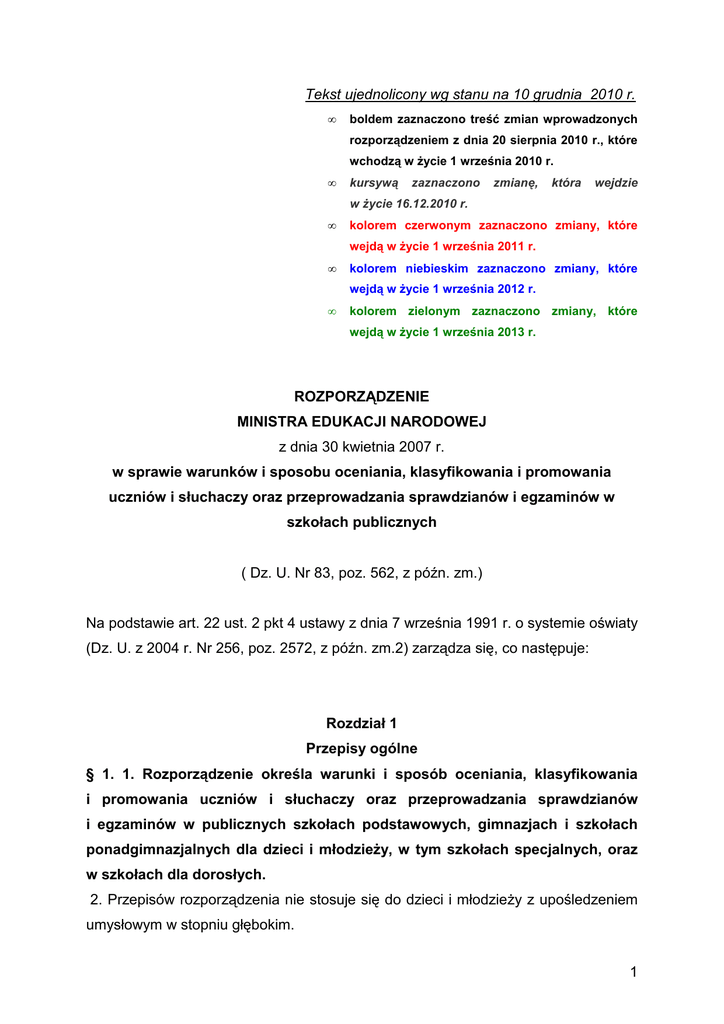 Tekst ujednolicony wg stanu na 10 grudnia 2010 r. • boldem zaznaczono treść zmian wprowadzonych rozporządzeniem z dnia 20 sierpnia 2010 r., które wchodzą w życie 1 września 2010 r. • kursywą zaznaczono zmianę, która wejdzie w życie 16.12.2010 r. • kolorem czerwonym zaznaczono zmiany, które wejdą w życie 1 września 2011 r. • kolorem niebieskim zaznaczono zmiany, które wejdą w życie 1 września 2012 r. • kolorem zielonym zaznaczono zmiany, które wejdą w życie 1 września 2013 r. ROZPORZĄDZENIE MINISTRA EDUKACJI NARODOWEJ z dnia 30 kwietnia 2007 r. w sprawie warunków i sposobu oceniania, klasyfikowania i promowania uczniów i słuchaczy oraz przeprowadzania sprawdzianów i egzaminów w szkołach publicznych ( Dz. U. Nr 83, poz. 562, z późn. zm.) Na podstawie art. 22 ust. 2 pkt 4 ustawy z dnia 7 września 1991 r. o systemie oświaty (Dz. U. z 2004 r. Nr 256, poz. 2572, z późn. zm.2) zarządza się, co następuje: Rozdział 1 Przepisy ogólne § 1. 1. Rozporządzenie określa warunki i sposób oceniania, klasyfikowania i promowania uczniów i słuchaczy oraz przeprowadzania sprawdzianów i egzaminów w publicznych szkołach podstawowych, gimnazjach i szkołach ponadgimnazjalnych dla dzieci i młodzieży, w tym szkołach specjalnych, oraz w szkołach dla dorosłych. 2. Przepisów rozporządzenia nie stosuje się do dzieci i młodzieży z upośledzeniem umysłowym w stopniu głębokim. 1 3. Warunki przeprowadzania sprawdzianów i egzaminów oraz ich formy dla dzieci i młodzieży niepełnosprawnych oraz niedostosowanych społecznie określają odrębne przepisy. 4. Warunki i sposób oceniania, klasyfikowania i promowania uczniów oraz przeprowadzania sprawdzianów i egzaminów w publicznych szkołach i placówkach artystycznych określają odrębne przepisy. 5. Zasady oceniania z religii i etyki określają odrębne przepisy. § 1a. Ilekroć w rozporządzeniu jest mowa o specyficznych trudnościach w uczeniu się należy przez to rozumieć trudności w uczeniu się odnoszące się do uczniów w normie intelektualnej, o właściwej sprawności motorycznej i prawidłowo funkcjonujących systemach sensorycznych, którzy mają trudności w przyswajaniu treści dydaktycznych, wynikające ze specyfiki ich funkcjonowania poznawczo-percepcyjnego. § 1a. Ilekroć w rozporządzeniu jest mowa o specyficznych trudnościach w uczeniu się, należy przez to rozumieć trudności w uczeniu się odnoszące się do uczniów w normie intelektualnej, którzy mają trudności w przyswajaniu treści nauczania, wynikające ze specyfiki ich funkcjonowania percepcyjnomotorycznego i poznawczego, nieuwarunkowane schorzeniami neurologicznymi. Rozdział 2 Ocenianie, klasyfikowanie i promowanie uczniów w szkołach dla dzieci i młodzieży § 2. 1. Ocenianiu podlegają: 1) osiągnięcia edukacyjne ucznia; 2) zachowanie ucznia. 2. Ocenianie osiągnięć edukacyjnych ucznia polega na rozpoznawaniu przez nauczycieli poziomu i postępów w opanowaniu przez ucznia wiadomości i umiejętności w stosunku do wymagań edukacyjnych wynikających z podstawy programowej, określonej w odrębnych przepisach, i realizowanych w szkole programów nauczania uwzględniających tę podstawę. 2 3. Ocenianie zachowania ucznia polega na rozpoznawaniu przez wychowawcę klasy, nauczycieli oraz uczniów danej klasy stopnia respektowania przez ucznia zasad współżycia społecznego i norm etycznych oraz obowiązków ucznia określonych w statucie szkoły. § 3. 1. Ocenianie osiągnięć edukacyjnych i zachowania ucznia odbywa się w ramach oceniania wewnątrzszkolnego. 2. Ocenianie wewnątrzszkolne ma na celu: 1) informowanie ucznia o poziomie jego osiągnięć edukacyjnych i jego zachowaniu oraz o postępach w tym zakresie; 2) udzielanie uczniowi pomocy w samodzielnym planowaniu swojego rozwoju; 3) motywowanie ucznia do dalszych postępów w nauce i zachowaniu; 4) dostarczenie rodzicom (prawnym opiekunom) i nauczycielom informacji o postępach, trudnościach w nauce, zachowaniu oraz specjalnych uzdolnieniach ucznia; 5) umożliwienie nauczycielom doskonalenia organizacji i metod pracy dydaktycznowychowawczej. 3. Ocenianie wewnątrzszkolne obejmuje: 1) formułowanie przez nauczycieli wymagań edukacyjnych niezbędnych do uzyskania poszczególnych śródrocznych i rocznych (semestralnych) ocen klasyfikacyjnych z obowiązkowych i dodatkowych zajęć edukacyjnych; 2) ustalanie kryteriów oceniania zachowania; 3) ocenianie bieżące i ustalanie śródrocznych ocen klasyfikacyjnych z obowiązkowych i dodatkowych zajęć edukacyjnych oraz śródrocznej oceny klasyfikacyjnej zachowania, według skali i w formach przyjętych w danej szkole; 4) przeprowadzanie egzaminów klasyfikacyjnych zgodnie z § 17 ust. 7-14a; 5) ustalanie rocznych (semestralnych) ocen klasyfikacyjnych z obowiązkowych i dodatkowych zajęć edukacyjnych oraz rocznej oceny klasyfikacyjnej zachowania, według skali, o której mowa w § 13 ust. 2 i § 15 ust. 3; 6) ustalanie warunków i trybu uzyskania wyższych niż przewidywane rocznych (semestralnych) ocen klasyfikacyjnych z obowiązkowych i dodatkowych zajęć edukacyjnych oraz rocznej oceny klasyfikacyjnej zachowania; 7) ustalanie warunków i sposobu przekazywania rodzicom (prawnym opiekunom) informacji o postępach i trudnościach ucznia w nauce. 3 4. Szczegółowe warunki i sposób oceniania wewnątrzszkolnego określa statut szkoły, z uwzględnieniem przepisów rozporządzenia. § 4. 1. Nauczyciele na początku każdego roku szkolnego informują uczniów oraz ich rodziców (prawnych opiekunów) o: 1) wymaganiach edukacyjnych niezbędnych do uzyskania poszczególnych śródrocznych i rocznych (semestralnych) ocen klasyfikacyjnych z obowiązkowych i dodatkowych zajęć edukacyjnych, wynikających z realizowanego przez siebie programu nauczania; 2) sposobach sprawdzania osiągnięć edukacyjnych uczniów; 3) warunkach i trybie uzyskania wyższej niż przewidywana rocznej (semestralnej) oceny kla