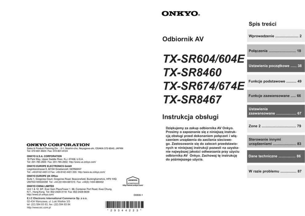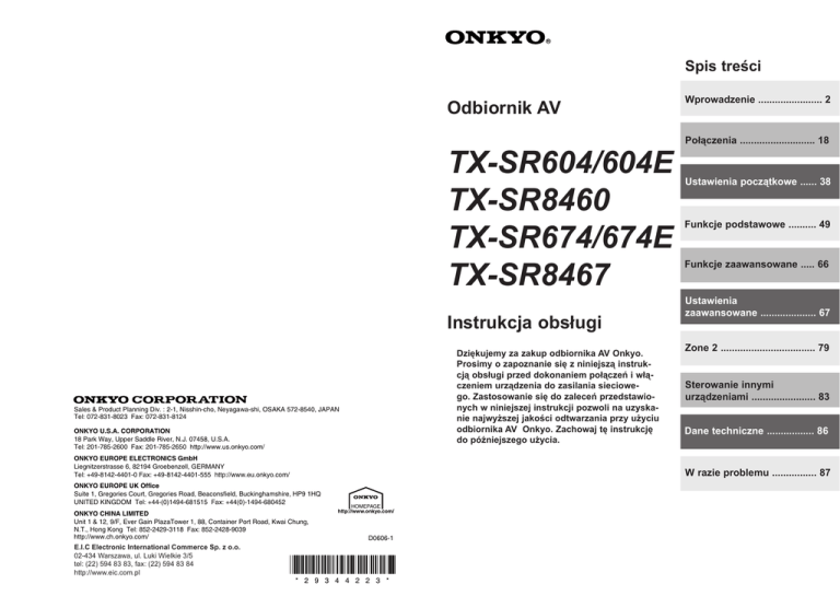 Spis treści Odbiornik AV TX-SR604/604E TX-SR8460 TX-SR674/674E TX-SR8467 Instrukcja obsługi Dziękujemy za zakup odbiornika AV Onkyo. Prosimy o zapoznanie się z niniejszą instrukcją obsługi przed dokonaniem połączeń i włączeniem urządzenia do zasilania sieciowego. Zastosowanie się do zaleceń przedstawionych w niniejszej instrukcji pozwoli na uzyskanie najwyższej jakości odtwarzania przy użyciu odbiornika AV Onkyo. Zachowaj tę instrukcję do późniejszego użycia. ������������������������������������������������������������������������������������� ������������������������������������ ������������������������ ��������������������������������������������������� �������������������������������������������������������������� ����������������������������� ����������������������������������������������� ��������������������������������������������������������������������� ������������������� ������������������������������������������������������������������������������� ������������������������������������������������������� ������������������������ �� Połączenia ........................... 18 Ustawienia początkowe ...... 38 Funkcje podstawowe .......... 49 Funkcje zaawansowane ..... 66 Ustawienia zaawansowane .................... 67 Zone 2 .................................. 79 Sterowanie innymi urządzeniami ....................... 83 Dane techniczne ................. 86 W razie problemu ................ 87 ���������������������� �������������������������������������������������������������������������������� ���������������������������������������������������������������� E.I.C Electronic International Commerce Sp. z o.o. 02-434 Warszawa, ul. Luki Wielkie 3/5 tel: (22) 594 83 83, fax: (22) 594 83 84 http://www.eic.com.pl ���������������������������������������������������������������� Wprowadzenie ....................... 2 �������� ��������������������� ������� ������������������������������������� OSTRZEŻENIE: ABY ZMINIMALIZOWAĆ RYZYKO POŻARU LUB PORAŻENIA PRĄDEM ELEKTRYCZNYM, NIE WYSTAWIAJ URZĄDZENIA NA DESZCZ LUB WILGOĆ. UWAGA: ABY ZMINIMALIZOWAĆ RYZYKO PORAŻENIA PRĄDEM ELEKTRYCZNYM NIE ZDEJMUJ POKRYWY URZĄDZENIA. WEWNĄTRZ URZĄDZENIA NIE ZNAJDUJĄ SIĘ ŻADNE ELEMENTY, KTÓRE MOGŁYBY BYĆ REGULOWANE PRZEZ UŻYTKOWNIKA. ������� ���������������������� ����������� ���� Notatki ������������������������� ������������� Symbol błyskawicy w równoramiennym trójkącie ostrzega użytkownika o istnieniu niebezpiecznego napięcia wewnątrz urządzenia, które może być niebezpieczne w wypadku nieodpowiedniego użytkowania urządzania. Symbol wykrzyknika zawartego w równobocznym trójkącie informuje o istnieniu szczególnie ważnych instrukcji zawartych w piśmiennictwie dołączonym do urządzenia. Ważne informacje dotyczące bezpieczeństwa 1. 2. 3. 4. 5. 6. 7. 8. 9. 10. 11. 12. 13. 14. Przeczytaj instrukcję. Zachowaj instrukcję. Stosuj się do ostrzeżeń. Stosuj się do zaleceń instrukcji. Nie używaj urządzenia w pobliżu wody. Czyść urządzenie jedynie przy użyciu suchej ściereczki Nie blokuj otworów wentylacyjnych. Instaluj w zgodzie z zaleceniami producenta. Nie używaj urządzenia w pobliżu źródeł ciepła, takich jak grzejniki, urządzenia emitujące ciepło (włączając wzmacniacze), itp. Nie rozmontowuj uziemienia wtyku zasilania sieciowego. Wtyk zasilania z uziemieniem wyposażony jest w trzy bolce, bolec uziemienia jest grubszy od bolców zasilania. Jeśli wtyk zasilania nie pasuje do gniazda zasilania sieciowego, skonsultuj się z wykwalifikowanym elektrykiem w przedmiocie wymiany tego wtyku. Chroń przewód zasilania. Nie przygniataj go ani nie skręcaj. Zwróć szczególną uwagę na odcinki przewodu zasilania znajdujące się w pobliżu wtyku zasilania i w miejscu, w którym wychodzi on z urządzenia. Stosuj jedynie przewody połączeń i akcesoria zalecane przez producenta. Urządzenie jak i urządzenie wraz z wózkiem ��������������������� powinno być przemieszczane z zachowaniem należyte