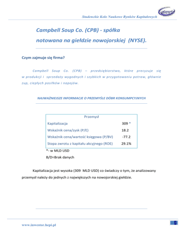 Studenckie Koło Naukowe Rynków Kapitałowych Campbell Soup Co. (CPB) - spółka notowana na giełdzie nowojorskiej (NYSE). Czym zajmuje się firma? Campbell Soup Co. (CPB) – przedsiębiorstwo, które precyzuje się w produkcji i sprzedaży wygodnych i szybkich w przygotowaniu potraw, głównie zup, ciepłych posiłków i napojów. NAJWAŻNIEJSZE INFORMACJE O PRZEMYŚLE DÓBR KONSUMPCYJNYCH Przemysł Kapitalizacja 309 * Wskaźnik cena/zysk (P/E) 18.2 Wskaźnik cena/wartość księgowa (P/BV) -77.2 Stopa zwrotu z kapitału akcyjnego (ROE) 29.1% *- w MLD USD B/D=Brak danych Kapitalizacja jest wysoka (309 MLD USD) co świadczy o tym, że analizowany przemysł należy do jednych z największych na nowojorskiej giełdzie. www.inwestor.hepi.pl 1 Studenckie Koło Naukowe Rynków Kapitałowych NAJWAŻNIEJSZE INFORMACJE O SPÓŁCE Okres 2007 2006 2005 Przychody* 7,343.0 7,072.0 6,660.0 Zysk brutto* 3,075.0 2,897.0 2,758.0 Zysk netto** 766.0 707.0 647.0 Zysk na akcję EPS 1.85 1.71 1.57 Stopa dywidendy 0.72 0.68 0.63 2007 rok Kapitalizacja* 15.25 Wskaźnik cena/zysk (P/E) 20.25 Stopa zwrotu z aktywów (ROA) 11.05% Stopa zwrotu z kapitału akcyjnego 50.91% (ROE) Dochód na akcje 19.111 Kwartalny wzrost przychodów (YOY) 4.30% EBIDA Kwartalny wzrost zysku (YOY) Wskaźnik Beta Roczna stopa zwrotu Data wypłaty dywidendy 1.54 12.20% 0.13 20.20% 30.04.2007 W piątek na giełdzie nowojorskiej akcje Campbell Soup zakończyły dzień na poziomie 39.10 USD, dzięki czemu ich łączna wartość wyniosła 15,25 mld USD. Spółka Campbell Soup jest w dobrej kondycji finansowej, co potwierdza wypracowany przez spółkę zysk netto w wysokości 766 MLN USD. Wzrost zysku netto spółki wykazuje tendencje wzrostową co jest informacją korzystną dla inwestorów. www.inwestor.hepi.pl 2 Studenckie Koło ło Naukowe Rynków Kapitałowych Wskaźnik cena/zysk Spółka Przemysł 20,25 18,2 Następną ważną informacją na którą trzeba zwrócić uwagę jest wartość wskaźnika Beta (0,13), ), którego akcje wykazują dużo mniejszą mniej zmienność w porównaniu z indeksem S&P 100 co oznacza, że Campbell Soup jest walorem defensywnym dla la inwestorów długoterminowych. Jeżeli indeks S&P 100 wzrośnie o 1% to analizowana alizowana spółka wzrośnie o 0,13%. %. Natomiast w sytuacji, gdy indeks S&P 100 spadnie o 1% to Campbell Soup spadnie o 0,13%. Wskaźnik cena/zysk jaki odnotowała spółka (20,25) jest wyższy w porównaniu z średnią dla pozostałych spółek (18,2) ( co jest informacją pozytywną. pozy Wartość wskaźnika ROE dla Campbell Soup (50,91%) jest dużo wyższa niż średnia wartość dla analizowanego przemysłu (29,1%) ( co oznacza, że spółka osiągnęła wyższą stopę zwrotu z kapitału własnego niż średnia dla całego przemysłu co jest informacją bardzo pozytywną. Wnioski: Analizowana spółka charakteryzuje się bardzo dobrymi wskaźnikami co wpływa pozytywnie dla potencjalnych inwestorów długoterminowych. Wypracowany cowany przez spółkę zysk netto, netto wysoki poziom wskaźnika ROE oraz wysoki poziom wskaźnika cena/zysk wpływają korzystnie dla potencjalnych inwestorów. Analizując powyższe dane można stwierdzić, że spółka wpływa pozytywnie dla inwestora długoterminowego. www.inwestor.hepi.pl 3 Studenckie Koło Naukowe Rynków Kapitałowych Zestawienie porównawcze Nazwa spółki CPB GIS HNZ Campbell Soup Company General Mills, Inc. H.J. Heinz Company Akcja której firmy będzie miała szacunkowo największy wzrost ceny? Cena obecna 39.10 59.90 47.11 39.20 59.72 60.91 Zmiana ceny w % 0.24% -0.29% 29.29% Cena na przyszły rok finansowy 42.21 64.26 66.05 Zmiana ceny w % 7.95% 7.28% 40.20% Cena na koniec roku finansowego Jaki poziom przychodów i zysku netto odnotowała spółka w ciągu ostatnich 12-miesięcy? Przychody* 7.59 12.23 8.99 Zysk netto* 783.00** 1.14 611.64** Jaki wzrost przychodów i zysku netto odnotowała spółka? Wzrost przychodów 5.90% 6.00% 5.50% Wzrost zysku netto 5.30% 6.00% 38.20% 18.90 25.70 Jaki jest stosunek ceny akcji do zysku? Wskaźnik cena/zysk (P/E) 20.10 Jak kształtowała się cena akcji w ciągu ostatnich 12-miesięcy? Zmiana ceny w ciągu ostatnich 3miesięcy 2.7% 6.2% 1.1% 7.4% 6.1% 12.1% 22.0% 21.8% 14.7% 1.54 2.64 1.77 1.931 3.157 2.307 Zmiana ceny w ciągu ostatnich 6miesięcy Zmiana ceny w ciągu ostatnich 12- miesięcy EBIDA * Zysk na akcję (EPS) www.inwestor.hepi.pl 4 Studenckie Koło Naukowe Rynków Kapitałowych Pracownicy 24,000 28,100 36,000 Kwartalna stopa wzrostu (YOY) 4.30% 6.20% 5.00% Kapitalizacja * 15.25 20.75 15.30 *= w MLD USD Łączna wartość akcji Campbell Soup wynosi 15,25 mld USD. Pozostałe spółki w powyższym zestawieniu to: przedsiębiorstwo spożywcze - General Mills oraz koncern spożywczy H.J. Heinz Company produkujący: ketchupy i sosy, mrożonki, dania gotowe, karma dla psów i kotów, przetworzone ryby oraz żywność dla niemowląt. W 2007 roku firma komputerowa Campbell Soup zarobiła netto 783 mln USD. Przychody Campbell Soup wyniosły 7,59 mld dolarów i były gorsze od wyniku lidera pod tym względem - przedsiębiorstwo spożywcze - General Mills, które osiągnęło sprzedaż na poziomie 12,23 mld USD. Akcje spółki zyskały w ciągu ostatniego roku 22%. Spółka sukcesywnie poprawia wyniki i konsekwentnie zwiększa swoje zyski. Miniony rok był trzecim z rzędu, w którym firma zwiększyła przychody jak i zysk netto. Wartość wskaźnika informująca inwestorów o wielkości zysku jaki przypada na jedną akcję (EPS) jest najniższą wartością w powyższym zestawieniu, co jest informacją negatywną. Wartość wskaźnika cena/zysk jest średnią wartością w porównaniu z pozostałymi spółkami co wpływa neutralnie dla potencjalnych inwestorów. www.inwestor.hepi.pl 5 Studenckie Koło Naukowe Rynków Kapitałowych Jak wysoki przychód i zysk netto odnotowała spółka w stosunku do średniej wartości dla przemysłu? Przychody i Zysk netto (YOY) Spółka Przemysł Przychod