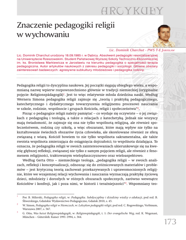 ARTYKUŁY Znaczenie pedagogiki religii w wychowaniu Lic. Dominik Charchut - PWS T-E Jarosł aw Lic. Dominik Charchut urodzony 18.09.1985 r. w Dębicy. Absolwent pedagogiki resocjalizacyjnej na Uniwersytecie Rzeszowskim. Student Państwowej Wyższej Szkoły Techniczno-Ekonomicznej im. ks. Bronisława Markiewicza w Jarosławiu na kierunku pedagogika o specjalności terapia pedagogiczna. Autor artykułów naukowych z zakresu pedagogiki i socjologii. Główne obszary zainteresowań badawczych: agresywne subkultury młodzieżowe i pedagogika rodziny. Pedagogika religii to dyscyplina naukowa. Jej początki sięgają ubiegłego wieku, a wspomnianą nazwę wpierw rozpowszechniono głównie w tradycji niemieckiej (oryginalne pojęcie: Religionspädagogik)1. Jest to więc relatywnie młoda dziedzina nauki. Według Wernera Simona pedagogika religii zajmuje się „teorią i praktyką pedagogicznego, katechetycznego i dydaktycznego towarzyszenia religijnemu procesowi nauczania w szkole, rodzinie, wspólnocie i grupach Kościoła, religii i społeczeństwa”2, Pisząc o pedagogice religii należy pamiętać – co wydaje się oczywiste – o jej związkach z pedagogiką i teologią, a także o relacjach z katechetyką. Jednak nie wszyscy mają świadomość, że zajmuje się ona nie tylko wspólnotą religijną, ale również społeczeństwem, rodziną czy szkołą, a więc obszarami, które mają wpływ nie tylko na kształtowanie świeckich obszarów życia człowieka, ale skorelowane również ze sferą związaną z wiarą. Kościół bowiem to nie tylko wspólnota sakramentalna, ale także swoista wspólnota zmierzająca do osiągnięcia dojrzałości; to wspólnota działająca. To oznacza, że pedagogika religii w swoich zainteresowaniach ukierunkowuje się na kwestię głębszej refleksji, związanej nie tylko z samym pojęciem religii, ale również z fenomenem religijności, traktowanym wielopłaszczyznowo oraz wieloaspektowo. Według Gerta Otto – niemieckiego teologa, „pedagogika religii – w swoich analizach, refleksji i konceptualizacji, odnosząc się do zróżnicowanych materiałów i problemów – jest krytyczną teorią zachowań przekazywanych i uprawomocnionych religijnie, które we wzajemnej relacji wychowania i nauczania wyznaczają praktykę życiową dzieci, młodzieży i dorosłych w różnych obszarach społecznych, zarówno wewnątrz Kościołów i konfesji, jak i poza nimi, w historii i teraźniejszości”3. Wspomniany teo- 1 2 3 Por. B. Milerski, Pedagogika religii, w: Pedagogika. Subdyscypliny i dziedziny wiedzy o edukacji, pod red. B. Śliwerskiego, Gdańskie Wydawnictwo Pedagogiczne, Gdańsk 2010, s. 45. W. Simon, Pedagogika religii w Niemczech, w: Leksykon pedagogiki religii, pod red. C. Rogowskiego, Verbinum, Warszawa 2007, s. 567. G. Otto, Was heisst Religionspädagogik, w: Religionspädagogik, t. 1: Der evangelische Weg, red. K. Wegenast, München – Gütersloh: Kaiser 1991-1994, s. 364. 173 ARTICLES log wyróżnił również cztery główne obszary tematycznych zainteresowań pedagogiki religii. Zaliczył do nich: kształcenie oraz socjalizację z zakresu religii realizowaną w: szkole, rodzinie, społeczeństwie i Kościele. Tak szerokie zainteresowanie dyscypliny sprawia, że jest ona niezbędna w życiu i rozwoju m.in. chrześcijanina. W tym miejscu warto podkreślić, że pedagogika religii zajmuje się nie tylko chrześcijaństwem, ale wspomina również o innych wyznaniach. Niezbędnym wydaje się również to, iż „odróżnianie katechetyki od pedagogiki religii pozwala tworzyć podwaliny pod procesy katechetyczne, procesy „wychowywania do wiary” oraz „wychowania w wierze”. Nie znaczy to jednak, że będą one kolejno po sobie następować: najpierw wychowanie religijne, a później katecheza. Za takim tokiem rozumowania przemawia między innym to, że w rozumieniu Kościoła katolickiego katecheza jest pedagogią w akcie wiary. Do wypełniania jej zadań nie może kierować się ani ideologią, ani interesami czysto ludzkimi. Nie można też mieszać zbawczego działania Boga, które jest czystą łaską, zdziałaniem pedagogicznym człowieka. W końcu nie można ich sobie przeciwstawiać i rozdzielać. Stanowisko takie wynika z tego, że katecheza ma prowadzić do dialogu, jaki Bóg w miłości prowadzi z każdą osobą. W tym znaczeniu katechezę należy uważać za „echo”, które jest przenoszone na dialog z ludźmi prowadzony w duchu wskazań Urzędu Nauczycielskiego Kościoła”4. Nierzadko jednak zdarza się, że pedagogice religii odmawia się naukowości. Jednak jak już na początku XX wieku stwierdził John Dewey – „możliwe jest podejście do kwestii nauczania religijnego z poszanowaniem charakteru nauki, postulujące taki sam rodzaj badań tego zagadnienia, jak to jest w wypadku pozostałych problemów edukacyjnych”5. Według Bogusława Milerskiego „Z perspektywy współczesnej pedagogiki religii można stwierdzić, że owo uświadomienie praktyki wychowania religijnego polega na jej filozoficznym uzasadnieniu, opisaniu, rozumieniu, wyjaśnieniu oraz wykładni ideologiczno-krytycznej, jako określonych procedurach metodologicznych”6. W Polsce kwestią pedagogiki religii szerzej zaczęto interesować się między I i II wojną światową. Zygmunt Bielawski rozważał ją na gruncie tradycji katolickiej, natomiast Karol Branszel – na gruncie tradycji ewangelickiej7. Później – dopiero po 1989 roku szerzej zaczęto posługiwać się mianem pedagogiki religii. PEDAGOGIKA RELIGII JAKO ELEMENT OGÓLNEJ EDUKACJI Pedagogika religii nie sprowadza się wyłącznie do przekazania wiadomości o tradycji czy kulcie religijnym, ale stanowi podstawę wsparcia człowieka w jego rozwoju. Do jej zadań należy kształtowanie i wspieranie rozwoju danej osoby, jej dojrzałości społecznej i religijnej. Obejmuje ona zarówno procesy nauczania, jak również wychowania, co sprawia, że odnosi się do ogółu oddziaływań mając