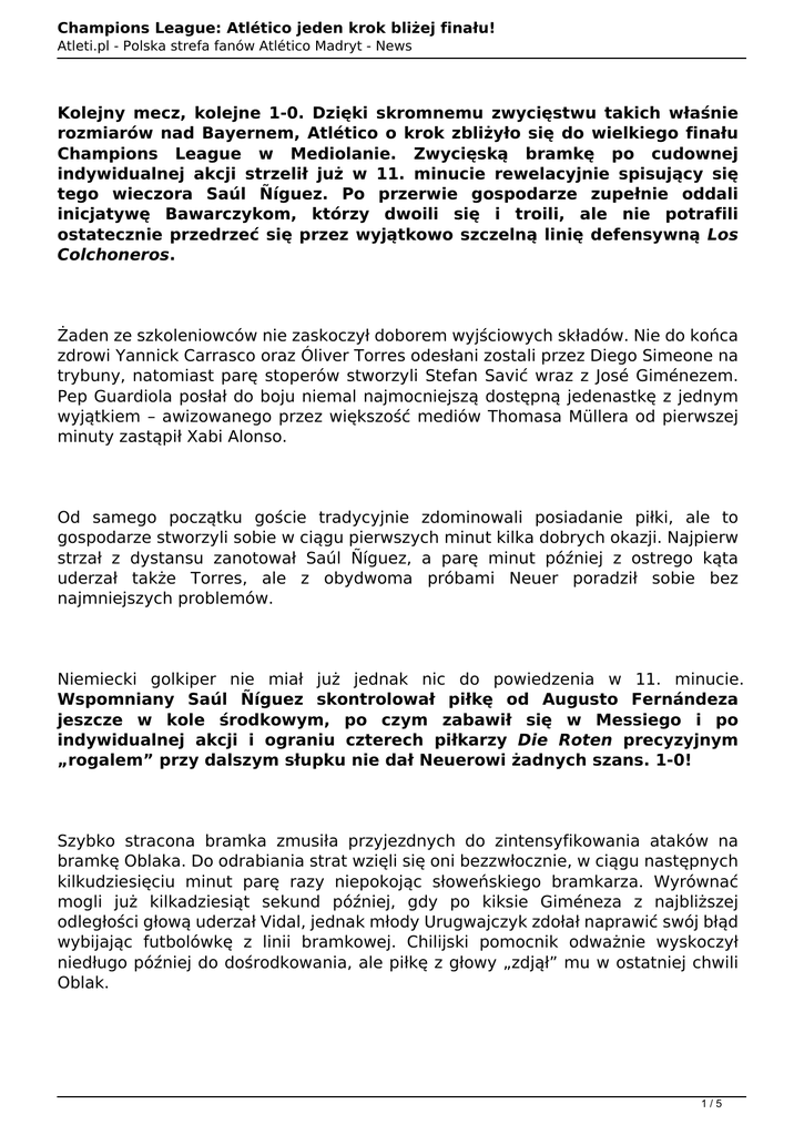 Champions League: Atlético jeden krok bliżej finału! Atleti.pl - Polska strefa fanów Atlético Madryt - News Kolejny mecz, kolejne 1-0. Dzięki skromnemu zwycięstwu takich właśnie rozmiarów nad Bayernem, Atlético o krok zbliżyło się do wielkiego finału Champions League w Mediolanie. Zwycięską bramkę po cudownej indywidualnej akcji strzelił już w 11. minucie rewelacyjnie spisujący się tego wieczora Saúl Ñíguez. Po przerwie gospodarze zupełnie oddali inicjatywę Bawarczykom, którzy dwoili się i troili, ale nie potrafili ostatecznie przedrzeć się przez wyjątkowo szczelną linię defensywną Los Colchoneros. Żaden ze szkoleniowców nie zaskoczył doborem wyjściowych składów. Nie do końca zdrowi Yannick Carrasco oraz Óliver Torres odesłani zostali przez Diego Simeone na trybuny, natomiast parę stoperów stworzyli Stefan Savić wraz z José Giménezem. Pep Guardiola posłał do boju niemal najmocniejszą dostępną jedenastkę z jednym wyjątkiem – awizowanego przez większość mediów Thomasa Müllera od pierwszej minuty zastąpił Xabi Alonso. Od samego początku goście tradycyjnie zdominowali posiadanie piłki, ale to gospodarze stworzyli sobie w ciągu pierwszych minut kilka dobrych okazji. Najpierw strzał z dystansu zanotował Saúl Ñíguez, a parę minut później z ostrego kąta uderzał także Torres, ale z obydwoma próbami Neuer poradził sobie bez najmniejszych problemów. Niemiecki golkiper nie miał już jednak nic do powiedzenia w 11. minucie. Wspomniany Saúl Ñíguez skontrolował piłkę od Augusto Fernándeza jeszcze w kole środkowym, po czym zabawił się w Messiego i po indywidualnej akcji i ograniu czterech piłkarzy Die Roten precyzyjnym „rogalem” przy dalszym słupku nie dał Neuerowi żadnych szans. 1-0! Szybko stracona bramka zmusiła przyjezdnych do zintensyfikowania ataków na bramkę Oblaka. Do odrabiania strat wzięli się oni bezzwłocznie, w ciągu następnych kilkudziesięciu minut parę razy niepokojąc słoweńskiego bramkarza. Wyrównać mogli już kilkadziesiąt sekund później, gdy po kiksie Giméneza z najbliższej odległości głową uderzał Vidal, jednak młody Urugwajczyk zdołał naprawić swój błąd wybijając futbolówkę z linii bramkowej. Chilijski pomocnik odważnie wyskoczył niedługo później do dośrodkowania, ale piłkę z głowy „zdjął” mu w ostatniej chwili Oblak. 1/5 Champions League: Atlético jeden krok bliżej finału! Atleti.pl - Polska strefa fanów Atlético Madryt - News Bawarczycy nie potrafili sforsować szczelnej defensywy Rojiblancos, od linii szesnastego metra odbijając się jak od ściany. Coraz bardziej sfrustrowani brakiem możliwości spenetrowania szyków obronnych gospodarzy, próbowali szczęścia z dystansu. Strzały w wykonaniu Alaby i Vidala okazały się jednak wyjątkowo niecelne, bezpośrednia próba Douglasa Costy po rzucie wolnym z prawego skrzydła zakończyła swój lot w bocznej siatce świątyni Oblaka, a uderzenie Lahma zostało skutecznie zablokowane. Były golkiper Benfiki zachował zimną krew także przy kilku groźnych dośrodkowaniach gości, ze wszystkimi radząc sobie bez większych problemów. Tuż przed upływem drugiego kwadransa gry do głosu na chwilę doszli goście. Po strąceniu długiego podania przez Saúla piłkę przejął Griezmann i popędził na bramkę Neuera. Francuz – skutecznie blokowany przez Javiego Martíneza – nie zdołał jednak uderzyć futbolówki wystarczająco mocno, co znacząco ułatwiło niemieckiemu golkiperowi interwencję. Po zamianie stron podopieczni Diego Simeone skupili się już wyłącznie na bronieniu skromnego prowadzenia, przy piłce utrzymując się średnio jedną czwartą czasu. Na pierwszy strzał kazali czekać ponad 50 tysiącom zebranym w środę na Vicente Calderón niemal pół godziny, w międzyczasie dopuszczając ekipę z Monachium do kilku groźnych sytuacji. W 47. minucie po rzucie rożnym do piłki doskoczył Coman, ale utalentowany Francuz nie zdołał nadać piłce ani odpowiedniej siły, ani precyzji. Kilka minut później o sporym pechu mówić mógł David Alaba. Austriak z około 30 metrów posłał na bramkę gospodarzy potężne uderzenie, które jedynie obiło jednak poprzeczkę. Dwie minuty później Oblak popisał się świetnym refleksem, na linii bramkowej wyłapując uderzenie głową w wykonaniu Javiego Martíneza po „kornerze”. Tuż przed upływem boiskowej godziny, rajd Saúla z pierwszej połowy postanowił skopiować Coman. 19-latek minął czterech zawodników Atleti, ale strzał Francuza z ostrego kąta zablokować zdążył Giménez. Niedługo później w podobnej sytuacji znalazł się Robert Lewandowski, choć Polak nie zdołał skierować piłki w światło bramki. Zaraz po upływie godziny gry, Pep Guardiola wprowadził na boisko Francka 2/5 Champions League: Atlético jeden krok bliżej finału! Atleti.pl - Polska strefa fanów Atlético Madryt - News Ribéry'ego oraz – kilka minut później – Thomasa Müllera, ale nawet to niewiele pomogło zmienić obraz gry. Przyjezdnym coraz częściej udawało się co prawda gościć w obrębie szesnastki Rojiblancos, ale ostatecznie kilka razy zabrakło im precyzji. W 71. minucie z długą piłką od Lahma nie poradził sobie Savić. Ta „znalazła” w polu karnym Douglasa Costę, ale sprytny w zamyśle lob w wykonaniu Brazylijczyka pofrunął wysoko ponad poprzeczką. Wreszcie w 73. minucie okazję strzelecką stworzyli sobie gospodarze. Piłkę wybitą z „szóstki” Neuera po dośrodkowaniu z rzutu rożnego bez przyjęcia uderzyć próbował z dystansu Gabi, ale ta nie miała żadnych szans przedostać się przez gąszcz nóg i chwilę później goście zażegnali zagrożenie. Kilkadziesiąt sekund później również z dystansu huknął z drugiej strony boiska Vidal, ale i tym razem górą okazał się czujny golkiper Los Colchoneros. Nie minęły dwie minuty i znów zrobiło się gorąco – tym r