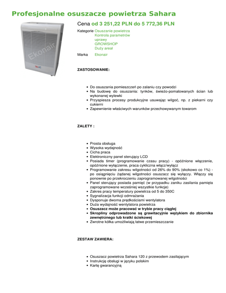 Profesjonalne osuszacze powietrza Sahara Cena od 3 251,22 PLN do 5 772,36 PLN Kategorie Osuszanie powietrza Kontrola parametrów uprawy GROWSHOP Duży areał Marka Ekonair ZASTOSOWANIE: Do osuszania pomieszczeń po zalaniu czy powodzi Na budowę do osuszania: tynków, świeżo-pomalowanych ścian lub wykonanej wylewki Przyspiesza procesy produkcyjne usuwając wilgoć, np. z piekarni czy cukierni Zapewnienie właściwych warunków przechowywanym towarom ZALETY : Prosta obsługa Wysoka wydajność Cicha praca Elektroniczny panel sterujący LCD Posiada timer (programowanie czasu pracy) - opóźnione włączenie, opóźnione wyłączenie, praca cykliczna włącz/wyłącz Programowanie zakresu wilgotności od 26% do 90% (skokowo co 1%) po osiągnięciu żądanej wilgotności osuszacz się wyłączy. Włączy się ponownie po przekroczeniu zaprogramowanej wilgotności Panel sterujący posiada pamięć (w przypadku zaniku zasilania pamięta zaprogramowane wcześniej wszystkie funkcje) Zakres pracy temperatury powietrza od 5 do 350C Sygnalizacja funkcji odmrażania Dysponuje dwoma prędkościami wentylatora Duża wydajność wentylatora powietrza Osuszacz może pracować w trybie pracy ciągłej Skropliny odprowadzone są grawitacyjnie wężykiem do zbiornika zewnętrznego lub kratki ściekowej Zwrotne kółka umożliwiają łatwe przemieszczanie ZESTAW ZAWIERA: Osuszacz powietrza Sahara 120 z przewodem zasilającym Instrukcję obsługi w języku polskim Kartę gwarancyjną Wersja produktu Osuszacz powietrza Sahara 120L (600m2) Cena 3 999,00 PLN 3 251,22 PLN netto Osuszacz powietrza Ekonair Sahara 120 to urządzenie idealnie nadające się do osuszania dużych pomieszczeń, domów, mieszkań, zakładów pracy, magazynów czy hal. Jest bardzo wydajny, posiada nowoczesny design, jest wykonany z trwałych materiałów, a co równie ważne, posiada duży przepływ powietrza dzięki czemu skutecznie zbiera wilgoć w obsługiwanym pomieszczeniu w ilości do 120 litrów na dobę. Usuwa nadmiar wilgoci, zapobiega powstawaniu pleśni, grzybów oraz nieprzyjemnych zapachów. Posiada niezbędne certyfikaty. Importer zapewnia serwis gwarancyjny i pogwarancyjny. Gwarancja 2 lata. Dane techniczne Model: SAHARA 120 wydajność osuszania (30°C RH 80 %): 120 lit./doba przepływ powietrza: 800 m3/h napięcie: 230/50 V/Hz znamionowe zużycie energii: 1190 W nominalny prąd znamionowy: 5,3 A poziom ciśnienia akustycznego: zakres pracy temp. powietrza: 5℃~35℃ poj. zbiornika na wodę: – waga netto: 51,5kg waga brutto: 58 kg wymiary osuszacza: szerokość 600 mm x głębokość 382 mm x wysokość 1000 mm Osuszacz powietrza Sahara 180L (800m2) 7 100,00 PLN 5 772,36 PLN netto Osuszacz powietrza Ekonair Sahara 180 to urządzenie idealnie nadające się do osuszania dużych pomieszczeń, domów, mieszkań, zakładów pracy, magazynów czy hal. Jest bardzo wydajny, posiada nowoczesny design, jest wykonany z trwałych materiałów, a co równie ważne, posiada duży przepływ powietrza dzięki czemu skutecznie zbiera wilgoć w obsługiwanym pomieszczeniu w ilości do 180 litrów na dobę. Usuwa nadmiar wilgoci, zapobiega powstawaniu pleśni, grzybów oraz nieprzyjemnych zapachów. Posiada niezbędne certyfikaty. Zapewniamy serwis gwarancyjny i pogwarancyjny. Gwarancja 2 lata. Dane techniczne: Model: SAHARA 180 wydajność osuszania (30°C RH 80 %): 180 lit./doba przepływ powietrza: 1350 m3/h napięcie: 230/50 V/Hz znamionowe zużycie energii: 2580 W nominalny prąd znamionowy: 12 A poziom ciśnienia akustycznego: zakres pracy temp. powietrza: 5℃~35℃ poj. zbiornika na wodę: – waga netto: 80 kg waga brutto: 100 kg Powered by TCPDF (www.tcpdf.org) wymiary osuszacza: głębokość 450 mm wysokość 1440 mm szerokość 650 mm wymiary opakowania: szerokość 695 mm głębokość 515 mm wysokość 1467 mm Galeria