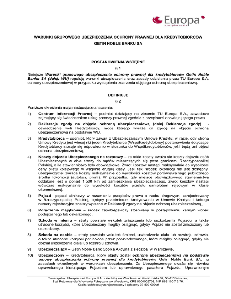WARUNKI GRUPOWEGO UBEZPIECZENIA OCHRONY PRAWNEJ DL A KREDYTOBIORCÓW GETIN NOBLE BANKU SA POSTANOWIENIA WSTĘPNE §1 Niniejsze Warunki grupowego ubezpieczenia ochrony prawnej dla kredytobiorców Getin Noble Banku SA (dalej: WU) regulują warunki ubezpieczenia oraz zasady udzielania przez TU Europa S.A. ochrony ubezpieczeniowej w przypadku wystąpienia zdarzenia objętego ochroną ubezpieczeniową. DEFINICJE §2 Poniższe określenia mają następujące znaczenie: 1) Centrum Informacji Prawnej – podmiot działający na zlecenie TU Europa S.A., zawodowo zajmujący się świadczeniem usług pomocy prawnej zgodnie z przepisami obowiązującego prawa, 2) Deklaracja zgody na objęcie ochroną ubezpieczeniową (dalej Deklaracja zgody) oświadczenie woli Kredytobiorcy, mocą którego wyraża on zgodę na objęcie ochroną ubezpieczeniową na podstawie WU, 3) Kredytobiorca – podmiot, który zawarł z Ubezpieczającym Umowę Kredytu; w razie, gdy stroną Umowy Kredytu jest więcej niż jeden Kredytobiorca (Współkredytobiorcy) postanowienia dotyczące Kredytobiorcy stosuje się odpowiednio w stosunku do Współkredytobiorców, jeśli będą oni objęci ochrona ubezpieczeniową, 4) Koszty dojazdu Ubezpieczonego na rozprawy – za takie koszty uważa się koszty dojazdu osób Ubezpieczonych w obie strony do sądów mieszczących się poza granicami Rzeczypospolitej Polskiej, o ile stawiennictwo było obowiązkowe. Zwrot kosztów nastąpi maksymalnie do wysokości ceny biletu kolejowego w wagonie drugiej klasy. Jeśli taki środek lokomocji nie jest dostępny, ubezpieczyciel zwraca koszty maksymalnie do wysokości kosztów porównywalnego publicznego środka lokomocji (autobus, prom). W przypadku, gdy miejsce obowiązkowego stawiennictwa oddalone jest o ponad 1.500 km od zamieszkania ubezpieczającego, zwrot kosztów nastąpi wówczas maksymalnie do wysokości kosztów przelotu samolotem rejsowym w klasie ekonomicznej, 5) Pojazd –pojazd silnikowy w rozumieniu przepisów prawa o ruchu drogowym, zarejestrowany w Rzeczypospolitej Polskiej, będący przedmiotem kredytowania w Umowie Kredytu i którego numery rejestracyjne zostały wpisane w Deklaracji zgody na objęcie ochroną ubezpieczeniową,, 6) Poręczenie majątkowe – środek zapobiegawczy stosowany w postępowaniu karnym wobec podejrzanego lub oskarżonego, 7) Szkoda w mieniu – straty powstałe wskutek zniszczenia lub uszkodzenia Pojazdu, a także utracone korzyści, które Ubezpieczony mógłby osiągnąć, gdyby Pojazd nie został zniszczony lub uszkodzony, 8) Szkoda na osobie – straty powstałe wskutek śmierci, uszkodzenia ciała lub rozstroju zdrowia, a także utracone korzyści poniesione przez poszkodowanego, które mógłby osiągnąć, gdyby nie doznał uszkodzenia ciała lub rozstroju zdrowia, 9) Ubezpieczający – Getin Noble Bank Spółka Akcyjna z siedzibą w Warszawie, 10) Ubezpieczony – Kredytobiorca, który objęty został ochroną ubezpieczeniową na podstawie umowy ubezpieczenia ochrony prawnej dla kredytobiorców Getin Noble Bank SA, na zasadach określonych w warunkach ubezpieczenia. Za Ubezpieczonego uważa się również uprawnionego kierującego Pojazdem lub uprawnionego pasażera Pojazdu. Uprawnionym Towarzystwo Ubezpieczeń Europa S.A. z siedzibą we Wrocławiu ul. Gwiaździsta 62, 53-413 Wrocław, Sąd Rejonowy dla Wrocławia Fabryczna we Wrocławiu, KRS 0000002736, NIP 895 100 7 2 76, Kapitał zakładowy zarejestrowany i opłacony 37 800 000 zł kierującym jest każda osoba kierująca Pojazdem za wyraźna lub za dorozumianą zgodą osoby upoważnionej do dysponowania Pojazdem. Uprawnionym pasażerem jest każdy pasażer, który znajduje się w Pojeździe za wyraźną zgodą osobą upoważnionej do dysponowania Pojazdem, 11) Ubezpieczyciel – Towarzystwo Ubezpieczeń Europa Spółka Akcyjna, 12) Umowa kredytu – zawarta pomiędzy Ubezpieczającym a Kredytobiorcą umowa, na podstawie, której Ubezpieczający oddaje do dyspozycji Kredytobiorcy na czas oznaczony w umowie kwotę środków pieniężnych (Kredyt) z przeznaczeniem na zakup Pojazdu, a Kredytobiorca zobowiązuje się do korzystania z niej na warunkach określonych w umowie, zwrotu kwoty wykorzystanego Kredytu wraz z odsetkami w oznaczonych terminach spłaty oraz zapłaty prowizji od udzielonego Kredytu, 13) Wynagrodzenie adwokata lub radcy prawnego –wynagrodzenie jednego adwokata lub radcy prawnego pokrywane wg następujących zasad: a) z tytułu zastępstwa procesowego lub obrony w wysokości ustalonej zgodnie z odpowiednimi przepisami regulującymi wysokość minimalnego wynagrodzenia za czynności adwokata lub radcy prawnego; w braku takich przepisów stosuje się odpowiednie przepisy stanowiące podstawę do zasądzania przez sądy kosztów zastępstwa prawnego lub obrony dla adwokata lub radcy prawnego; w braku również i takich przepisów stosuje się odpowiednio przepisy regulujące zasady ponoszenia przez państwo (Skarb Państwa) kosztów nieopłaconej pomocy prawnej udzielonej z urzędu; w każdym przypadku wynagrodzenie adwokata lub radcy prawnego z tytułu zastępstwa prawnego lub obrony ustala się w wysokości nie wyższej niż dla adwokata lub radcy prawnego mającego siedzibę w miejscowości, w której znajduje się siedziba sądu właściwego miejscowo i rzeczowo do orzekania w sprawie w I instancji; natomiast dla kosztów zastępstwa prawnego świadczonego przez uprawionego prawnika na terytorium innych państw stosuje się stawki ustawowo przewidziane za daną czynności w danym systemie prawnym. W razie braku w danym państwie regulacji prawnej dotyczącej wysokości stawek lub w przypadku, gdy prawodawstwo danego kraju dopuszcza uznanie w kształtowaniu tych stawek w obrocie, wynagrodzenie za świadczenia usługi prawnej określonego typu nie może być wyższe od średnich stawek obowiązujących w danym kraju. PRZEDMIOT I ZAKRES UBEZPIECZENIA §3 Przedmiotem ubezpieczenia jest refundacja przez Ubezpieczyciela wskazanyc