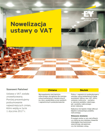 Nowelizacja ustawy o VAT Szanowni Państwo! Ustawa o VAT została znowelizowana. Poniżej prezentujemy podsumowanie najważniejszych zmian, które wejdą w życie 1 stycznia 2017 r. Zmiana Wprowadzenie mechanizmu odwrotnego obciążenia dla szeregu usług budowlanych świadczonych na rzecz podatników przez polskich i zagranicznych podwykonawców Skutek Polscy i zagraniczni podwykonawcy szeregu usług budowlanych będą wystawiać faktury bez VAT, który zostanie rozliczony – zarówno w zakresie podatku należnego, jak i podatku naliczonego – przez nabywcę. Nabywca nie będzie mógł odliczyć błędnie wykazanego podatku naliczonego. Wskazane działania: Przegląd umów w celu weryfikacji, czy dotyczą one dostawy towarów (nieobjętej mechanizmem odwrotnego obciążenia), czy też dostawy usług. Zmiana 2 Skutek Uchylenie zwolnienia dla usług stanowiących element usługi finansowej lub ubezpieczeniowej Niektóre pomocnicze usługi finansowe i ubezpieczeniowe mogą zostać objęte podatkiem VAT. Wskazane działania: Przegląd uzyskanych w przeszłości interpretacji podatkowych w celu weryfikacji, czy wciąż gwarantują one ochronę, czy też należy uzyskać nowe interpretacje lub zmienić podejście. W zakresie odwrotnego obciążenia: • Odliczenie podatku naliczonego będzie możliwe wyłącznie pod warunkiem wykazania podatku należnego w deklaracji za okres, w którym powstał obowiązek podatkowy (na podstawie otrzymanej faktury) • W wypadku niewykazania podatku należnego we właściwej deklaracji w ciągu trzech miesięcy od upływu miesiąca, w którym powstał obowiązek podatkowy, wsteczne wykazanie podatku naliczonego nie będzie możliwe Ryzyko zaległości podatkowych i odsetek za zwłokę od wartości podatku należnego naliczanych do momentu wykazania w bieżącej deklaracji podatku naliczonego. Zmiana może dotknąć w szczególności międzynarodowe koncerny, które często rozliczają transakcje wewnątrz grupy z opóźnieniem. Wskazane działania: Szybsze wdrożenie procesu korygowania deklaracji VAT w wypadku nierozliczonych WNT. Dodatkowe warunki przyśpieszonego zwrotu VAT w ciągu 25 dni Wskazane działania: Podatnicy planujący transakcje z przyśpieszonym zwrotem w ciągu 25 dni powinni upewnić się, czy spełniają wszystkie warunki przyśpieszonego zwrotu. Dodatkowe wymogi związane z rejestracją nowych podatników (odpowiedzialność pełnomocnika dokonującego rejestracji w imieniu podatnika, automatyczne wykreślanie podatnika z rejestru w wypadku zajścia określonych przesłanek) Wskazane działania: Należy weryfikować podstawę rejestracji i prawidłowość bieżących rozliczeń, aby w miarę możliwości uniknąć odpowiedzialnośći czy też wykreślenia z rejestru podatników. Likwidacja deklaracji kwartalnych Wskazane działania: Podatnicy składający deklaracje kwartalne będą musieli zmienić procedury rozliczania podatku. | Draft Law Amending the Polish VAT Act Zmiana Skutek Obowiązkowe deklaracje elektroniczne Wskazane działania: Podatnicy zagraniczni składający deklaracje papierowe będą musieli wyznaczyć polskiego pełnomocnika do składania deklaracji elektronicznych w ich imieniu lub samemu uzyskać dostęp do systemu informatycznego Ministerstwa Finansów. Polskie spółki będą składać deklaracje elektronicznie. Zmiana katalogu transakcji, które skutkują odpowiedzialnością solidarną sprzedawcy i nabywcy, dodatkowe warunki zwolnienia nabywcy z odpowiedzialności solidarnej Zmiana ma istotny wpływ na rynek paliw, stali i elektroniki użytkowej. Sankcja 30% od wartości zaniżenia podatku należnego lub zawyżenia podatku naliczonego, wykrytego przez organy podatkowe Z uwagi na nowe sankcje należy zwrócić szczególną uwagę na procedury fakturowania, aby uniknąć nieefektywności i ryzyka posługiwania się pustymi fakturami. Sankcja 20% od wartości zaniżenia podatku należnego lub zawyżenia podatku naliczonego w wypadku korekty po zakończeniu kontroli lub w trakcie postępowania kontrolnego Sankcja 100% za posługiwanie się pustymi fakturami Warto rozważyć: Przegląd VAT w celu wykrycia i usunięcia nieprawidłowości. Wdrożenie procedury weryfikacji klientów i dostawców w celu uniknięcia ryzyka wplątania w karuzelę VAT. Podwyższenie progu zwolnienia podmiotowego (ze 150 000 do 200 000 zł) Ponieważ próg pozostanie na relatywnie niskim poziomie, wpływ tej zmiany na działalność naszych klientów nie będzie znaczący. Utrzymanie podwyższonych stawek 23% i 8% do 31 grudnia 2018 r. Sytuacja pozostaje bez zmian. Surowsze kary za wykroczenia i przestępstwa skarbowe, w tym w szczególności wyłudzenia podatku Warto rozważyć: Przegląd procedur podatkowych w celu uniknięcia odpowiedzialności skarbowej osób odpowiedzialnych za rozliczenia podatkowe Zachęcamy do kontaktu, jeśli interesują Państwa bliższe informacje o przedstawionych kwestiach. Z poważaniem, Zespół EY Draft Law Amending the Polish VAT Act | 3 Kontakt Dorota Pokrop Partner Radosław Szczęch Partner +48 22 557 73 39 [email protected] +48 22 557 72 93 [email protected] Stefan Majerowski Manager Tomasz Wagner Manager +48 22 557 70 76 [email protected] +48 22 557 75 53 [email protected] EY | Assurance | Tax | Transactions | Advisory O firmie EY EY jest światowym liderem rynku usług profesjonalnych obejmujących usługi audytorskie, doradztwo podatkowe, doradztwo biznesowe i doradztwo transakcyjne. Nasza wiedza oraz świadczone przez nas najwyższej jakości usługi przyczyniają się do budowy zaufania na rynkach kapitałowych i w gospodarkach całego świata. W szeregach EY rozwijają się utalentowani liderzy zarządzający zgranymi zespołami, których celem jest spełnianie obietnic składanych przez markę EY. W ten sposób przyczyniamy się do budowy sprawniej funkcjonującego świata. Robimy to dla naszych klientów, społeczności, w których żyjemy i dla nas samych. Nazwa EY odnosi się do firm członko