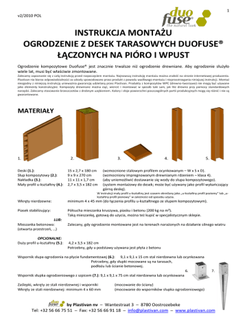 1 v2/2010 POL INSTRUKCJA MONTAŻU OGRODZENIE Z DESEK TARASOWYCH DUOFUSE® ŁĄCZONYCH NA PIÓRO I WPUST Ogrodzenie kompozytowe Duofuse® jest znacznie trwalsze niż ogrodzenie drewniane. Aby ogrodzenie służyło wiele lat, musi być właściwie zmontowane. Zalecamy zapoznanie się z całą instrukcją przed rozpoczęciem montażu. Najnowszą instrukcję montażu można znaleźć na stronie internetowej producenta. Plastivan nie bierze odpowiedzialności za szkody spowodowane przez produkt z powodu wadliwego montażu i nieprzestrzegania niniejszej instrukcji. Montaż niezgodny z niniejszą instrukcją unieważnia gwarancję udzielaną przez Plastivan. Produkty z kompozytów WPC (drewno-tworzywo) nie mogą być używane jako elementy konstrukcyjne. Kompozyty drewniane można ciąć, wiercić i montować w sposób taki sam, jak lite drewno przy pomocy standardowych narzędzi. Zalecamy stosowanie brzeszczotów z drobnym uzębieniem. Kolory i słoje powierzchni poszczególnych partii produkcyjnych mogą się różnić i nie są gwarantowane. MATERIAŁY 1. 2. Deski (1.): Słup kompozytowy (2.): Nakładka (3.): Mały profil u-kształtny (4.): 3. 15 x 2,7 x 180 cm 9 x 9 x 270 cm 11 x 11 x 1,7 cm 2,7 x 3,5 x 182 cm 4. 5. (wzmocnione stalowym profilem ocynkowanym – W x S x D). (wzmocniony impregnowanym drewnianym rdzeniem – klasa 4). (aby uniemożliwić dostawanie się wody do słupa kompozytowego). (system montażowy do desek; może być używany jako profil wykańczający górną deskę). W instrukcji mały profil u-kształtny jest czasem określany jako „u-kształtny profil poziomy” lub „ukształtny profil pionowy” w zależności od sposobu użycia. Wkręty nierdzewne: minimum 4 x 45 mm (do łączenia profilu u-kształtnego ze słupem kompozytowym). Piasek stabilizujący: Półsucha mieszanka kruszywa, piasku i betonu (200 kg na m³). Taką mieszankę, gotową do użycia, można też kupić w specjalistycznym sklepie. LUB: Mieszanka betonowa: (otwarta przestrzeń, …) OPCJONALNE: Duży profil u-kształtny (5.): Zalecany, gdy ogrodzenie montowane jest na terenach narażonych na działanie silnego wiatru 4,2 x 3,5 x 182 cm Potrzebny, gdy u podstawy używana jest płyta z betonu Wspornik słupa ogrodzenia na płycie fundamentowej (6.): 9,1 x 9,1 x 15 cm stal nierdzewna lub ocynkowana Potrzebny, gdy słupki mocowane są na tarasach, podłożu lub ścianie betonowej. 6. Wspornik słupka ogrodzeniowego z szpicem (7.): 9,1 x 9,1 x 75 cm stal nierdzewna lub ocynkowana Zaślepki, wkręty ze stali nierdzewnej i wsporniki Wkręty ze stali nierdzewnej: minimum 4 x 60 mm 7. (mocowanie do ściany) (mocowanie do wsporników słupka ogrodzeniowego) by Plastivan nv – Wantestraat 3 – 8780 Oostrozebeke Tel: +32 56 66 75 51 – Fax: +32 56 66 91 18 – [email protected] – www.plastivan.com 2 v2/2010 POL NARZĘDZIA (w zależności od sposobu mocowania) Łopata ogrodowa / świder ziemny Poziomica Sznurek murarski lub zwykły Śrubokręt Wiertarka Wkrętarka Pogłębiacz stożkowy Taśma miernicza Piła grzbietnica / Wyrzynarka / Piła ręczna Piła z brzeszczotem widłowym do cięcia desek PODSTAWOWE ZASADY Wysokość Dzięki łączeniu na pióro i wpust można zmontować ogrodzenie o różnej wysokości modułów (od 15 cm do 180 cm), w zależności od liczby użytych desek. Ogrodzenia mogą być także montowane kaskadowo, np. pierwszy odcinek 120 cm wysokości, drugi 150 cm itd. … Deski można układać bezpośrednio na ziemi, gdyż nigdy nie butwieją. Ogrodzenia mogą zmieniać wymiary wzdłużny i poprzeczny pod wpływem pochłanianej wilgoci, dlatego między słupkami a pierwszą deską należy zostawić co najmniej 5,5 cm szczelinę dylatacyjną. Długość Standardowa długość desek wynosi 180 cm, ale deski można przyciąć do dowolnej długości. Z uwagi na obecność wzmocnionych profili w stali ocynkowanej, do cięcia desek należy używać piły z tarczą drobnozębną widłową. Po obu stronach należy zostawić 1 cm szczelinę dylatacyjną. Biorąc pod uwagę grubość profilu u-kształtnego (0,5 cm) deski muszą być co najmniej 2 x 1,5 cm mniejsze niż odległość między oboma słupkami. W przypadku standardowej długości ogrodzenia odległość między słupkami wynosi 183 cm. Powyższe wartości mają zastosowanie w przypadku montażu ogrodzenia w dni bezdeszczowe, gdy używane deski były przechowywane w pomieszczeniach suchych. by Plastivan nv – Wantestraat 3 – 8780 Oostrozebeke Tel: +32 56 66 75 51 – Fax: +32 56 66 91 18 – [email protected] – www.plastivan.com 3 v2/2010 POL PROCEDURA MONTAŻU OGRODZENIA Unikać różnych kolorów: Deski i słupki należy zawsze montować w tym samym kierunku. Deski muszą być tak wsuwane, aby znacznik znajdował się zawsze po tej samej stronie deski (przedniej lub tylnej). Znacznik można znaleźć na każdej desce (zob. czerwone strzałki). Z jednej strony obu boków słupka drewniany rdzeń połączony jest ze słupkiem kompozytowym przy pomocy wkrętu. Strona słupka z wkrętem powinna być zawsze po tej samej stronie (tzn. zawsze z przodu lub zawsze z tyłu,…). Unikać uszkodzenia materiału: - Wkręty należy wkręcać wkrętarką ustawioną na niską siłę wkręcania Słupków i desek nie wolno uderzać młotkiem. Unikać montowania materiałów z kompozytów drewnianych w temperaturach poniżej 5°C. Do dopasowania konieczne są wcześniej wykonane otwory z pogłębieniem stożkowym Etap 1 : Skracanie słupków (opcjonalnie) Montując ogrodzenia o wysokości mniejszej niż 180 cm lub używając wsporników słupków ogrodzeniowych należy przyciąć słupki do odpowiedniej wysokości. Z jednej strony obu boków słupka do słupka kompozytowego mocuje się rdzeń drewniany przy pomocy wkrętu. Dlatego zawsze należy przycinać słupki z drugiej strony. Gdy potrzebny nam jest krótki słupek, możemy przeciąć słupek na pół. Następnie trzeba przymocować słupek do drewnianego rdzenia przy pomocy wkrętu ze s