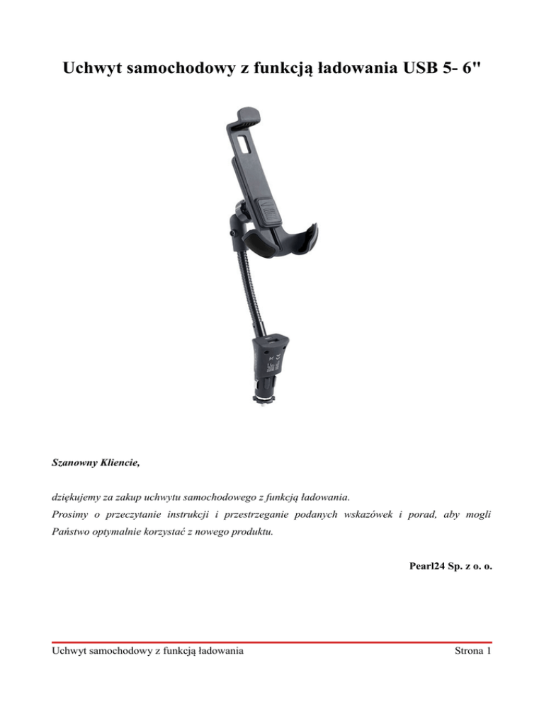 Uchwyt samochodowy z funkcją ładowania USB 5- 6" Szanowny Kliencie, dziękujemy za zakup uchwytu samochodowego z funkcją ładowania. Prosimy o przeczytanie instrukcji i przestrzeganie podanych wskazówek i porad, aby mogli Państwo optymalnie korzystać z nowego produktu. Pearl24 Sp. z o. o. Uchwyt samochodowy z funkcją ładowania Strona 1 Zawartość zestawu: • Uchwyt samochodowy • Kabel USB – micro USB • Instrukcja obsługi. WSKAZÓWKA Uchwyt jest odpowiedni dla telefonów od 5''. Przed użyciem należy sprawdzić dane techniczne uchwytu oraz telefonu i upewnić się, że oba urządzenia będą do siebie pasowały. Dane techniczne • Nadaje się do pojazdów o napięciu 12 V lub 24 V • Wejście: 12 V - 24 V • Wyjście: 5 V, 3,1 A • Regulacja wysokości: ok. 111-168 mm • Regulacja szerokości: ok. 52 - 85 mm • Zakres obrotu: 360 °. Użytkowanie 1. Należy obrócić pierścień mocujący z tyłu uchwytu w lewo i wyjąć. Uchwyt samochodowy z funkcją ładowania Strona 2 2. Pierścień należy umieścić na głowicy, wciskając ją do wnęki w uchwycie, a następnie przykręcić pierścień mocujący. 3. Kolejno należy podłączyć wtyczkę samochodową do napięcia pojazdu (gniazdo zapalniczki). 4. Aby włożyć telefon do uchwytu, należy nacisnąć i przytrzymać przycisk PUSH, i przesunąć szynę w kierunku wskazanym strzałką. 5. Należy umieścić telefon w uchwycie. 6. Szynę należy przesunąć w dół tak, aby telefon był stabilnie przymocowany. 7. Kabel ładowania należy podłączyć do złącza USB uchwytu i do złącza ładowania w telefonie. 8. Dioda na wtyczce samochodowej świeci się na niebiesko podczas ładowania. Wyjmowanie telefonu z uchwytu 1. Telefon należy przesunąć do przodu pod kątem 30°. 2. Należy wyjąć telefon z uchwytu. Ładowanie innych urządzeń USB Można również ładować inne urządzenia USB, które wymagają napięcia 5 V. W tym celu należy podłączyć kabel ładowania urządzenia do portu USB wtyczki samochodowej. Dioda na wtyczce świeci się na niebiesko podczas ładowania. Uchwyt samochodowy z funkcją ładowania Strona 3 Bezpieczeństwo • Niniejsza instrukcja ma na celu zapoznanie Państwa z zasadami prawidłowego korzystania z produktu. Zaleca się przechowywanie instrukcji w łatwo dostępnym miejscu, aby w razie potrzeby mogli Państwo zweryfikować informacje. • Wszelkie modyfikacje produktu obniżają poziom jego bezpieczeństwa. UWAGA! Istnieje ryzyko obrażeń! • Nie należy rozkładać ani naprawiać urządzenia samodzielnie! • Zaleca się ostrożne obchodzenie się z produktem. Produkt może ulec uszkodzeniu w wyniku uderzenia, wstrząsów lub upadku nawet z niewielkiej wysokości. • Produkt należy trzymać z dala od wilgoci i wysokiej temperatury. • Nie należy zanurzać urządzenia w wodzie oraz innych płynach. • Wszelkie prawa do wprowadzania zmian technicznych oraz eliminacji błędów są zastrzeżone. Ważne wskazówki dotyczące utylizacji Urządzenia elektrycznego nie zalicza się do odpadów gospodarstwa domowego. W celu właściwej utylizacji urządzenia należy skontaktować się z organizacją odpowiedzialną za zbiórkę elektroodpadów w wybranej miejscowości. Deklaracja zgodności PEARL.GmbH oświadcza, że produkt HZ-2558 jest zgodny z Dyrektywą EMV 2004/108/EG i Dyrektywą RoHS 2011/65/EU. Uchwyt samochodowy z funkcją ładowania Strona 4