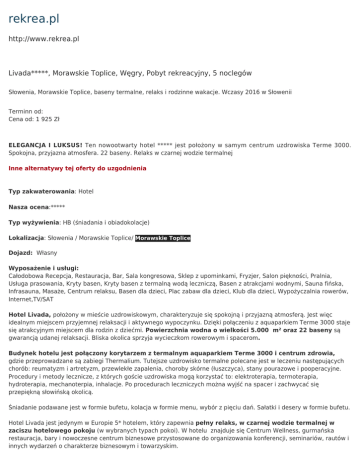 rekrea.pl http://www.rekrea.pl Livada*****, Morawskie Toplice, Węgry, Pobyt rekreacyjny, 5 noclegów Słowenia, Morawskie Toplice, baseny termalne, relaks i rodzinne wakacje. Wczasy 2016 w Słowenii Terminn od: Cena od: 1 925 Zł ELEGANCJA I LUKSUS! Ten nowootwarty hotel ***** jest położony w samym centrum uzdrowiska Terme 3000. Spokojna, przyjazna atmosfera. 22 baseny. Relaks w czarnej wodzie termalnej Inne alternatywy tej oferty do uzgodnienia Typ zakwaterowania: Hotel Nasza ocena:***** Typ wyżywienia: HB (śniadania i obiadokolacje) Lokalizacja: Słowenia / Morawskie Toplice/ Morawskie Toplice Dojazd: Własny Wyposażenie i usługi: Całodobowa Recepcja, Restauracja, Bar, Sala kongresowa, Sklep z upominkami, Fryzjer, Salon piękności, Pralnia, Usługa prasowania, Kryty basen, Kryty basen z termalną wodą leczniczą, Basen z atrakcjami wodnymi, Sauna fińska, Infrasauna, Masaże, Centrum relaksu, Basen dla dzieci, Plac zabaw dla dzieci, Klub dla dzieci, Wypożyczalnia rowerów, Internet,TV/SAT Hotel Livada, położony w mieście uzdrowiskowym, charakteryzuje się spokojną i przyjazną atmosferą. Jest więc idealnym miejscem przyjemnej relaksacji i aktywnego wypoczynku. Dzięki połączeniu z aquaparkiem Terme 3000 staje się atrakcyjnym miejscem dla rodzin z dziećmi. Powierzchnia wodna o wielkości 5.000 m² oraz 22 baseny są gwarancją udanej relaksacji. Bliska okolica sprzyja wycieczkom rowerowym i spacerom. Budynek hotelu jest połączony korytarzem z termalnym aquaparkiem Terme 3000 i centrum zdrowia, gdzie przeprowadzane są zabiegi Thermalium. Tutejsze uzdrowisko termalne polecane jest w leczeniu następujących chorób: reumatyzm i artretyzm, przewlekłe zapalenia, choroby skórne (łuszczyca), stany pourazowe i pooperacyjne. Procedury i metody lecznicze, z których goście uzdrowiska mogą korzystać to: elektroterapia, termoterapia, hydroterapia, mechanoterpia, inhalacje. Po procedurach leczniczych można wyjść na spacer i zachwycać się przepiękną słowińską okolicą. Śniadanie podawane jest w formie bufetu, kolacja w formie menu, wybór z pięciu dań. Sałatki i desery w formie bufetu. Hotel Livada jest jedynym w Europie 5* hotelem, który zapewnia pełny relaks, w czarnej wodzie termalnej w zaciszu hotelowego pokoju (w wybranych typach pokoi). W hotelu znajduje się Centrum Wellness, gurmańska restauracja, bary i nowoczesne centrum biznesowe przystosowane do organizowania konferencji, seminariów, rautów i innych wydarzeń o charakterze biznesowym i towarzyskim. Parkować można bezpłatnie na parkingu hotelowym. W ofercie mamy również inne propozycje pakietów pobytowych w tym hotelu. Uwaga Polecamy zakup kompletnego pakietu ubezpieczenia turystycznego, łącznie z opłatą storno wycieczki po dogodnej cenie, patrz niżej Zniżki i dopłaty. Cena obejmuje 5x nocleg, 5x wyżywienie (w formie bufetu), bezpłatne wejście do basenów hotelowych, bezpłatne wejście do hotelowego świata saun, wypożyczenie szlafroka, ustawowe ubezpieczenie biur podróży. Cena nie obejmuje opłaty klimatycznej w wysokości 1,265 € za osobę i noc, opłaty rejestracyjnej 1 € za osobę i pobyt.