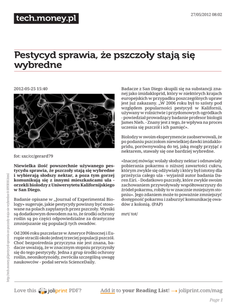 27/05/2012 08:02 tech.money.pl Pestycyd sprawia, że pszczoły stają się wybredne 2012-05-25 15:40 Badacze z San Diego skupili się na substancji znanej jako imidakloprid, który w niektórych krajach europejskich w przypadku poszczególnych upraw jest już zakazany. ,,W 2006 roku był to szósty pod względem popularności pestycyd w Kalifornii, używany w rolnictwie i przydomowych ogródkach - powiedział prowadzący badanie profesor biologii James Nieh. - Znany jest z tego, że wpływa na proces uczenia się pszczół i ich pamięć». Biolodzy w swoim eksperymencie zaobserwowali, że po podaniu pszczołom niewielkiej dawki imidaklopridu, porównywalną do tej, jaką mogły przyjąć z nektarem, stawały się one bardziej wybredne. http://tech.money.pl/pestycyd-sprawia-ze-pszczoly-staja-sie-wybredne-0-1093010.html fot: sxc/cc/gerard79 Niewielka ilość powszechnie używanego pestycydu sprawia, że pszczoły stają się wybredne i wybierają słodszy nektar, a poza tym gorzej komunikują się z innymi mieszkańcami ula orzekli biolodzy z Uniwersytetu Kalifornijskiego w San Diego. Badanie opisane w ,,Journal of Experimental Biology» sugeruje, jakie pestycydy powinny być stosowane na polach zapylanych przez pszczoły. Wyniki są dodatkowym dowodem na to, że środki ochrony roślin są po części odpowiedzialne za drastyczne zmniejszanie się populacji tych owadów. «Inaczej mówiąc wolały słodszy nektar i odmawiały pobierania pokarmu o niższej zawartości cukru, którym zwykle się odżywiały i który był istotny dla przeżycia całego ula - wyjaśnił autor badania Daren Eiri. - Dodatkowo pszczoły, które zwykle swoim zachowaniem przywoływały współtowarzyszy do źródeł pokarmu, robiły to w znacznie mniejszym stopniu». Jego zdaniem może to poważnie zmniejszyć dostępność pokarmu i zaburzyć komunikację owadów z kolonią. (PAP) mrt/ tot/ Od 2006 roku pszczelarze w Ameryce Północnej i Europie stracili około jednej trzeciej populacji pszczół. Choć bezpośrednia przyczyna nie jest znana, badacze uważają, że w znacznym stopniu przyczyniły się do tego pestycydy. Jedna z grup środki ochrony roślin, neonikotynoidy, zwróciła szczególną uwagę naukowców - podał serwis ScienceDaily. Love this PDF? Add it to your Reading List! 4 joliprint.com/mag Page 1