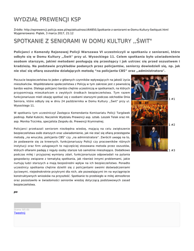 WYDZIAŁ PREWENCJI KSP Źródło: http://wprewencji.policja.waw.pl/wp/aktualnosci/64850,Spotkanie-z-seniorami-w-Domu-Kultury-Switquot.html Wygenerowano: Piątek, 3 marca 2017, 21:12 SPOTKANIE Z SENIORAMI W DOMU KULTURY ,,ŚWIT" Policjanci z Komendy Rejonowej Policji Warszawa VI uczestniczyli w spotkaniu z seniorami, które odbyło się w Domu Kultury ,,Świt" przy ul. Wysockiego 11. Celem spotkania było uświadomienie osobom starszym, jakimi metodami posługują się przestępcy i jak ustrzec się przed oszustwem i kradzieżą. Na podstawie przykładów podanych przez policjantów, seniorzy dowiedzieli się, np. jak nie stać się ofiarą oszustów działających metodą “na policjanta CBŚ” oraz ,,administratora". Poczucie bezpieczeństwa to jeden z głównych czynników wpływających na jakość życia mieszkańców. Współdziałanie społeczeństwa z Policją w tym zakresie jest z pewnością bardzo ważne. Dlatego policjanci bardzo chętnie uczestniczą w spotkaniach, na których przypominają mieszkańcom o zwykłych środkach bezpieczeństwa. Tym razem funkcjonariusze mieli okazję spotkać się z osobami starszymi podczas odchodów Dnia Seniora, które odbyły się w dniu 24 października w Domu Kultury ,,Świt" przy ul. 1 #1 Wysockiego 11. W spotkaniu tym uczestniczył Zastępca Komendanta Komisariatu Policji Targówek podinsp. Rafał Kubicki, Naczelnik Wydziału Prewencji asp. sztab. Leszek Telak oraz mł. asp. Monika Trzcinka, specjalista Zespołu ds. Prewencji Kryminalnej. 1 #2 Policjanci przekazali seniorom niezbędna wiedzę, mającą na celu zwiększenie bezpieczeństwa osób starszych oraz uświadomienie, jak nie stać się ofiarą przestępstw metodą „na wnuczka, policjanta CBŚ” czy „na administratora”. Zwrócili uwagę na to, że podawanie się za krewnych, funkcjonariuszy Policji czy pracowników różnych instytucji oraz firm usługowych to najczęściej stosowana metoda przez oszustów, których ofiarami padają z reguły osoby starsze lub samotnie mieszkające. Dodatkowo podczas miłej i przyjaznej wymiany zdań, funkcjonariusze odpowiadali na pytania gospodarzy związane z tematyką spotkania, jak również innymi problemami, jakie nurtują ludzi starszych a mają bezpośredni wpływ na ich bezpieczeństwo. Ponadto uczestnicy spotkania chętnie dzielili się z policjantami swoimi doświadczeniami życiowymi, niejednokrotnie przykrymi dla nich, ale pozwalającymi im na wyciągnięcie konstruktywnych wniosków na przyszłość. Spotkanie to przebiegło w miłej atmosferze oraz pozostawiło w świadomości seniorów wiedzę dotyczącą podstawowych zasad bezpieczeństwa. po Ocena: 0/5 (0) Tweetnij 1 #3