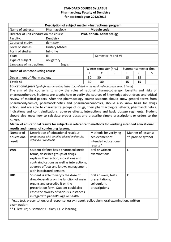 STANDARD COURSE SYLLABUS Pharmacology Faculty of Dentistry for academic year 2012/2013 Description of subject matter – Instructional program Name of subject: Pharmacology Module code: Director of unit conduction the course: Prof. dr hab. Adam Szeląg Faculty: Dentistry Course of study: dentistry Level of studies Unitary MMed Form of studies full-time Year: III Semester: V and VI Type of subject obligatory Language of instruction: English Winter semester (hrs.) Summer semester (hrs.) Name of unit conducting course L C S L C S Department of Pharmacology 30 30 15 15 Total: 45 30 30 15 15 Educational goals (goals for lessons set by instructor, related to the results of education, max. 6 items) The aim of the course is to show the rules of rational pharmacotherapy, benefits and risks of pharmacotherapy. Students are taught how to verify the sources of knowledge about drugs and critical review of medical papers. After the pharmacology course students should know general terms from pharmacodynamics, pharmacokinetics and pharmacoeconomics, should also know basis for drugs action, and are able to characterize groups of drugs, their pharmacological effects, pharmacokinetics, indications and contraindications, adverse effects, interactions and basic dosage regiments. Student should also know how to calculate proper doses and prescribe simple prescriptions or orders to the nurses. Matrix of educational results for subjects in reference to methods for verifying intended educational results and manner of conducting lessons. Number of Description of educational result (in Methods for verifying Manner of lessons: conformance with detailed educational results educational achievement of ** provide symbol defined in standards) result intended educational results * W01 Student defines basic pharmacokinetic oral or written L terms, describes groups of drugs, examinations explains their action, indications and contraindications as well as interactions, adverse effects and knows management with intoxicated persons. U01 Student is able to veryfy the dose of oral answers, tests, C drug depending on the function of main presentations, organs and prescribe it on the colloquium, prescription form. Student could also prescriptions esses the toxicity of various substances in regard to patient’s age or health. *e.g.. test, presentation, oral response, essay, report, colloquium, oral examination, written examination; ** L- lecture; S- seminar; C- class; EL- e-learning; Student work input (balance of ECTS points) Lessons on-site (hrs.) Own work (hrs.) Summary of student workload ECTS points for subject 4 Remarks Content of lessons: (please provide the subject of individual lessons, keeping in mind the need to contribute to the intended educational results) Lectures – winter semester Subject: Name of the lecturer Lecture 1. General pharmacology – introduction. Anna Merwid-Ląd MD, PhD Lecture 2. General pharmacology – LADME. General pharmacology – pharmacokinetics, variations in drugs’ action. Autonomic nervous system – physiology, drugs acting on ganglia. Adrenomimetics part I. Autonomic nervous system – adrenomimetics part II, adrenolytics. Anna Merwid-Ląd MD, PhD Lecture 3. Lecture 4. Lecture 5. Lecture 6. Autonomic nervous system – cholinergic system. Lecture 7. Vitamins. Lecture 8. Diuretics. Heparins, oral anticoagulants. Antiplatelets and thrombolytics. Hypolypemic drugs. Therapy of chronic heart failure (RAA system - ACEI, ARB, RI, cardiac glycosides and other inotropic agents). Therapy of ischemic heart disease (BB, CCB, vasodilators). Therapy of hypertension. Lecture 9. Lecture 10. Lecture 11. Lecture 12. Lecture 13. Lecture 14. Anna Merwid-Ląd MD, PhD Anna Merwid-Ląd MD, PhD Anna Merwid-Ląd MD, PhD Ewa Chlebda-Sieragowska MD, PhD Anna Merwid-Ląd MD, PhD Anna Merwid-Ląd MD, PhD Anna Merwid-Ląd MD, PhD Anna Merwid-Ląd MD, PhD Anna Merwid-Ląd MD, PhD Anna Merwid-Ląd MD, PhD Respiratory tract. Lecture 15. Gastrointestinal drugs – treatment of peptic ulcer, antidiarrheal, laxatives drugs. Drugs influencing GI tract motility. Mineral substances. Lectures – summer semester Anna Merwid-Ląd MD, PhD Subject: Name of the lecturer: Lecture 1. Lecture 3. Cell wall disrupters. Aminoglycosides. Tetracyclines. Polymixines. Chloramphenicol. Macrolides, ketolides, streptogramines, lincosamides. Lecture 4. Quinolones. Oxazolidynones. Lecture 5. Antifungal drugs. Lecture 6. Antiviral drugs. Lecture 7. Anticancer chemotherapy. Lecture 8. Immunosuppressants. Biological treatment and gene therapy. (45 minutes) Lecture 2. Ewa Chlebda-Sieragowska MD, PhD Anna Merwid-Ląd MD, PhD Anna Merwid-Ląd MD, PhD Anna Merwid-Ląd MD, PhD Anna Merwid-Ląd MD, PhD Ewa Chlebda-Sieragowska MD, PhD Ewa Chlebda-Sieragowska MD, PhD Anna Merwid-Ląd MD, PhD Anna Merwid-Ląd MD, PhD Classes – winter semester Subject: Class 1. Class 2. Regulations of the classes and lectures in Pharmacology. General rules of order writing. Autakoids – histamine, serotonin and ergot alkaloids. Dosage forms of drugs. Name of the teacher Beata Nowak MD, PhD Beata Nowak MD, PhD Class 3. Local and general anesthetics. Dosage forms of drugs. Beata Nowak MD, PhD Class 4. Spasmolytics, myorelaxants, drugs affecting neuromuscular transmission. Dosage forms of drugs. Beata Nowak MD, PhD Class 5. Opioid analgetics. Dosage forms of drugs. Beata Nowak MD, PhD Class 6. NSAIDS. Antipyretic drugs. Goat and rheumatic arthritis. Dosage forms of drugs. Drug calculations. Hematopoesis, iron preparation. Dosage forms of drugs. Drug calculations. Class 7. Class 8. TEST 1 Class 9. Antiarrhythmics. Dosage forms of drugs. Drug calculations. Hormones of hypothalamus, pituitary gland. Thyroid hormones and antithyroid drugs. Dosage forms of drugs. Drug calculations. Class 10. Beata Nowak MD, PhD Beata Nowak MD, PhD Class 11. Drug calculation test. Sex hormones. Class 12. Glucocorticoids. Dosage forms of drugs. Drug calculations. Insulin and oral hypoglycemic d