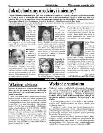 8 NASZA SONDA NOWA gazeta gostyñska 33/06 Jak obchodzimy urodziny i imieniny? Urodziny i imieniny to szczególne dni w roku, kiedy przyjmujemy od najbli¿szych ¿yczenia i obdarowywani jestemy upominkami. Nie da siê ukryæ, i¿ w Polsce bardziej popularny jest zwyczaj obchodzenia imienin. Niektórzy jednak wol¹ uroczyciej wiêtowaæ dzieñ swoich urodzin. Takiej imprezie towarzyszy przewa¿nie tradycyjny tort ozdobiony specjalnymi wieczkami w liczbie odpowiadaj¹cej wiekowi solenizanta. Szczególnie dzieciom ich zdmuchiwanie sprawia du¿¹ frajdê. Zapytalimy przechodniów, w jaki sposób obchodz¹ swoje imieniny i urodziny. Czy urz¹dzaj¹ huczne imprezy, czy raczej skromne uroczystoci, a mo¿e traktuj¹ te dni jak powszednie? Anna Zió³ek, Ewa Dolata, planujê wiêtowaæ te szczególne dla mnie dni Gostyñ Gostyñ w barze lub restauracji. Gdy kto ma uro Jednego roku Zarówno dziny ca³a klasa sk³ada mu wtedy ¿yczenia. obchodzê urourodziny, jak i Solenizant przewa¿nie przynosi w tym dniu dziny, drugiego imieniny mam w cukierki i batony. Bardzo lubiê chodziæ na imieniny. ZapraWigiliê. Jest bar- imprezy imieninowe do cioæ i wujków. Zaszam wtedy kodzo zabawnie, wsze jest kto, z kim mo¿na pogadaæ. le¿anki. Plotkubo do po³udnia jemy i pa³aszujemy tort. Jest bardzo sympa- dostajê od najbli¿szej rodziny i znajomych Maria Gano, tycznie. Gdy kto ma imieniny przynosi dla prezenty imieninowo-urodzinowe, a wieczoGostyñ ca³ej klasy cukierki i s³odycze. rem, po wieczerzy wigilijnej prezenty gwiazd Ma³¿onek, kowe. Wród moich przyjació³ bardziej podzieci i wnuki Ilona Twardow- pularny jest zwyczaj obchodzenia imienin, zawsze pamiêtaska, Gostyñ ani¿eli urodzin. Na takich uroczystociach j¹ o moich uro Swoje urodzi- jest bardzo mi³o i sympatycznie. Mo¿na sodzinach i imieniny, które mam 29 bie spokojnie porozmawiaæ. nach. Jest barczerwca i imiedzo przyjemnie. Nie mam w zwyczaju urz¹niny, które przyAgnieszka Ba- dzania hucznych imprez. S¹ to raczej skromne padaj¹ 18 sierpczyñska, Czar- uroczystoci rodzinne. Dostajê kwiaty, drobne nia, obchodzê w na Woda k. Sta- upominki, które zawsze sprawiaj¹ mi du¿o gronie najbli¿szej rodziny. Czasami zaprarogardu Gdañ- radoci. Tak naprawdê jednak to nie one s¹ szam kolegów i kole¿anki, a mama przygoskiego najwa¿niejsze. Liczy siê pamiêæ i szczere ¿ytowuje mi pyszny tort. Z okazji imienin sk³a Pod koniec czenia. W tym roku bêdê obchodziæ okr¹g³¹ damy sobie w klasie ¿yczenia. Nie ma u nas marca obchodzê rocznicê swoich urodziny. Bêdzie to zatem zwyczaju przynoszenia s³odyczy, jak gdzieswoje urodziny, szczególny dzieñ. niegdzie. Od rodziców dostajê przewa¿nie a w kwietniu imieniny. Do tej pory zapraszaTekst i zdjêcia: AGNIESZKA JAKUBOWSKA na urodziny i imieniny pieni¹dze. ³am kole¿anki do domu. W nastêpnym roku WIADOMOCI Wkrótce jubileusz Jubileusz 60-lecia istnienia obchodzi³ bêdzie Zespó³ Szkó³ Rolniczych im. gen. Józefa Wybickiego w Grabonogu. Uroczystoci oraz zjazd absolwentów zaplanowano na sobotê 16 wrzenia. Osoby, które chc¹ wzi¹æ udzia³ w jubileuszu mog¹ siê zg³aszaæ poprzez odes³anie na adres szko³y ankiety otrzymanej wraz z zaproszeniem lub dostêpnej na stronie internetowej (www.zsrgrab.enter.net.pl). Koszt uczestnictwa w zjedzie wynosi 50 z³ (w tym materia³y zjazdowe i obiad) oraz dodatkowo 30 z³ dla chc¹cych wzi¹æ udzia³ w balu. Pieni¹dze mo¿na wp³acaæ na konto nr 49 8678 0005 0010 0100 0635 0001. Jest te¿ mo¿liwoæ noclegu w internacie, po wczeniejszym zg³oszeniu telefonicznym (tel. 065 5739146-47). Uroczystoci jubileuszowe rozpoczn¹ siê msz¹ w. w bazylice na wiêtej Górze o 10:00. Na 12:00 zaplanowano spotkanie uczestników w szkole. Od 14:00 do 17:00 absolwenci bêd¹ mieli okazjê do spotkañ klasowych. Zjazd zakoñczy bal, który rozpocznie siê o 18:00 i trwa³ bêdzie zapewne do bia³ego rana. (o-HF) Weekend z rzemios³em W pierwszy weekend wrzenia bêdzie kolejna okazja, aby zapoznaæ siê z szerok¹ ofert¹ gostyñskiego rzemios³a. Cech Rzemios³ Ró¿nych wespó³ ze Stowarzyszeniem Wspierania Przedsiêbiorczoci Powiatu Gostyñskiego organizuj¹ 2 i 3 wrzenia IV Wystawê Rzemielnicz¹. Funkcjê salonu wystawienniczego pe³niæ bêdzie ju¿ tradycyjnie hala sportowa Gimnazjum nr 1 w Gostyniu przy ul. Kocielnej. W tym roku ekspozycja odbywa siê pod has³em Cudze chwalicie poznajcie swoje. Wyroby zaprezentuj¹ nasi piekarze, cukiernicy, stolarze, lusarze, krawcowe. Po raz pierwszy wystawa bêdzie mia³a charakter miêdzynarodowy. Swoje produkty zaoferuj¹ gocie z Drezna m.in. stolarz, piekarz, producent urz¹dzeñ grzewczych, wytwórca wyrobów z wikliny. To efekt ubieg³orocznej wizyty w Gostyniu Petera Zogelmana, dyrektora generalnego Drezdeñskiej Izby Rzemielniczej. Wystawie towarzyszyæ bêdzie szereg dodatkowych imprez pokazy, degustacje, konkursy z nagrodami ufundowanymi przez sponsorów. Niew¹tpliw¹ atrakcj¹ bêdzie tramwaj konny. Za niewielk¹ op³at¹ bêdzie mo¿na nim przejechaæ z Góry Zamkowej, gdzie 2 wrzenia zaplanowano obchody Dnia Powiatu, do hali wystawowej i odwrotnie. (o-HF)