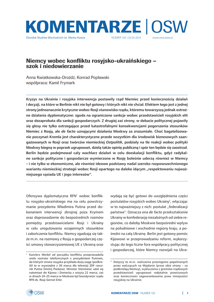 Ośrodek Studiów Wschodnich im. Marka Karpia NUMER 132 | 02.04.2014 www.osw.waw.pl Niemcy wobec konfliktu rosyjsko-ukraińskiego – szok i niedowierzanie Anna Kwiatkowska-Drożdż, Konrad Popławski współpraca: Kamil Frymark Kryzys na Ukrainie i rosyjska interwencja postawiły rząd Niemiec przed koniecznością działań i decyzji, na które w Berlinie nikt nie był gotowy i których nikt nie chciał. Efektem tego jest z jednej strony jednoznacznie krytyczne wobec Rosji stanowisko rządu, któremu towarzyszą jednak ostrożne działania dyplomatyczne: zgoda na ograniczone sankcje wobec przedstawicieli rosyjskich elit oraz dezaprobata dla sankcji gospodarczych. Z drugiej zaś strony, w debacie politycznej pojawiły się głosy nie tylko ostrzegające przed katastrofalnymi konsekwencjami pogorszenia stosunków Niemiec z Rosją, ale de facto uznającymi działania Moskwy za zrozumiałe. Choć bagatelizowanie poczynań Kremla jest charakterystyczne przede wszystkim dla środowisk biznesowych zaangażowanych w Rosji oraz twórców niemieckiej Ostpolitik, podziały na tle reakcji wobec polityki Moskwy biegną w poprzek ugrupowań, dzielą także opinię publiczną i spór ten będzie się zaostrzał. Berlin będzie podejmował cały wachlarz działań w celu deeskalacji konfliktu, gdyż radykalne sankcje polityczne i gospodarcze wymierzone w Rosję boleśnie uderzą również w Niemcy – i nie tylko w ekonomiczne, ale również ideowe podstawy nadal szeroko rozpowszechnionego wariantu niemieckiej strategii wobec Rosji opartego na daleko idącym „respektowaniu najważniejszego sąsiada UE i jego interesów”. Ofensywa dyplomatyczna RFN1 wobec konfliktu rosyjsko-ukraińskiego ma na celu powstrzymanie prezydenta Władimira Putina przed dokonaniem interwencji zbrojnej poza Krymem oraz doprowadzenie do bezpośrednich rozmów pomiędzy przedstawicielami Rosji i Ukrainy w celu uregulowania wzajemnych stosunków i zakończenia konfliktu. Niemcy zgadzają się także m.in. na rozmowy z Rosją o gospodarczej części umowy stowarzyszeniowej UE z Ukrainą oraz Kanclerz Merkel od początku konfliktu przeprowadziła wiele rozmów telefonicznych z prezydentem Putinem, do których strona rosyjska przykłada dużą wagę (podkreślił to w wywiadzie z 30 marca dla telewizji ZDF rzecznik Putina Dmitrij Pieskow). Minister Steinmeier udał się natomiast do Kijowa i Doniecka z wizytą 22 marca, zaś w dniach 24–25 marca w Moskwie był koordynator rządu RFN ds. Rosji Gernot Erler. wydają się być gotowi do uwzględnienia części postulatów rosyjskich wobec Ukrainy2, włączając w to najważniejszy z nich: postulat „federalizacji państwa”. Oznacza ona de facto przekształcenie Ukrainy w konfederację niezależnych od siebie regionów, co dałoby Moskwie bezpośredni wpływ na południowe i wschodnie regiony kraju, a pośredni na całą Ukrainę. Berlin jest gotowy pomóc Kijowowi w przeprowadzaniu reform, wykorzystując do tego liczne fora współpracy politycznej i gospodarczej, które Niemcy rozwijali na Ukra- 1 Dotyczy to m.in. rozliczenia przestępstw popełnionych przez walczących na Majdanie (przez obie strony – co podkreślają Niemcy), wykluczenia z gremiów rządowych przedstawicieli ugrupowań radykalnie prawicowych oraz konieczności zagwarantowania praw mniejszości rosyjskiej na Ukrainie. 2 KOMENTARZE OSW NUMER 132 1 inie od połowy lat 90., oraz w stabilizacji sytuacji finansowej – przede wszystkim w ramach MFW i UE. Warunkiem udzielenia pomocy ma być zobowiązanie Ukrainy do przyjęcia pakietu reform strukturalnych. Niemcy wspierali dotąd zarówno plan UE udzielenia natychmiastowej pomocy finansowej Ukrainie, jak i kredytów w wysokości 15 mld euro w ciągu kolejnych lat oraz otwarcia rynku wewnętrznego UE dla przedsiębiorstw z Ukrainy. Berlin oferuje także zwiększenie środków w ramach pomocy rozwojowej o 20 mln euro rocznie (w 2011 roku pomoc ta wyniosła 33 mln euro). wać relacje polityczne i gospodarcze zarówno na płaszczyźnie bilateralnej, jak i pomiędzy UE a Rosją. Ma to służyć także zwiększeniu globalnej roli Unii Europejskiej, a tym samym realizacji interesów politycznych i gospodarczych Niemiec jako przewodniego państwa UE. Silna W konflikcie rosyjsko-ukraińskim niemiecki rząd prezentuje jednoznacznie krytyczne stanowisko wobec Rosji, któremu towarzyszą jedynie ostrożne działania dyplomatyczne. Uwarunkowania niemieckiego stanowiska Niemieckie stanowisko wobec konfliktu rosyjsko-ukraińskiego jest pokłosiem zmian, jakie zachodzą w ostatnich latach na wewnętrznej scenie politycznej w RFN oraz w niemieckiej opinii publicznej dotyczących polityki wobec Rosji. W debacie na ten temat ścierają się dwa podejścia. Zwolennicy pierwszego kultywują główne założenia niemieckiej Ostpolitik z lat 70. („zmiana poprzez zbliżenie”) z jej późniejszymi wariacjami, tj. neue Ostpolitik czy Partnerstwo dla Modernizacji („zmiana poprzez powiązania”). Według nich Rosja postrzegana jest jako kluczowy partner geopolityczny Unii Europejskiej, z którym współpraca jest konieczna dla utworzenia stabilnego ładu bezpieczeństwa europejskiego3. Strategiczne partnerstwo z Rosją, nawet za cenę ustępstw, traktowane jest przez nich jako warunek stabilności w Europie, szczególnie wobec wyzwań w sferze bezpieczeństwa na obszarze postsowieckim, który jest uważany za naturalną „strefę wpływów” Rosji. W celu urzeczywistnienia takiej współpracy z Rosją należy zinstytucjonalizo- Niemcy dotąd konsekwentnie dążyły do współpracy z Rosją na obszarze Europy Wschodniej, która opierała się np. na włączaniu Moskwy w próby stabilizacji regionu (np. tzw. proces meseberski), a nie na jej antagonizowaniu (stąd stanowczy sprzeciw Merkel wobec możliwości objęcia Ukrainy Planem Działań na rzecz Członkostwa na szczycie NATO w 2008 roku). 3 ekonomizacja stosunków niemiecko-rosyjskich jest w takim myśleniu czynnikiem pozytywnym
