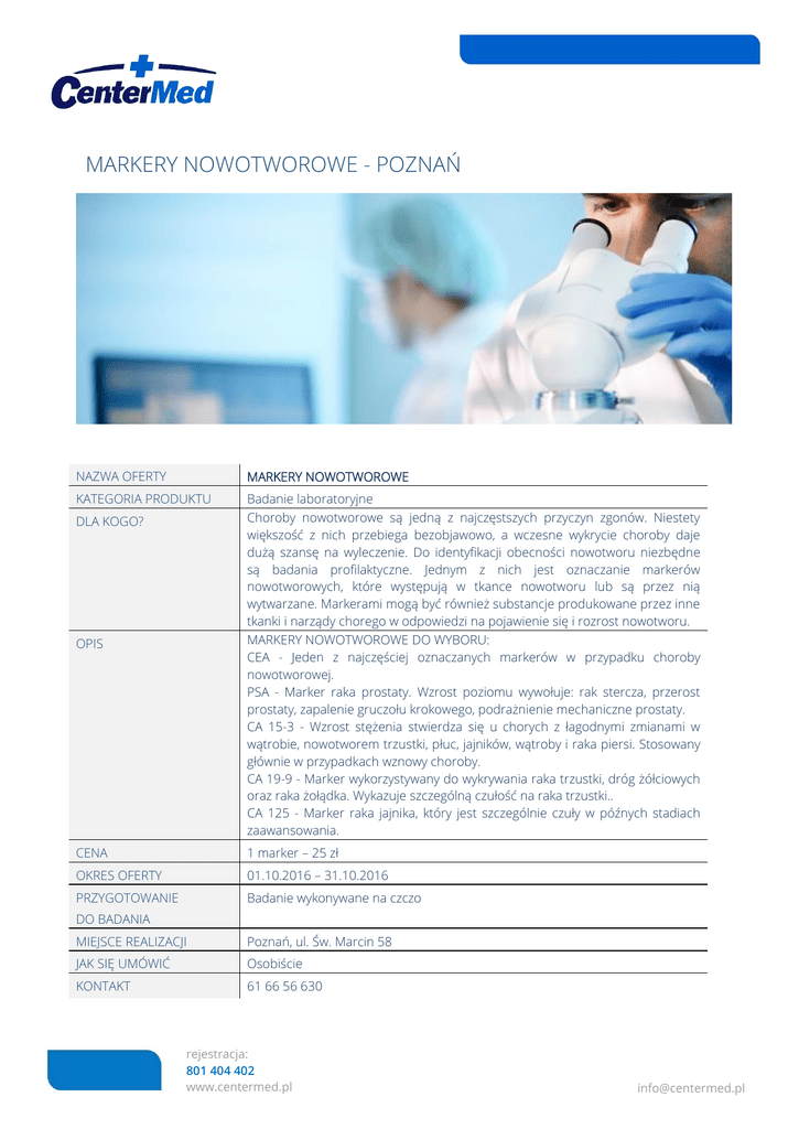 MARKERY NOWOTWOROWE - POZNAŃ NAZWA OFERTY MARKERY NOWOTWOROWE KATEGORIA PRODUKTU Badanie laboratoryjne Choroby nowotworowe są jedną z najczęstszych przyczyn zgonów. Niestety większość z nich przebiega bezobjawowo, a wczesne wykrycie choroby daje dużą szansę na wyleczenie. Do identyfikacji obecności nowotworu niezbędne są badania profilaktyczne. Jednym z nich jest oznaczanie markerów nowotworowych, które występują w tkance nowotworu lub są przez nią wytwarzane. Markerami mogą być również substancje produkowane przez inne tkanki i narządy chorego w odpowiedzi na pojawienie się i rozrost nowotworu. MARKERY NOWOTWOROWE DO WYBORU: CEA - Jeden z najczęściej oznaczanych markerów w przypadku choroby nowotworowej. PSA - Marker raka prostaty. Wzrost poziomu wywołuje: rak stercza, przerost prostaty, zapalenie gruczołu krokowego, podrażnienie mechaniczne prostaty. CA 15-3 - Wzrost stężenia stwierdza się u chorych z łagodnymi zmianami w wątrobie, nowotworem trzustki, płuc, jajników, wątroby i raka piersi. Stosowany głównie w przypadkach wznowy choroby. CA 19-9 - Marker wykorzystywany do wykrywania raka trzustki, dróg żółciowych oraz raka żołądka. Wykazuje szczególną czułość na raka trzustki.. CA 125 - Marker raka jajnika, który jest szczególnie czuły w późnych stadiach zaawansowania. DLA KOGO? OPIS CENA 1 marker – 25 zł OKRES OFERTY 01.10.2016 – 31.10.2016 PRZYGOTOWANIE Badanie wykonywane na czczo DO BADANIA MIEJSCE REALIZACJI Poznań, ul. Św. Marcin 58 JAK SIĘ UMÓWIĆ Osobiście KONTAKT 61 66 56 630 rejestracja: 801 404 402 www.centermed.pl [email protected]