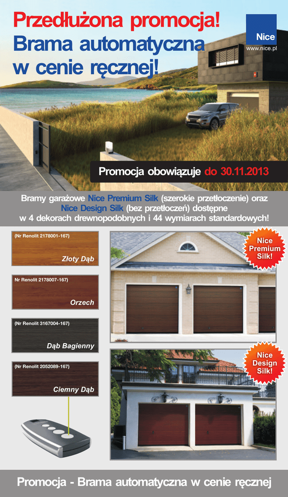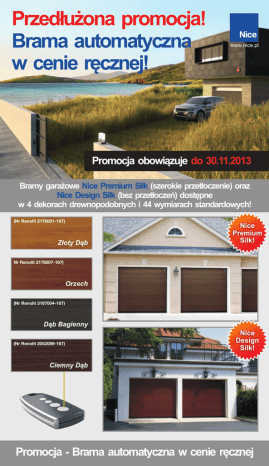 Przed³u¿ona promocja! Brama automatyczna w cenie rêcznej! www.nice.pl Promocja obowi¹zuje do 30.11.2013 Bramy gara¿owe Nice Premium Silk (szerokie przet³oczenie) oraz Nice Design Silk (bez przet³oczeñ) dostêpne w 4 dekorach drewnopodobnych i 44 wymiarach standardowych! (Nr Renolit 2178001-167) Z³oty D¹b Nice Premium Silk! Nr Renolit 2178007-167) Orzech (Nr Renolit 3167004-167) D¹b Bagienny (Nr Renolit 2052089-167) Nice Design Silk! Ciemny D¹b Promocja - Brama automatyczna w cenie rêcznej www.nice.pl Brama automatyczna w cenie rêcznej Z³oty D¹b Orzech D¹b Bagienny Ciemny D¹b Brama automatyczna Premium Silk Brama automatyczna Design Silk Wymiar otworu szer. x wys. (mm) Brama automatyczna Premium Silk z napêdem KINGgates cena netto Brama automatyczna Design Silk z napêdem KINGgates cena netto 2400 x 2000 3 140 3 210 2400 x 2125 3 230 3 250 2400 x 2250 3 350 3 380 2400 x 2375 3610* 3 600* 2500 x 2000 3 230 3 300 2500 x 2125 3 320 3 330 2500 x 2250 3 450 3 480 2500 x 2375 3710* 3 740* 2600 x 2000 3 360 3 390 2600 x 2125 3 470 3 510 2600 x 2250 3 570 3 610 2600 x 2375 3790* 3 840* 2750 x 2000 3 520 3 550 2750 x 2125 3 620 3 640 2750 x 2250 3 720 3 780 2750 x 2375 4000* 4 000* 3000 x 2000 3 770 3 790 3000 x 2125 3 870 3 900 3000 x 2250 3 970 4 020 3000 x 2375 4210* 4 240* 3250 x 2000 3 990 4 040 3250 x 2125 4 150 4 170 3250 x 2250 4 280 4 310 3500 x 2000 4 160 4 220 3500 x 2125 4 340 4 370 3500 x 2250 4 480 4 510 3750 x 2000 4 410 4 470 3750 x 2125 4 600 4 620 3750 x 2250 4 860 4 890 4000 x 2000 4 600 4 660 4000 x 2125 4 890 4 850 4000 x 2250 5 030 5 040 4250 x 2000 4 990 5 050 4250 x 2125 5 170 5 210 4250 x 2250 5 370 5 410 4500 x 2000 5 180 5 230 4500 x 2125 5 290 5 330 4500 x 2250 5 510 5 560 4750 x 2000 5 650 5 700 4750 x 2125 5 760 5 780 4750 x 2250 5 910 5 950 5000 x 2000 5 800 5 850 5000 x 2125 5 910 5 950 5000 x 2250 6 150 6 200 OVO 550 ROLLS 700 * W przypadku bramy automatycznej Premium o wys. 2375 mm wyposa¿onej w napêd OVO konfiguracja z prowadzeniem obni¿onym LH jest niedostêpna. Dekory drewnopodobne GRUPA I: • Z³oty D¹b (Nr Renolit 2178001-167) • Orzech (Nr Renolit 2178007-167) • D¹b Bagienny (Nr Renolit 3167004-167) • Ciemny D¹b (Nr Renolit 2052089-167) Standardowe wyposa¿enie bram automatycznych: • bez klamki zewnêtrznej i zamka, • wewnêtrzny rygiel blokuj¹cy. Przy wyborze opcji „Klamka zewnêtrzna z zamkiem” brama bez wewnêtrznego rygla blokuj¹cego. OPCJE DO BRAM AUTOMATYCZNYCH • Klamka zewnêtrzna z zamkiem (kolor czarny) - konieczna do wysprzêglania awaryjnego z zewn¹trz. Przy tej konfiguracji bez rygla 179,00 netto wewnêtrznego 50,00 netto • Uchwyt dwustronny w kolorze czarnym • Wysprzêglanie awaryjne z zewn¹trz: 75,00 netto - SPA2 (Ovo) pod klamkê 80,00 netto - SBLO 01 (Rolls) pod klamkê - SBLO 500 (w otworze panelu bramy) 80,00 netto • Dop³ata za obni¿one nadpro¿e (sprê¿yny skrêtne z ty³u) min. 120/130 mm • Dodatkowy rygiel wewnêtrzny lub do bramy z zamkiem 250,00 netto 35,00 netto 65,00 netto • Pilot 4-kana³owy STYLO4K • Radioodbiornik uniwersalny 2-kana³owy 185,00 netto FRED MYO 2 180,00 netto • Fotokomórki VIKY 11 • Lampa sygnalizacyjna 12V IDEA 12 PLUS (OVO) 90,00 netto (z wbudowan¹ anten¹) • Lampa sygnalizacyjna 24V IDEA 24 PLUS (ROLLS 700) 90,00 netto (z wbudowan¹ anten¹) • Zestaw akumulatorów 24V z kart¹ ³adowania 250,00 netto • K¹townik do monta¿u bocznego 8,00 netto/szt. prowadnicy pionowej • K¹townik perforowany o d³ugoœci 55,00 netto/szt. L = 2000 mm • Uchwyt listwy nadpro¿owej. Przeznaczenie do nadpro¿y ocieplonych styropianem - maksymalnie 90 mm 10,00 netto/szt. (optymalne zastosowanie co 50 cm) KOMPLETACJA NAPÊDÓW DO BRAM AUTOMATYCZNYCH OVO • Zastosowanie w bramach automatycznych Premium Silk do 3500 x 2000 mm, • Si³ownik o sile uci¹gu 550N, • Jednoelementowa szyna prowadz¹ca GRO13 o d³. 3m z paskiem zbrojonym, • Centrala steruj¹ca Star OVO, • Wbudowany radioodbiornik (433,92 Mhz) kompatybilny ze wszystkimi pilotami KINGgates • Pilot 4-kana³owy STYLO 4K – 1 szt., • Wbudowane oœwietlenie – ¿arówka 12V (21W), • Autoprogramowanie, • Amperometryczny system wykrywania przeszkody, • Zwolnienie prêdkoœci podczas otwierania i zamykania bramy, • Wspó³praca z fotokomórkami VIKY 11 (opcja). ROLLS 700 • Zastosowanie w bramach automatycznych Premium Silk od 3500 x 2125 mm do 5000 x 2250 mm, • Si³ownik o sile uci¹gu 700N, • Jednoelementowa szyna prowadz¹ca GRB3 o d³. 3m z paskiem zbrojonym, • Centrala steruj¹ca GDO 100, • Wbudowany radioodbiornik (433,92 MHz) kompatybilny ze wszystkimi pilotami KINGgates, • Pilot 4-kana³owy STYLO 4K – 1 szt., • Wbudowane oœwietlenie – ¿arówka 230V (15W), • Innowacyjny system wysprzêglania rêcznego pracuj¹cy w trybie automatycznym i rêcznym, • Opcjonalnie mo¿liwoœæ wspó³pracy z akumulatorem BAT 12K, • Regulacja prêdkoœci, czu³oœci na przeszkody, • Regulowane zwolnienie prêdkoœci podczas otwierania i zamykania bramy, • Wspó³praca z fotokomórkami VIKY 11 (opcja).