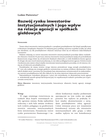 A Lesław Pietrewicz* Rozwój rynku inwestorów instytucjonalnych i jego wpływ na relacje agencji w spółkach giełdowych Streszczenie Temat relacji inwestorów instytucjonalnych z zarządami przedsiębiorstw był dotąd zaniedbywany w literaturze zarządzania i finansów. W niniejszej pracy próbuję częściowo wypełnić tę lukę. Jej celem jest określenie, czy dla przedsiębiorstw własność instytucji różni się od własności indywidualnych inwestorów. Badania wskazują, że wzrost znaczenia inwestorów instytucjonalnych powoduje dalsze rozdzielenie własności i kontroli. Po pierwsze, interesy inwestorów instytucjonalnych, będących pośrednikami finansowymi, mogą różnić się od interesów finalnych właścicieli, co rodzi dodatkowe koszty agencji. Po drugie, decyzje owych instytucji pokazują, że one także podlegają kosztom agencji. Zróżnicowanie i konkurencyjna natura relacji między inwestorami instytucjonalnymi powoduje, że ich interesy różnią się od interesów przedsiębiorstwa. Paradoksalnie do miana stróżów owego interesu pretendować mogą zarządy przedsiębiorstw. W tym celu realizują one strategie giełdowe zorientowane na zmianę struktury akcjonariatu. Celem takich działań może i powinno być pozyskanie bazy akcjonariuszy zorientowanych na maksymalizację wartości przedsiębiorstwa lub zbyt słabych, by się temu interesowi skutecznie przeciwstawiać. Najważniejszym wnioskiem płynącym z pracy jest stwierdzenie, że ekonomiczna teoria agencji w niedoskonały sposób opisuje ład korporacyjny we współczesnych realiach i potrzebne jest wypracowanie nowej teorii. Słowa kluczowe: inwestorzy instytucjonalni, koncentracja własności, koszty agencji, strategie giełdowe Wstęp W ciągu ostatniego ćwierćwiecza na rynkach akcji krajów rozwiniętych zaszły ogromne zmiany. Bodaj najbardziej widoczną z nich była zmiana struktury tych rynków, polegająca na gwałtownym wzroście znaczenia instytucjonalnych form inwestowania. Dynamiczny wzrost rynku powiernictwa finansowego i na- silenie konkurencji między podmiotami operującymi na tym rynku nie mogły pozostać bez wpływu na praktykę relacji między akcjonariuszami a zarządami przedsiębiorstw (sferę agencji). Celem niniejszej pracy jest wyjaśnienie konsekwencji wzrostu siły inwestorów instytucjonalnych jako grupy, a także analiza wpływu na owe konsekwencje * Dr Lesław Pietrewicz — Instytut Nauk Ekonomicznych PAN, e-mail: [email protected]. Zarządzanie Zmianami. Zeszyty Naukowe 3/2010 (21) www.pou.pl 1 Z Z / zróżnicowania między tymi inwestorami. Konstrukcja pracy i zastosowana metodologia służą identyfikacji i wyjaśnieniu mechanizmów odpowiedzialnych za obserwowane procesy, co ma służyć uzyskaniu możliwie uniwersalnego obrazu. Podstawą analiz są dane z amerykańskiego rynku giełdowego, co wynika z jego najwyższego poziomu rozwoju, przekładającego się na stopień zaawansowania omawianych procesów. Dodatkowo na korzyść takiego podejścia świadczy największa dostępność materiałów. Kwestia bazy informacyjnej jest nie do przecenienia, szczególnie w odniesieniu do badań nastawionych na rozwój teorii mających wyjaśniać procesy zachodzące w szczególnie dynamicznie zmieniającej się sferze życia gospodarczego, za jaką należy uznać rynki finansowe w ostatnich latach. Koncentracja na mechanizmach pozwala z kolei na odniesienie uzyskanych wyników do różnych kontekstów instytucjonalnych i konkurencyjnych poszczególnych krajów (w tym Polski) i formułowanie hipotez badawczych dotyczących ich funkcjonowania w różnych warunkach instytucjonalnych. Tak więc mimo że polski rynek akcji pozostaje daleko w tyle za rynkami Stanów Zjednoczonych czy Wielkiej Brytanii, zależności i zjawiska wywołujące określone procesy zachodzące na tych rynkach pozwalają lepiej zrozumieć, w jakim stadium rozwoju obecnie znajduje się nasz rynek, ocenić perspektywy zmian w przyszłości i przewidzieć, przed jakimi problemami i wyzwaniami może stanąć. Podejście takie pomoże także przygotować się na spodziewane zmiany, tym samym służąc jakości rozwoju polskiego rynku kapitałowego. Fundamentalne pytanie, jakie postawiłem, brzmi: czy dla przedsiębiorstw 2 własność instytucji różni się od własności indywidualnych inwestorów? Innymi słowy, jaką rolę pełnią dziś inwestorzy instytucjonalni i co z tego wynika dla funkcjonowania spółek giełdowych? Temat relacji inwestorów instytucjonalnych z zarządami przedsiębiorstw był dotąd zaniedbywany w literaturze zarządzania, ekonomii i finansów. Badania empiryczne inwestorów instytucjonalnych koncentrowały się niemal wyłącznie na statystycznej analizie relacji między charakterystykami inwestorów i wynikami przedsiębiorstw lub też na obszarze aktywizmu inwestorów i jego efektach. Obszar badawczy tej pracy dotyczy natomiast — i ogranicza się do — sfery agencji w przedsiębiorstwach i nie obejmuje innych możliwych konsekwencji, jak np. wpływu na wyniki przedsiębiorstw czy kursy akcji. Pierwsza część pracy ma charakter wyraźnie odmienny od pozostałych i przedstawia fakty obrazujące rosnącą rolę inwestorów instytucjonalnych na amerykańskim rynku akcji. W drugiej części wprowadzam w zarysie teorię agencji, stanowiącą dominującą w naukach ekonomicznych perspektywę badawczą relacji między właścicielami i zarządami przedsiębiorstw, a także wskazuję na konieczność wprowadzenia do niej głębokich modyfikacji dostosowujących ją do realiów współczesnych rynków finansowych. Teoria ta odnosi się modelowo do sytuacji znacznego rozproszenia akcjonariatu, co rodzi pytania o jej aplikację do warunków rosnącej dzięki sukcesowi instytucjonalnych form inwestowania koncentracji własności. W trzeciej części pracy analizuję kwestię obowiązków inwestorów, co wynika z konieczności rozszerzenia zastosowania teorii agencji na relacje międz
