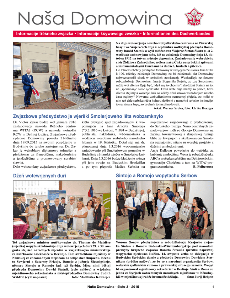 Na dnju wotewrjenja noweho wobydlerskeho centruma na Piwarskej hasy 1 we Wojerecach dnja 4. septembra wotkryštaj předsyda Domowiny Dawid Statnik a wyši měšćanosta Wojerec Stefan Skora (1. a 2. wotlěwa) wobnowjenu taflu, kiž na załoženje Domowiny dnja 13. oktobra 1912 na tutym městnje dopomina. Zarjadowanje wobrubichu chór Židźino a Zahrodnikec sotře a mać z Ćiska ze serbskimi spěwami a instrumentalnymi kruchami na dudach, huslach a pišćałce. Do toho wuzběhny předsyda Domowiny w swojej narěči słowa Jana Nuka k 100. róčnicy załoženja Domowiny, zo bě załoženski akt Domowiny najwuznamniši skutk w serbskich stawiznach. Wuchadźejo ze słowow sobuzałožerja Domowiny, fararja Bogumiła Šwjele, zo „ze Serbstwom móže wot dźensa lěpje być, hdyž my to chcemy“, skedźbni Statnik na to, zo „spominanje same njedosaha. Dźeń wote dnja mamy so prašeć, hdźe dźensa stejimy a wosebje, kak so kóždy dźeń znowa wužadanjam našeho časa stajimy.“ Nowemu wobydlerskemu centrumej přeješe, zo móhł w nim tež dale serbsku rěč a kulturu dožiwić a namołwi serbske institucije, towarstwa a župy, zo bychu k tomu přinošowali. tekst: Werner Sroka, foto: Ulrike Herzger Zwjazkowe předsydstwo je wjerški Smolerjoweho lěta wobzamknyło Dr. Victor Zakar budźe wot januara 2016 zastupowacy nawoda Rěčneho centruma WITAJ (RCW) a nawoda wotnožki RCW w Delnjej Łužicy. Zwjazkowe před sydstwo Domowiny powoła 31-lětneho dnja 19.09.2015 na swojim posedźenju w Budyšinje do tutoho zastojnstwa. Dr. Zakar je wukubłany diplomowy tołmačer a přełožowar za francošćinu, makedonšćinu a jendźelšćinu a promowowany sorabist/ slawist. Dale wobzamkny zwjazkowe předsydstwo, klětu přewjesć rjad zarjadowanjow k wo pomnjeću na Jana Arnošta Smolerja (*3.3.1816 we Łućom, 1884 w Budyšinje), publicista, nakładnika, wědomostnika a wodźacu wosobinu serbskeho narodneho hibanja w 19. lětstotku. Dotal stej mj. dr. planowanej dnja 3.3.2016 wopomnjenske zarjadowanje při Smolerjowym pomniku w Budyšinje a čitanski wječor w Smolerjec kniharni. Dnja 5.3.2016 budźe kładźenje wěnca při jeho rowje na Budyskim Hrodźišku a po tym přeproša Maćica Serbska na swjedźenske zarjadowanje z přednoškomaj do Serbskeho muzeja. Nimo centralnych za rjadowanjow měli so čłonojo Domowiny na župnej, towarstwowej a skupinskej runinje bliže ze žiwjenjom a skutkowanjom Smolerja zeznajomić; witane su wosebje projekty z dźěćimi a młodostnymi. Antje Kellowu powołachu do wuběrka za kubłanje a młodźinu. Wona je sobudźěłaćerka ABC a wučerka serbšćiny na Delnjoserbskim gymnaziju Choćebuz a tam za WITAJ-program zamołwita. B. Felberowa Dźeń wotewrjenych duri Sintojo a Romojo wopytachu Serbow Tež zwjazkowy minister nutřkowneho dr. Thomas de Maizière (srjedźa) wopyta składnostnje dnja wotewrjenych duri 29. a 30. awgusta stejišćo narodnych mjeńšin w Zwjazkowym ministerstwje za nutřkowne naležnosće w Berlinje. Tam awtochtone mjeńšiny w Němskej ze zhromadnym stejišćom na sebje skedźbnjachu. Běchu to Sewjerni a Saterscy Frizojo, Danojo z južneje Šleswigskeje, němscy Sintojo a Romojo kaž tež Serbja. Mjez nimi běštaj předsyda Domowiny Dawid Statnik (cyle nalěwo) a wjednica mjeńšinoweho sekretariata a městopředsydka Domowiny Judith Wałdźic (cyle naprawo). foto: Madlenka Kowarjec Wosom čłonow předsydstwa a sobudźěłaćerjo Krajneho zwjazka Sintow a Romow Badensko-Württembergskeje pod nawodom předsydy krajneho zwjazka Daniela Straußa (prědku naprawo) wopytachu njedawno Łužicu. 14. awgusta zetka so delegacija w Budyskim Serbskim domje z předsydu Domowiny Dawidom Statnikom (prědku nalěwo), zo by so z narodnej organizaciju Serbow, serbskim sydlenskim rumom a prawniskej situaciju zeznała. Wopyt bě organizował mjeńšinowy sekretariat w Berlinje. Sinti a Roma su jedna ze štyrjoch awtochtonych narodnych mjeńšinow w Němskej, kiž w mjeńšinowej radźe hromadźe dźěłaja. foto: Jurij Helgest Naša Domowina - čisło 3 - 2015 1 ZETKANJA Lětni swjedźeń w Praze z temu „Hornja Łužica“ Sławu za Korlu Tillicha Wot 29. do 30. awgusta přeprosy zastupni stwo Swobodneho stata Sakskeje do Łužiskeho seminara w Praze swojich pře ćelow, partnerow a zastupjerjow z politiki na lětni swjedźeń. Kóždolětnje předstaji so při tutej składnosći jedyn region swobodneho stata - lětsa běše to Hornja Łužica. Za wuhotowanje dósta Marketingowa towaršnosć Hornja Łužica-Delnja Šleska nadawk prezentacije a organizacije zarjadowanja, štož derje zmištrowa. K wotewrjenju sobotu Sylwija Panoša ze Serbskeho kulturneho centruma Slepo hosći z chlěbom a selu při durjach Serbskeho seminara witaše. Tež městoprezidentka Sakskeho krajneho sejma Andrea Dombois, Kristina Larischová z wonkowneho ministerstwa Čěskeje republiki, Stefanie Rehm a dr. David Michel ze sakskeho zastupnistwa hosći witachu. Domowinu zastupowaštaj čłon zwjazkoweho předsydstwa Jurij Łušćanski a referent za kulturu a wukraj Clemens Škoda. Krajny rada wokrjesa Budyšin Michael Harig postrowi přitomnych štyrirěčnje a wuzběhny wosebitosć Hor njeje Łužicy, kotraž je přez swoju jónkrótnu bikulturelnosć samozrozumliwje do cyłkowneje Europy splećena. Wot 13 hodź. běštej dwór a dom za zjawnosć přistupnej. Tež Společnost přátel Lužice/Towarstwo přećelow Serbow (SPL/TPS) zarjadowanje sylnje sobu podpěraše. Tak organizowachu wosebje woni serbske wobsahi w ramiku tutoho kónc tydźenja, kaž prapremjeru trikoweho filma wo Pumpoće, čitanje awtorow Milana Hrabala a Tomasza Nawki, kotryž nimo toho přeco zaso z dudami při puću stejo na zarjadowanje wabješe. Přewodźanaj buštaj wot skupiny Młokawa z Walburgu Wałdźic a Maxom Loebom. Surealne zynki na gitarje a wobkuzłacy hłós młodeje spěwarki přiwabi tójšto připosłucharjow do čitarnje Łužiskeho seminara. Nimo dalšich přednoškow a koncertow s