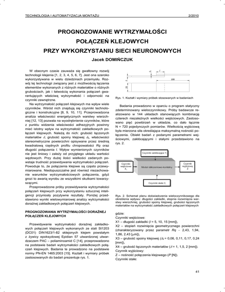 TECHNOLOGIA I AUTOMATYZACJA MONTAŻU 2/2010 PROGNOZOWANIE WYTRZYMAŁOŚCI POŁĄCZEŃ KLEJOWYCH PRZY WYKORZYSTANIU SIECI NEURONOWYCH Jacek DOMIŃCZUK W obecnym czasie zauważa się gwałtowny rozwój technologii klejenia [1, 2, 3, 4, 5, 6, 7]. Jest ona szeroko wykorzystywana w wielu dziedzinach przemysłu. Rozwój tej technologii związany jest z możliwością łączenia elementów wykonanych z różnych materiałów o różnych grubościach, jak i łatwością wykonania połączeń gwarantujących właściwą wytrzymałość i odporność na czynniki zewnętrzne. Na wytrzymałość połączeń klejowych ma wpływ wiele czynników. Wśród nich znajdują się czynniki technologiczne i konstrukcyjne [8, 9, 10, 11]. Przeprowadzona analiza właściwości energetycznych warstwy wierzchniej [12, 13] pozwala na wyodrębnienie czynników, które z punktu widzenia właściwości adhezyjnych powinny mieć istotny wpływ na wytrzymałość zakładkowych połączeń klejowych. Należą do nich: grubość łączonych materiałów , grubość spoiny klejowej k, właściwości stereometryczne powierzchni opisywane przez średnią kwadratową rzędnych profilu chropowatości Rq oraz długość połączenia l. Wpływ wymienionych czynników nie jest liniowy i zależy od przyjętego układu wartości węzłowych. Przy dużej ilości wielkości zadanych powstaje trudność przewidywania wytrzymałości połączeń. Powoduje to, że połączenia klejowe są często przewymiarowane. Niedopuszczalne jest również niezachowanie warunków wytrzymałościowych połączenia, gdyż grozi to awarią wyrobu ze wszystkimi skutkami towarzyszącymi. Przeprowadzone próby przewidywania wytrzymałości połączeń klejowych przy wykorzystaniu sztucznej inteligencji przyniosły pozytywne rezultaty. Poniżej przedstawiono wyniki wielowymiarowej analizy wytrzymałości doraźnej zakładkowych połączeń klejowych. PROGNOZOWANIA WYTRZYMAŁOŚCI DORAŹNEJ POŁĄCZEŃ KLEJOWYCH Przewidywanie wytrzymałości doraźnej zakładkowych połączeń klejowych wykonanych ze stali St1203 (DC01) DIN1623/1-82 sklejonych klejem powstałym z żywicy epoksydowej Epidian 57 utwardzonej utwardzaczem PAC – poliaminoamid C [14], przeprowadzono na podstawie badań wytrzymałości zakładkowych połączeń klejowych. Badania te prowadzono na podstawie normy PN-EN 1465:2003 [15]. Kształt i wymiary próbek zastosowanych do badań prezentuje rys. 1. Rys. 1. Kształt i wymiary próbek stosowanych w badaniach Badania prowadzono w oparciu o program statyczny zdeterminowany wieloczynnikowy. Próby badawcze realizowano w 144 układach stanowiących kombinację czterech niezależnych wielkości wejściowych. Zastosowano pięć powtórzeń w układzie, co dało łącznie N = 720 pojedynczych pomiarów. Wielkością wyjściową była mierzona siła określająca maksymalną nośność połączenia. Obiekt badań z podanymi parametrami wejściowymi, zakłócającymi i stałymi przedstawiono na rys. 2. Czynniki zakłócające Y k Czynniki wejściowe Xn Moduł obliczeniowo-kontrolny Czynnik wyjściowy Z Czynniki stałe Ci Rys. 2. Schemat planu doświadczenia wieloczynnikowego dla określenia wpływu: długości zakładki, stopnia rozwinięcia warstwy wierzchniej, grubości spoiny klejowej, grubości łączonych materiałów na wytrzymałość zakładkowych połączeń klejowych gdzie: Czynniki wejściowe: X1 – długość zakładki (l = 5, 10, 15 [mm]), X2 – stopień rozwinięcia geometrycznego powierzchni (charakteryzowany przez parametr Rq 2,43, 1,94, 1,86, 2,43 [m]), X3 – grubość spoiny klejowej (k = 0,06, 0,11, 0,17, 0,24 [mm]), X4 – grubość łączonych materiałów ( = 1, 1,5, 2 [mm]). Czynnik wyjściowy: Z – nośność połączenia klejowego (P [N]). Czynniki stałe: 41 2/2010 C1 – rodzaj materiału łączonego (St1203 (DC01) DIN1623/1-82; blacha o wymiarach 100 x 25 x ), C2 – czas utwardzania (72 h), C3 – rodzaj zastosowanego kleju (Epidian 57/PAC100/80), C4 – temperatura w czasie badań (20 ± 2 [oC]), C5 – wilgotność w czasie badań (40 ± 5 [%]), C6 – rodzaj odtłuszczacza (Loctite 7061). Czynniki zakłócające: Y1 – niepowtarzalność warunków pomiaru, Y2 – niepowtarzalność technologii wykonania połączenia, Y3 – niedokładność stanowisk pomiarowych, Y4 – niedokładność pomiaru. Uzyskane dane pomiarowe zostały podzielone na grupy do uczenia, walidacji i testowania sieci neuronowej. Złożoność sieci została określona automatycznie. W czasie analizy przetestowano 427 sieci. Przeprowadzona analiza efektywności najlepszej znalezionej sieci wykazała jej poprawność. Poszukiwania przeprowadzono pięciokrotnie dla różnej kombinacji doboru danych wejściowych, stosując metodę ich mieszania. Uzyskane wyniki w poszczególnych próbach były do siebie zbliżone, za każdym razem sugerowaną siecią była sieć MLP – perceptron wielowarstwowy o strukturze (4:4-111:1). Sieć ta była uczona z wykorzystaniem algorytmu CG – Gradientów Sprzężonych (Conjugate Gradient Descent), z logistyczną funkcją aktywacji neuronów warstwy ukrytej oraz liniową z nasyceniem funkcją aktywacji warstwy wejściowej i wyjściowej przy zastosowaniu liniowej funkcji potencjału postsynaptycznego [16, 17, 18, 19]. Schemat strukturalny sieci przedstawiono na rys. 3. Rys. 3. Schemat strukturalny sieci MLP (4:4-11-1:1) W tab. 1 zamieszczono wyniki statystyk regresyjnych prezentowanej sieci MLP. Gdzie: Średnia: średnia wartość zmiennej wyjściowej obliczona na podstawie zadanych wartości tej zmiennej, zgromadzonych – odpowiednio – w zbiorze uczącym, walidacyjnym lub testowym. Odchylenie standardowe: odchylenie standardowe obliczone dla zadanych wartości zmiennej wyjściowej. Średni błąd: średni błąd (rozumiany jako moduł różnicy pomiędzy wartością oczekiwaną i wartością uzyskaną na wyjściu) dla zmiennej wyjściowej. 42 TECHNOLOGIA I AUTOMATYZACJA MONTAŻU Odchylenie standardowe błędu: odc
