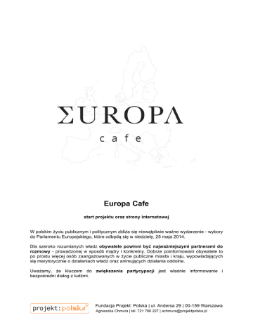 Europa Cafe start projektu oraz strony internetowej W polskim życiu publicznym i politycznym zbliża się niewątpliwie ważne wydarzenie - wybory do Parlamentu Europejskiego, które odbędą się w niedzielę, 25 maja 2014. Dla szeroko rozumianych władz obywatele powinni być najważniejszymi partnerami do rozmowy - prowadzonej w sposób mądry i konkretny. Dobrze poinformowani obywatele to po prostu więcej osób zaangażowanych w życie publiczne miasta i kraju, wypowiadających się merytorycznie o działaniach władz oraz animujących działania oddolne. Uważamy, że kluczem do zwiększenia partycypacji jest właśnie informowanie i bezpośredni dialog z ludźmi. Fundacja Projekt: Polska | ul. Andersa 29 | 00-159 Warszawa Agnieszka Chmura | tel. 721 766 227 | [email protected] Czym jest „Europa Cafe”? Europa Cafe to cykl 10 spotkań z kandydatkami i kandydatami na posłów do Parlamentu Europejskiego, który odbędzie się w 8 miastach Polski. Harmonogram przewiduje następujące debaty: 1 / Warszawa / 15.04 wtorek / Młodzi na rynku pracy. 2 / Bydgoszcz / 23.04 środa / Rewitalizacja i zrównoważony rozwój miast. 3 / Szczecin / 24.04 czwartek / Polityka transportowa i energetyczna Unii Europejskiej. 4 / Poznań / 29.04 wtorek / Innowacyjna gospodarka. 5 / Rzeszów / 06.05 wtorek / Polityka Wschodnia w UE. 6 / Warszawa / 08.05 czwartek / UE2030 – wizja rozwoju organizacji oraz polityka zagraniczna. 7 / Katowice / 13.05 wtorek / Ochrona środowiska a rozwój regionalny. 8 / Lublin / 15.05 czwartek / Wspólna polityka rolna w UE. 9 / Kraków / 20.05 wtorek / Cyfrowa Europa – wspólne prawo w Internecie. 10 / Warszawa / 22.05 czwartek / Rola Polski w UE. W każdej z debat gośćmi będą kandydatki i kandydaci na posłów do PE startujący w danym okręgu, a moderatorem / moderatorką osoba o eksperckiej wiedzy w danej dziedzinie. Debaty będą się odbywać w godzinach 18:00 – 20:00. Każda będzie profesjonalnie transmitowana online w serwisie Youtube oraz na stronie internetowej Europa Cafe. Strona internetowa została przygotowana przez młodych twórców z kolektywu „Święty Jerzy” i znajduje się pod adresem www.europacafe.pl. Serwis internetowy umożliwia: • dostęp do informacji na temat 7 grup politycznych Parlamentu Europejskiego oraz samych wyborów, • zapoznanie się z harmonogramem i opisem spotkań, • zgłaszanie pytań skierowanych do gości spotkań, • komentowanie i dzielenie się treściami poprzez Facebooka, • przeglądanie materiałów z odbytych już spotkań (archiwum video); • zapoznanie się z krótkimi podsumowaniami eksperckimi. Zapraszamy także na naszego facebooka (www.facebook.com/wybierajswiadomie), gdzie będziemy publikować aktualności dotyczące projektu i wyborów. Projekt jest realizowany przez Projekt: Polska, dzięki wsparciu Komisji Europejskiej. Partnerami merytorycznymi cyklu są Instytut Spraw Publicznych, Mam Prawo Wiedzieć, Polski Instytut Myśli Gospodarczej. Projekt wspiera EurActiv.pl oraz prawodlaludzi.pl. Fundacja Projekt: Polska | ul. Andersa 29 | 00-159 Warszawa Agnieszka Chmura | tel. 721 766 227 | [email protected]