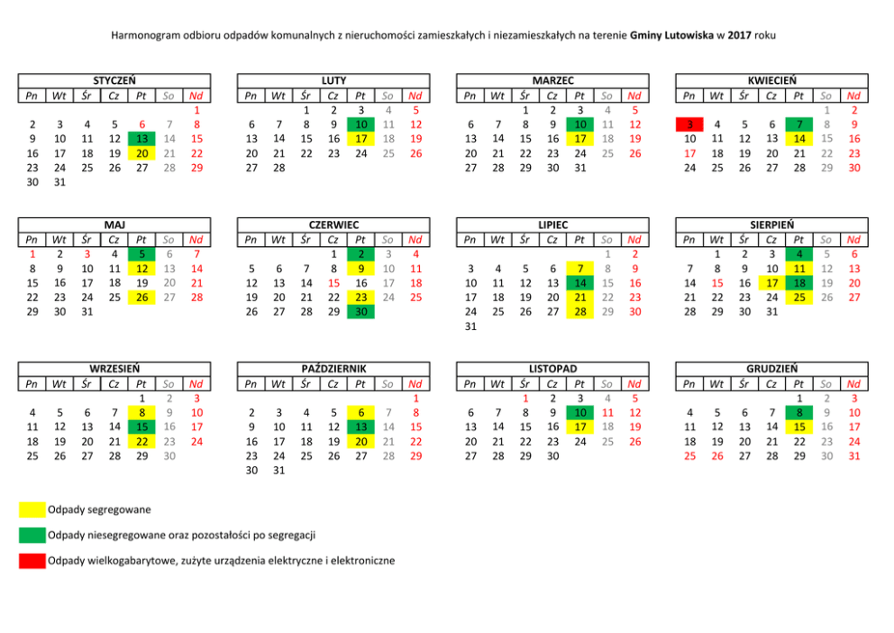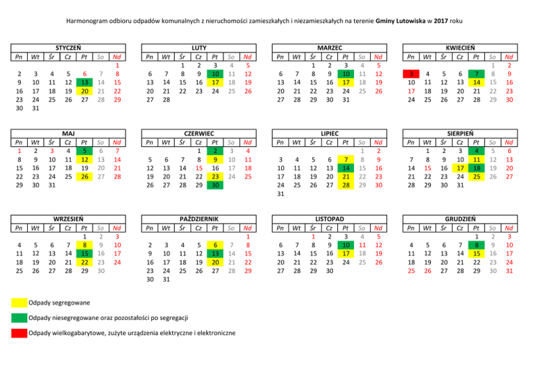 Harmonogram odbioru odpadów komunalnych z nieruchomości zamieszkałych i niezamieszkałych na terenie Gminy Lutowiska w 2017 roku Pn Wt 2 9 16 23 30 3 10 17 24 31 Pn 1 8 15 22 29 Wt 2 9 16 23 30 Pn Wt 4 11 18 25 5 12 19 26 STYCZEŃ Śr Cz Pt So 4 11 18 25 7 14 21 28 5 12 19 26 MAJ Śr Cz 3 4 10 11 17 18 24 25 31 6 13 20 27 Pt 5 12 19 26 WRZESIEŃ Śr Cz Pt 1 6 7 8 13 14 15 20 21 22 27 28 29 So 6 13 20 27 So 2 9 16 23 30 Nd 1 8 15 22 29 Nd 7 14 21 28 Nd 3 10 17 24 Pn Wt 6 13 20 27 7 14 21 28 LUTY Śr Cz 1 2 8 9 15 16 22 23 Pt 3 10 17 24 So 4 11 18 25 Pn Wt 5 12 19 26 6 13 20 27 CZERWIEC Śr Cz Pt 1 2 7 8 9 14 15 16 21 22 23 28 29 30 Pn Wt PAŹDZIERNIK Śr Cz Pt So 2 9 16 23 30 3 10 17 24 31 4 11 18 25 7 14 21 28 5 12 19 26 6 13 20 27 So 3 10 17 24 Odpady segregowane Odpady niesegregowane oraz pozostałości po segregacji Odpady wielkogabarytowe, zużyte urządzenia elektryczne i elektroniczne Nd 5 12 19 26 Nd 4 11 18 25 Nd 1 8 15 22 29 Pn Wt 6 13 20 27 7 14 21 28 MARZEC Śr Cz Pt 1 2 3 8 9 10 15 16 17 22 23 24 29 30 31 Pn Wt LIPIEC Śr Cz Pt 3 10 17 24 31 4 11 18 25 5 12 19 26 Pn Wt 6 13 20 27 7 14 21 28 6 13 20 27 7 14 21 28 LISTOPAD Śr Cz Pt 1 2 3 8 9 10 15 16 17 22 23 24 29 30 So 4 11 18 25 So 1 8 15 22 29 So 4 11 18 25 Nd 5 12 19 26 Nd 2 9 16 23 30 Nd 5 12 19 26 Pn Wt KWIECIEŃ Śr Cz Pt 3 10 17 24 4 11 18 25 5 12 19 26 Wt 1 8 15 22 29 SIERPIEŃ Śr Cz Pt 2 3 4 9 10 11 16 17 18 23 24 25 30 31 Pn 7 14 21 28 Pn Wt 4 11 18 25 5 12 19 26 6 13 20 27 7 14 21 28 GRUDZIEŃ Śr Cz Pt 1 6 7 8 13 14 15 20 21 22 27 28 29 So 1 8 15 22 29 Nd 2 9 16 23 30 So 5 12 19 26 Nd 6 13 20 27 So 2 9 16 23 30 Nd 3 10 17 24 31
