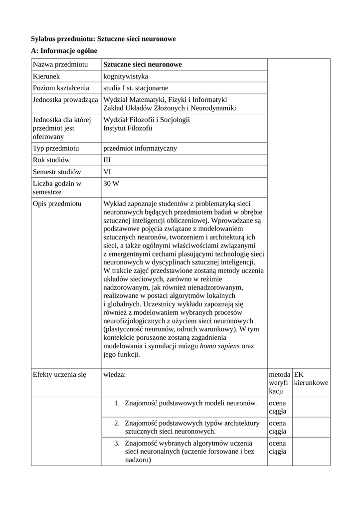 Sylabus przedmiotu: Sztuczne sieci neuronowe A: Informacje ogólne Nazwa przedmiotu Sztuczne sieci neuronowe Kierunek kognitywistyka Poziom kształcenia studia I st. stacjonarne Jednostka prowadząca Wydział Matematyki, Fizyki i Informatyki Zakład Układów Złożonych i Neurodynamiki Jednostka dla której przedmiot jest oferowany Wydział Filozofii i Socjologii Instytut Filozofii Typ przedmiotu przedmiot informatyczny Rok studiów III Semestr studiów VI Liczba godzin w semestrze 30 W Opis przedmiotu Wykład zapoznaje studentów z problematyką sieci neuronowych będących przedmiotem badań w obrębie sztucznej inteligencji obliczeniowej. Wprowadzane są podstawowe pojęcia związane z modelowaniem sztucznych neuronów, tworzeniem i architekturą ich sieci, a także ogólnymi właściwościami związanymi z emergentnymi cechami plasującymi technologię sieci neuronowych w dyscyplinach sztucznej inteligencji. W trakcie zajęć przedstawione zostaną metody uczenia układów sieciowych, zarówno w reżimie nadzorowanym, jak również nienadzorowanym, realizowane w postaci algorytmów lokalnych i globalnych. Uczestnicy wykładu zapoznają się również z modelowaniem wybranych procesów neurofizjologicznych z użyciem sieci neuronowych (plastyczność neuronów, odruch warunkowy). W tym kontekście poruszone zostaną zagadnienia modelowania i symulacji mózgu homo sapiens oraz jego funkcji. Efekty uczenia się wiedza: metoda EK weryfi kierunkowe kacji 1. Znajomość podstawowych modeli neuronów. ocena ciągła 2. Znajomość podstawowych typów architektury sztucznych sieci neuronowych. ocena ciągła 3. Znajomość wybranych algorytmów uczenia sieci neuronalnych (uczenie forsowane i bez nadzoru) ocena ciągła Umiejętności: 1. Umiejętność rozumienie tekstów naukowych związanych z problematyką sztucznych sieci neuronowych, a także umiejętność dyskutowania z profesjonalistami zagadnień związanych z funkcjonowaniem sieci i ich uczeniem ocena ciągła 2. Znajomość wybranych algorytmów uczenia nadzorowanego i nienadzorowanego oraz trudności związanych z realizacją procesów uczenia ocena ciągła 3. Umiejętność przygotowania wypowiedzi na temat funkcjonowania sztucznych sieci neuronowych, ich właściwości oraz metod i zasad uczenia. praca pisemna postawy: 1. Aktywna postawa w docieraniu do wiedzy specjalistycznej. 2. Twórcze podejście do problemów stosowania metod sztucznej inteligencji w nauce i technice. 3. Krytyczna ocena wiedzy dostępnej w literaturze specjalistycznej i popularno-naukowej. sztuczne sieci neuronowe - konwersatorium Liczba godzin w semestrze 30 KW Opis przedmiotu Celem konwersatorium jest dokładne przedyskutowanie ze studentami problemów omawianych na wykładzie wraz z przeprowadzeniem implementacji kilku wybranych zagadnień. Przewiduje się programowanie prostego modelu neuronu progowego, a następnie budowanie bardziej złożonych struktur: perceptronu jednowarstwowego i wielowarstwowych. W dalszej kolejności przedyskutowane i zaimplementowane zostaną wybrane metody uczenia sieci neuronowych, samodzielnie oraz z wykorzystaniem środowiska JNNS. Wynikiem konwersatoriów będzie uświadomienie studentom nowych, emergentnych właściwości pojawiających się w zaprogramowanych modelach sztucznych sieci neuronowych. Efekty uczenia się wiedza: 1. Znajomość modeli neuronów: McCullocha-Pittsa, typu zbieraj i strzelaj, rezonuj i strzelaj. 2. Znajomość idei perceptronów jedno- i wielowarstwowych. 3. Znajomość metod uczenia sieci neuronowych, np. ze ocena ciągła wsteczną propagacją błędu i hebba. Umiejętności: 1. Umiejętność implementacji neuronów i sieci neuronów. ocena ciągła 2. Umiejętność implementacji metody uczenia sieci ze wsteczną propagacją błędu. ocena ciągła 3. Umiejętność przygotowania projektu opartego o praca pisemna sztuczne sieci neuronowe, np. w środowisku JNNS. postawy: 1. Aktywna postawa w docieraniu do wiedzy specjalistycznej. 2. Twórcze podejście do problemów stosowania metod sztucznej inteligencji w nauce i technice. 3. Krytyczna ocena wiedzy dostępnej w literaturze specjalistycznej i popularno-naukowej. Punkty ECTS 6 Ogólna forma zaliczenia Egzamin ustny Zaliczenie konwersatorium na ocenę Język wykładowy polski/angielski Koordynator przedmiotu Wiesław Andrzej Kamiński, prof. dr hab. konwersatorium: Grzegorz M. Wójcik, dr Dodatkowe informacje www.nessie.edu.pl