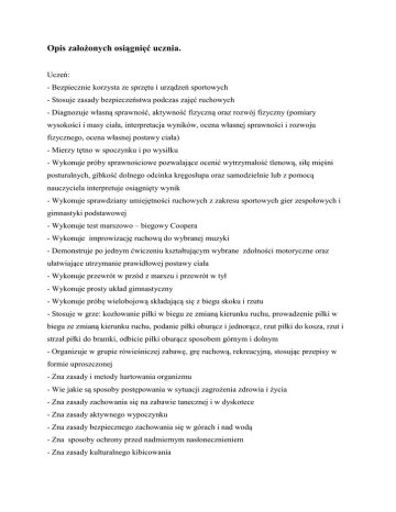 Opis założonych osiągnięć ucznia. Uczeń: - Bezpiecznie korzysta ze sprzętu i urządzeń sportowych - Stosuje zasady bezpieczeństwa podczas zajęć ruchowych - Diagnozuje własną sprawność, aktywność fizyczną oraz rozwój fizyczny (pomiary wysokości i masy ciała, interpretacja wyników, ocena własnej sprawności i rozwoju fizycznego, ocena własnej postawy ciała) - Mierzy tętno w spoczynku i po wysiłku - Wykonuje próby sprawnościowe pozwalające ocenić wytrzymałość tlenową, siłę mięśni posturalnych, gibkość dolnego odcinka kręgosłupa oraz samodzielnie lub z pomocą nauczyciela interpretuje osiągnięty wynik - Wykonuje sprawdziany umiejętności ruchowych z zakresu sportowych gier zespołowych i gimnastyki podstawowej - Wykonuje test marszowo – biegowy Coopera - Wykonuje improwizację ruchową do wybranej muzyki - Demonstruje po jednym ćwiczeniu kształtującym wybrane zdolności motoryczne oraz ułatwiające utrzymanie prawidłowej postawy ciała - Wykonuje przewrót w przód z marszu i przewrót w tył - Wykonuje prosty układ gimnastyczny - Wykonuje próbę wielobojową składającą się z biegu skoku i rzutu - Stosuje w grze: kozłowanie piłki w biegu ze zmianą kierunku ruchu, prowadzenie piłki w biegu ze zmianą kierunku ruchu, podanie piłki oburącz i jednorącz, rzut piłki do kosza, rzut i strzał piłki do bramki, odbicie piłki oburącz sposobem górnym i dolnym - Organizuje w grupie rówieśniczej zabawę, grę ruchową, rekreacyjną, stosując przepisy w formie uproszczonej - Zna zasady i metody hartowania organizmu - Wie jakie są sposoby postępowania w sytuacji zagrożenia zdrowia i życia - Zna zasady zachowania się na zabawie tanecznej i w dyskotece - Zna zasady aktywnego wypoczynku - Zna zasady bezpiecznego zachowania się w górach i nad wodą - Zna sposoby ochrony przed nadmiernym nasłonecznieniem - Zna zasady kulturalnego kibicowania - Wyjaśnia dlaczego należy przestrzegać ustalonych reguł w trakcie rywalizacji sportowej - Uczestniczy w zawodach sportowych w roli zawodnika, stosuje zasady „czystej gry”: szacunku dla rywali, respektowania przepisów gry, podporządkowania się decyzjom sędziego, podziękowania za wspólną grę - Zna i stosuje zasady samoasekuracji - Dobiera strój i obuwie sportowe do ćwiczeń w zależności od miejsca zajęć i warunków atmosferycznych. Propozycje kryteriów oceny i metod sprawdzani
