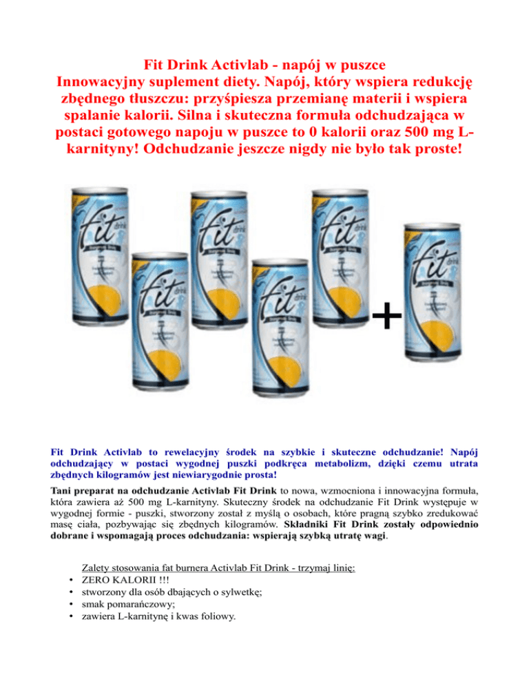 Fit Drink Activlab - napój w puszce Innowacyjny suplement diety. Napój, który wspiera redukcję zbędnego tłuszczu: przyśpiesza przemianę materii i wspiera spalanie kalorii. Silna i skuteczna formuła odchudzająca w postaci gotowego napoju w puszce to 0 kalorii oraz 500 mg Lkarnityny! Odchudzanie jeszcze nigdy nie było tak proste! Fit Drink Activlab to rewelacyjny środek na szybkie i skuteczne odchudzanie! Napój odchudzający w postaci wygodnej puszki podkręca metabolizm, dzięki czemu utrata zbędnych kilogramów jest niewiarygodnie prosta! Tani preparat na odchudzanie Activlab Fit Drink to nowa, wzmocniona i innowacyjna formuła, która zawiera aż 500 mg L-karnityny. Skuteczny środek na odchudzanie Fit Drink występuje w wygodnej formie - puszki, stworzony został z myślą o osobach, które pragną szybko zredukować masę ciała, pozbywając się zbędnych kilogramów. Składniki Fit Drink zostały odpowiednio dobrane i wspomagają proces odchudzania: wspierają szybką utratę wagi. • • • • Zalety stosowania fat burnera Activlab Fit Drink - trzymaj linię: ZERO KALORII !!! stworzony dla osób dbających o sylwetkę; smak pomarańczowy; zawiera L-karnitynę i kwas foliowy. Sposób działania i zastosowanie oraz skutki uboczne stosowania preparatu na odchudzanie Activlab Fit Drink. Fit Drink to napój funkcjonalny o smaku pomarańczowym stworzony z myślą o osobach, które dbają o swoją sylwetkę i zdrowie. Zawarta w Fit Drinku L-karnityna wspomaga odchudzanie i przyśpiesza utratę zbędnych kilogramów. Dodatkowo Fit Drink jest źródłem kwasu foliowego, składnika o istotnym znaczeniu w diecie, szczególnie dla kobiet. Fit Drink nie zawiera cukrów i nie zawiera kalorii. Aby dodatkowo zwiększyć efekty działania składników, zaleca się wraz z przyjmowaniem preparatu Fit Drink równoległe stosowanie odpowiednio niskoenergetycznej, zbilansowanej diety połączonej z regularnym wysiłkiem fizycznym. Dawkowanie oraz sposób użycia Activlab Fit Drink: Pijesz tak często, jak chcesz - i chudniesz! Skład produktu na odchudzanie Fit Drink: Zawartość opakowania napoju: 1 puszka 250 ml Wartość energetyczna 0 kcal Białko 0g Węglowodany 0g Tłuszcz 0g L-karnityna 500 mg Kwas foliowy 100 IU Składniki odchudzającego napoju Fit Drink: woda, regulator kwasowości - kwas cytrynowy, l-karnityna, kwas foliowy, aromat, substancje słodzące - acesulfam K, sukraloza, barwnik - ryboflawina. www.kulturystyka.sklep.pl