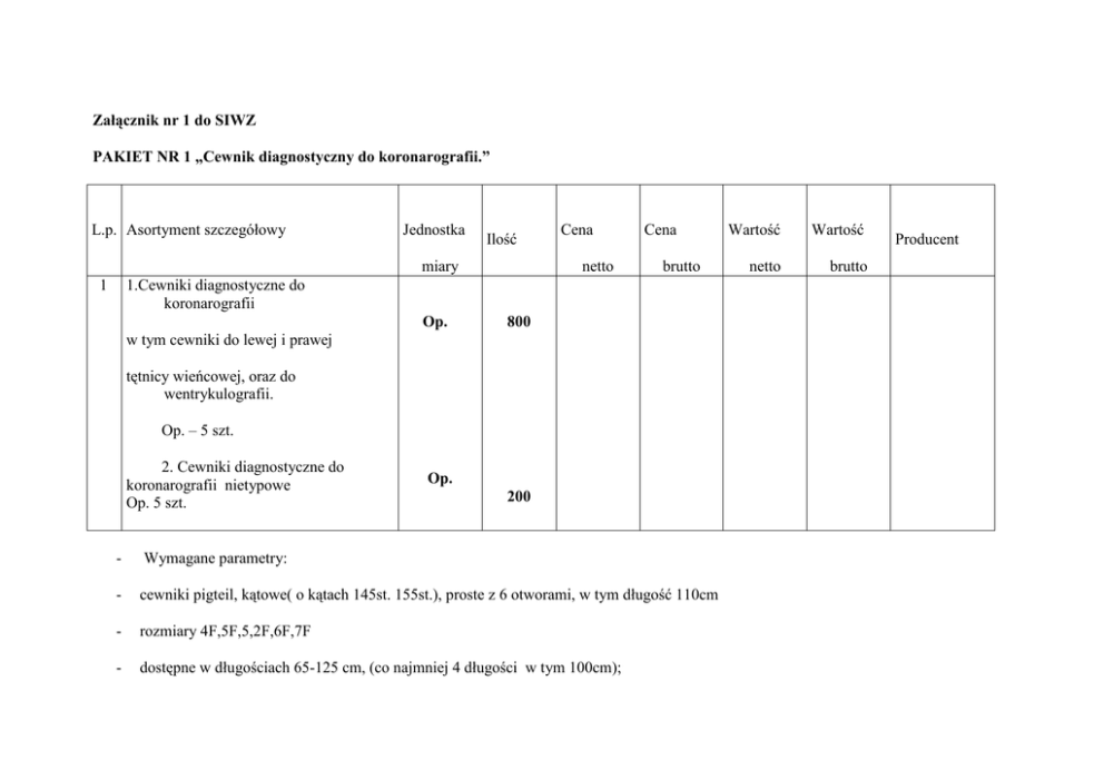Załącznik nr 1 do SIWZ PAKIET NR 1 „Cewnik diagnostyczny do koronarografii.” L.p. Asortyment szczegółowy Jednostka Ilość miary 1 Cena netto Cena brutto 1.Cewniki diagnostyczne do koronarografii Op. 800 w tym cewniki do lewej i prawej tętnicy wieńcowej, oraz do wentrykulografii. Op. – 5 szt. 2. Cewniki diagnostyczne do koronarografii nietypowe Op. 5 szt. Op. 200 - Wymagane parametry: - cewniki pigteil, kątowe( o kątach 145st. 155st.), proste z 6 otworami, w tym długość 110cm - rozmiary 4F,5F,5,2F,6F,7F - dostępne w długościach 65-125 cm, (co najmniej 4 długości w tym 100cm); Wartość Wartość netto brutto Producent - duŜe światło wewnętrzne minimum 0,042” dla 4F , 0.047” dla 5F i 0.057” dla 6F dobra manewrowalność, pokrycie wewnętrzne umoŜliwiające dobry przepływ przenoszenie obrotu cewnika na całej długości 1:1; atraumatyczna miękka końcówka, cewnik zbrojony na całej długości o dobrej rotacyjności odporny na złamania i temperaturę o bardzo duŜej pamięci kształtu co najmniej 7 róŜnych krzywizn dostępnych na rynku dla cewników z dostępu promieniowego pełny wybór krzywizn dostępnych na rynku do lewej i prawej tętnicy wieńcowej oraz do pomostów Ŝylnych i tętniczych z dostępu promieniowego i pachwinowego dobrze widoczny w skopii, oporne na złamanie i zagięcie, charakteryzujące się długą pamięcią kształtu. PAKIET NR 2 „Cewnik prowadzący do koronaroplastyki.” L.p. 1 Asortyment szczegółowy Cewnik prowadzący do koronaroplastyki wieńcowej Op. – 1 szt. Jednostka miary Op. Ilość Cena netto Cena brutto Wartość netto Wartość brutto Producent 1500 Wymagane parametry: - cewniki o duŜej średnicy wewnętrznej min. 0,071” dla 6F, 0,058” dla 5F,0,081” dla 7F, 0,090”dla 8F –przy zachowaniu zbrojenia metalowego - cewniki zbrojone metalowym oplotem, zapewniające bardzo dobre podparcie - oporne na złamanie i zagięcie, charakteryzujące się długą pamięcią kształtu, zachowujący niezmienne światło na całej długości łącznie z końcówką - dostępne w rozmiarach 5F – 8F, - końcówka atraumatyczna, dobrze widoczna w skopii, - pełna gama kształtów i krzywizn (dla dojścia z tętnicy promieniowej, ramiennej; do angioplastyki przęseł aortalno-wieńcowych); instrukcja obsługi w języku polskim PAKIET NR 3 „Introducery”. L.p. 1 2 Asortyment szczegółowy Zestaw do kaniulacji tętnicy: introducer z zastawką i portem bocznym, igła, prowadnik op. – 1 szt. 5F 6F 7F 8F Introduktory do tętnicy promieniowej op. 1 szt Jednostka miary Ilość Cena netto Cena brutto Wartość netto Wartość brutto Producent Op. 500 2000 40 40 Op. 2000 Wymagane parametry: zróŜnicowane profile 5F – 10F, długości 11-23 cm; atraumatyczne, odporne na złamanie, zastawka zapewniająca optymalną hemostazę i niskie opory, atraumatyczne przejście pomiędzy końcówką a poszerzaczem, w asortymencie zestawy do kaniulacji t.promieniowej 5-7F długości 11-23cm (igła21G dł. 38mm oraz prowadnik o średnicy 0,018” dostępnego w dwóch wersjach roboczych o prostej końcówce i wygiętej pod kątem 45 stopni, prowadnik, rozszerzacz, koszulka) PAKIET NR 4 „Introducery zbrojone długie”. L.p. 1 Asortyment szczegółowy Introducery – zbrojone o długości 11 – 35 cm (koszulki wprowadzające) op. – 1szt. 11cm 24cm 35 cm Jednostka miary Op. Ilość Cena netto Cena brutto Wartość netto 30 20 20 Wymagane parametry: - zróŜnicowane profile 6F – 7F, - odporne na załamanie i zagięcia, - zastawka hemostatyczna zapewniająca optymalną hemostazę i niskie opory przy wprowadzaniu cewnika, - atraumatyczne przejście pomiędzy końcówką a poszerzaczem, - dające dobre podparcie dla cewnika prowadzącego przy krętym przebiegu tętnic biodrowych, - zestawy o duŜej średnicy wewnętrznej - pokrycie powłoką o właściwościach hydrofilnych Wartość brutto Producent PAKIET NR 5 „Prowadniki do koronarografii.” L.p. 1 Asortyment szczegółowy Prowadniki do koronarografii op. – 1 szt. Jednostka miary Op. Ilość Cena netto 1000 Wymagane parametry: - dostępne zakresy średnic zewnętrznych 0,018”- 0,038”, - dostępne długości 150 - 260 cm, - zakończone prosto lub w kształcie litery „J”, - ciągłość materiału zapewniająca bezpieczeństwo zabiegu, - giętki, dobrze widoczny w skopii, - sztywna część proksymalna prowadnika zapewniająca dobrą manewrowalność. Cena brutto Wartość netto Wartość brutto Producent PAKIET NR 6 „Prowadniki hydrofilne” L.p. Asortyment szczegółowy 1 Prowadnik hydrofilny dł. do 180 cm op. – 1 szt. Prowadnik hydrofilny dł. 180 -300cm 2 op. – 1 szt. Wymagane parametry: • • • • • • • • • Jednostka miary Op. Ilość 1500 Op. 1000 Cena netto Cena brutto Wartość netto Wartość brutto Producent średnice 0,018”, 0,020”, 0,025”, 0,032” 0,035”, 0.038” dostępne róŜne długości ściętej końcówki rdzenia (taper) short=1 cm, regular=3 cm oraz long=5 cm końcówka prosta, zagięta 45 stopni, typu J, krzywizna Bolia rdzeń nitinolowy zatopiony w poliuretanie, wykonany z jednego kawałka, z bardzo dobrą kontrola trakcji 1:1, odporny na odkształcenia i na załamanie struktury podłuŜnej w poliuretanie dodatkowo zatopione nitki wolframowe trwała powłoka hydrofilna na całej długości atraumatyczna, miękka końcówka, z pamięcią kształtu dostępne w wersji o standardowej sztywności, półsztywnej i sztywnej dostępne w opcji z kształtowalną końcówką a) długości 50, 80, 120 ,150, 180 cm b) długości 220, 260, 300 cm PAKIET NR 7 „Prowadniki do koronaroplastyk.” L.p. 1 Asortyment szczegółowy Prowadniki angioplastyczne Op. – 1 szt. Jednostka miary Ilość Op. 1500 Cena netto Cena brutto Wartość netto Wartość brutto Producent Wymagane parametry zgodne z załączoną oryginalną dokumentacją techniczną: - średnica 0.014”, - dostępna końcówka prosta i J, - dostępny w długości 190-300 cm b