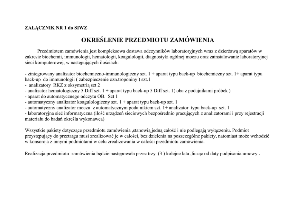 ZAŁĄCZNIK NR 1 do SIWZ OKREŚLENIE PRZEDMIOTU ZAMÓWIENIA Przedmiotem zamówienia jest kompleksowa dostawa odczynników laboratoryjnych wraz z dzierŜawą aparatów w zakresie biochemii, immunologii, hematologii, koagulologii, diagnostyki ogólnej moczu oraz zainstalowanie laboratoryjnej sieci komputerowej, w następujących ilościach: - zintegrowany analizator biochemiczno-immunologiczny szt. 1 + aparat typu back-up biochemiczny szt. 1+ aparat typu back-up do immunologii ( zabezpieczenie ozn.troponiny ) szt.1 - analizatory RKZ z oksymetrią szt 2 - analizator hematologiczny 5 Diff szt. 1 + aparat typu back-up 5 Diff szt. 1( oba z podajnikami próbek ) - aparat do automatycznego odczytu OB. Szt 1 - automatyczny analizator koagulologiczny szt. 1 + aparat typu back-up szt. 1 - automatyczny analizator moczu z automatycznym podajnikiem szt. 1+ analizator typu back-up szt. 1 - laboratoryjna sieć informatyczna (ilość urządzeń sieciowych bezpośrednio pracujących z analizatorami i przy rejestracji materiału do badań określa wykonawca) Wszystkie pakiety dotyczące przedmiotu zamówienia ,stanowią jedną całość i nie podlegają wyłączeniu. Podmiot przystępujący do przetargu musi zrealizować je w całości, bez dzielenia na poszczególne pakiety, natomiast moŜe wchodzić w konsorcja z innymi podmiotami w celu zrealizowania w całości przedmiotu zamówienia. Realizacja przedmiotu zamówienia będzie następowała przez trzy (3 ) kolejne lata ,licząc od daty podpisania umowy . PAKIET NR 1 ZINTEGROWANY ANALIZATOR BIOCHEMICZNO-IMMUNOLOGICZNY z drukarką i UPS Aparat fabrycznie nowy Podać typ, nazwę i rok wprowadzenia na rynek polski. A. PARAMETRY GRANICZNE DLA CZĘŚCI BIOCHEMICZNEJ ANALIZATORA 1. 2. 3. 4. 5. 6. 7. Stała gotowość do pracy Analizator w pełni automatyczny, pracujący w trybie Random acces Min. Wydajności 600 ozn /godz (bez ISE) Wmontowany moduł ISE ( elektrody : Na , K , Cl ) Odczynniki gotowe do uŜycia lub automatycznie przygotowywane na pokładzie analizatora Chłodzenie odczynników na pokładzie analizatora MoŜliwości analityczne: oznaczanie: enzymów, substratów, białek specyficznych, monitorowanie leków trucizn, metabolitów , jonów 8. Metody pomiaru: fotometryczne – mono i bichromatycznie, punktu końcowego, kinetyczne 9. Priorytet dla próbek cito 10. Wykonywanie oznaczeń w próbce pediatrycznej 11. Wykonywanie oznaczeń w próbce pierwotnej 12. Detekcja skrzepu 13. Automatyczne rozcieńczanie bądź zmiana objętości próbki oraz powtarzania oznaczenia po przekroczeniu liniowości metody 14. MoŜliwość oznaczeń w róŜnorodnym materiale biologicznym – surowicy, osoczu, hemolizacie, moczu, PMR , płynach z jam ciała . 15. Barkodowa identyfikacja próbki badanej i odczynnika 16. Automatyczna kalibracja na podstawie barkodowanych odczynników 17. Automatyczny układ kontroli jakości w czasie rzeczywistym i skumulowana oraz pełna archiwizacja wyników wraz z kartami kontroli. 18. MoŜliwość stałego monitorowania poziomu odczynników, mat. zuŜywalnych, płynów systemowych 19. JeŜeli analizator wymaga stacji uzdatniania wody – stacja uzdatniania wody dostarczona wraz z analizatorem jako integralna część 20. MoŜliwość ciągłego dostarczania próbek bez konieczności zatrzymywania analizatora 21. MoŜliwość umieszczania min 50 odczynników jednocześnie na pokładzie analizatora 22. Współpraca z róŜnymi systemami próŜniowego pobierania krwi 23. Kuwety pomiarowe jednorazowe lub wielokrotnego uŜytku , automatycznie myte i sprawdzane przez analizator. 24. Instrukcja obsługi w j. polskim B. PARAMETRY GRANICZNE DLA CZĘŚCI IMMUNOLOGICZNEJ ANALIZATORA Analizator fabrycznie nowy. 1. Pełna automatyzacja oznaczeń wraz z wykonywaniem potrzebnych rozcieńczeń i powtórek badań po przekroczeniu zakresu liniowości. 2. MoŜliwość oznaczeń met. chemiluminescencyjną. 3. Wydajność min.150 oznaczeń /godz. Max. czas oczekiwania na wszystkie oferowane parametry w całej liniowości do 20 min. 4. Praca w systemie Random acces. 5. Priorytet dla próbek cito. 6. MoŜliwość oznaczania próbek pediatrycznych. 7. Automatyczna kontrola jakości badań i jej archiwizacja. 8. Automatyczna kalibracja. 9. Archiwizacja krzywych kalibracyjnych. 10. Detektor skrzepów w próbkach badanych. 11. MoŜliwość wykonywania analiz z próbki pierwotnej. 12. Barkodowanie odczynników i próbek badanych. 13. Chłodzenie odczynników na pokładzie analizatora. 14. Monitorowanie ilości dostępnych na pokładzie analizatora odczynników, mat. zuŜywalnych i płynów systemowych. 15. Współpraca z informatyczną siecią szpitala oraz LIS 16. JeŜeli analizator będzie oznaczał troponinę jako podstawowy to naleŜy zabezpieczyć to oznaczenie systemem back-up. 17. Wymienne końcówki w pipetorze zabezpieczające przed carry-over. 18. Automatyczna kalibracja na podstawie barkodowanych odczynników. 19. MoŜliwość umieszczania min 25 odczynników jednocześnie na pokładzie analizatora 20. Instrukcja obsługi w j. polskim. Pozostałe wymagania graniczne dla zintegrowanego analizatora biochemiczno-immunologicznego 1. Posiadanie Certyfikatów CE dla aparatów i odczynników 2. Bezpłatne pakiety do uruchomienia urządzenia obejmujące: dla biochemii odczynnik do oznaczania glukozy , kreatyniny, białka w surowicy, CRP , kwasu walproinowego ; dla immunologii odczynnik do oznaczania TSH , troponiny, HCV ,CEA ,HBsAg - wszystkie odczynniki do tego pakietu dostarczone wraz z materiałem kontrolnym i kalibratorami ,niezbędnymi do pełnego uruchomienia testu .Pakiet startowy obejmuje równieŜ niezbędne inne materiały ,np. płyny systemowe,płuczące,rozcieńczające itp. 3. Bezpłatny serwis w całym okresie dzierŜawy (obejmujący równieŜ koszt części zamiennych ) oraz przeglądy techniczne raz w roku wraz z kompleksową wymianą części zamiennych(drenów,zaworów itp. ) 4. Współpraca z LIS i siecią szpitalną. 5. Udział w bezpłatnej