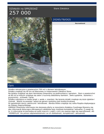 DZIAŁKA na SPRZEDAŻ Stare Załubice 257 000 20265/78/OGS Recreational Opis Działka rekreacyjna o powierzchni 750 m2 z domem letniskowym. Działka znajduje się 40 km od Warszawy w miejscowości Załubice Stare. Na działce znajduje się dom letniskowy drewniany na podmurówce z garażem . Dom o powierzchni ok 60 m2.w którym znajduje się salon z kuchnią oddzielony barkiem , dwie sypialnie , łazienka z prysznicem , schowek i taras. Działka uzbrojona w media (prąd + woda + szambo). Na terenie działki znajduje się dużo iglaków i choinek . Wjazd na posesję i wjazd do garażu wyłożony jest kostką brukową. W sąsiedztwie domy całoroczne i letniskowe . Bardzo blisko znajduje się rzeka Rządza dopływająca do Zalewu Zegrzyńskiego. UWAGA!*Powyższe informacje nie stanowią oferty w rozumieniu Kodeksu Cywilnego.Staramy się, aby informacje dotyczące oferowanych obiektów były możliwie kompletne i aktualne. Z uwagi na to, iż informacje te pochodzą od osób trzecich i część z nich nie zawsze daje się zweryfikować, AG "HOMEPLUS" nie ponosi odpowiedzialności za ich dokładność, kompletność i aktualność HOMEPLUS Nieruchomości Jacek Szuliński tel. 509 209 104 tel. 22 786 64 50 email: [email protected] HOMEPLUS Nieruchomości Powered by TCPDF (www.tcpdf.org)