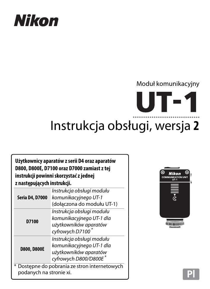 Moduł komunikacyjny Instrukcja obsługi, wersja 2 Użytkownicy aparatów z serii D4 oraz aparatów D800, D800E, D7100 oraz D7000 zamiast z tej instrukcji powinni skorzystać z jednej z następujących instrukcji. Instrukcja obsługi modułu Seria D4, D7000 komunikacyjnego UT-1 (dołączona do modułu UT-1) Instrukcja obsługi modułu komunikacyjnego UT-1 dla D7100 użytkowników aparatów cyfrowych D7100 * Instrukcja obsługi modułu komunikacyjnego UT-1 dla D800, D800E użytkowników aparatów cyfrowych D800/D800E * * Dostępne do pobrania ze stron internetowych podanych na stronie xi. Pl Do czego możesz wykorzystać UT-1 Do czego możesz wykorzystać UT-1 W niniejszej instrukcji opisano sposób podłączania do sieci i przesyłania zdjęć do komputera lub na serwer FTP oraz zdalnego sterowania aparatem przy pomocy programu Camera Control Pro 2. Korzystaj z UT-1 do podłączania się do sieci Ethernet lub do podłączania się do sieci bezprzewodowych, poprzez podłączenie WT-5 do UT-1. Przed podłączeniem modułu UT-1 sprawdź, czy oprogramowanie aparatu i modułu UT-1 zostało zaktualizowane do najnowszych wersji. Więcej informacji znajduje się na stronach internetowych podanych na stronie xi. Przed rozpoczęciem korzystania z funkcji sieciowych UT-1 podłącz aparat do sieci. Sieci Ethernet Informacje na temat podłączania do komputera znajdują się na stronie 15. Informacje na temat łączenia się z serwerem FTP znajdują się na stronie 57. Sieci bezprzewodowe Połącz się z siecią bezprzewodową przy pomocy przekaźnika bezprzewodowego WT-5 (06). Informacje na temat podłączania do komputera znajdują się na stronie 23. Informacje na temat łączenia się z serwerem FTP znajdują się na stronie 64. ii Po utworzeniu połączenia sieciowego można: Przesyłać istniejące zdjęcia i filmy Przesyłanie FTP (075) Komputer Serwer FTP Robić lub przeglądać zdjęcia zdalnie Sterowanie aparatem (040) Do czego możesz wykorzystać UT-1 Przesyłanie zdjęć (035) Serwer HTTP (043) iPhone Camera Control Pro 2 Komputer iii Informacje o znakach towarowych Do czego możesz wykorzystać UT-1 Mac, OS X i iPhone to zarejestrowane znaki towarowe firmy Apple Inc. w USA i/lub innych krajach. Microsoft, Windows i Windows Vista są zarejestrowanymi znakami towarowymi firmy Microsoft Corporation. Wszystkie inne nazwy handlowe wymienione w tej instrukcji obsługi lub innych dokumentach dołączonych do tego produktu Nikon są znakami towarowymi lub zarejestrowanymi znakami towarowymi odpowiednich właścicieli. Licencja publicznego kodu źródłowego firmy Apple Ten produkt zawiera kod źródłowy mDNS firmy Apple, który może być używany zgodnie z warunkami licencji publicznego kodu źródłowego firmy Apple znajdującej się na stronie http://developer.apple.com/opensource/. Copyright © 2014 Apple Computer, Inc. Wszelkie prawa zastrzeżone. Plik ten zawiera oryginalny kod i/lub modyfikacje oryginalnego kodu, które są opisane w i podlegają Licencji publicznego kodu źródłowego wersja 2.0 (Licencja). Nie można używać tego pliku w inny sposób niż opisany w Licencji. Pobierz kopię Licencji ze strony http://www.opensource.apple.com/license/apsl/ i przeczytaj ją przed rozpoczęciem użytkowania tego pliku. Oryginalny kod i wszelkie oprogramowanie dystrybuowane zgodnie z tą licencją jest dostarczane jako produkt „TAKI JAKI JEST”, BEZ JAKICHKOLWIEK GWARANCJI WYRAŻONYCH LUB DOROZUMIANYCH I NINIEJSZYM FIRMA APPLE UNIEWAŻNIA JAKIEKOLWIEK GWARANCJE, WŁĄCZNIE Z GWARANCJAMI WARTOŚCI HANDLOWEJ I PRZYDATNOŚCI DO OKREŚLONYCH CELÓW, SPOKOJNEGO UŻYTKOWANIA LUB Z TYTUŁU NIENARUSZALNOŚCI PRAW OSÓB TRZECICH. W licencji opisane zostały prawa i ograniczenia dotyczące niektórych języków. iv Zasady bezpieczeństwa Ikona ta oznacza ostrzeżenia, informacje, które muszą być przeczytane przed użytkowaniem tego produktu, aby zapobiec możliwym obrażeniom ciała. Zasady bezpieczeństwa Aby zapobiec obrażeniom ciała i uszkodzeniu produktu Nikon, należy przeczytać całe poniższe zasady bezpieczeństwa przed rozpoczęciem użytkowania tego urządzenia. Należy przechowywać zasady bezpieczeństwa w miejscu, w którym wszyscy użytkownicy będą mogli je przeczytać. Groźne skutki nieprzestrzegania zasad bezpieczeństwa opisanych w tym rozdziale są oznaczone następującym symbolem: ❏ OSTRZEŻENIA Nie demontować Niestosowanie się do tego zalecenia może spowodować porażenie prądem elektrycznym, pożar lub inny wypadek. W razie pęknięcia produktu w wyniku upadku lub z innej przyczyny, należy odłączyć źródło zasilania aparatu i przekazać go do sprawdzenia w autoryzowanym serwisie firmy Nikon. W razie usterki należy natychmiast odłączyć zasilanie W przypadku wykrycia dymu lub dziwnego zapachu wydobywającego się z urządzenia należy natychmiast odłączyć zasilacz i wyjąć akumulator, uważając, aby się nie poparzyć. Dalsze korzystanie z aparatu może doprowadzić do wypadku. Po wyjęciu akumulatora przekaż urządzenie do kontroli w autoryzowanym serwisie firmy Nikon. Nie należy używać urządzenia w pobliżu łatwopalnego gazu Niestosowanie się do tego zalecenia może spowodować eksplozję lub pożar. Chronić przed wodą i wilgocią Nie należy zanurzać w wodzie ani nie wystawiać na działanie wody lub deszczu. Niestosowanie się do tego zalecenia może spowodować porażenie prądem elektrycznym lub pożar. Nie należy obsługiwać urządzenia mokrymi rękami Niestosowanie się do tego zalecenia może spowodować porażenie prądem elektrycznym. Nie dotykaj kabla zasilającego ani nie zbliżaj się do ładowarki podczas burz z wyładowaniami atmosferycznymi Nieprzestrzeganie tego zalecenia może doprowadzić do porażenia prądem elektrycznym. Przechowuj w miejscu niedostępnym dla dzieci Niestosowanie się do tego zalecenia może spowodować obrażenia ciała. v Unikaj przedłużonej styczności Zasady bezpieczeństwa Nie pozostawaj w