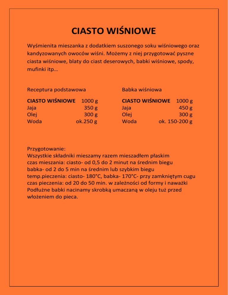 CIASTO WIŚNIOWE Wyśmienita mieszanka z dodatkiem suszonego soku wiśniowego oraz kandyzowanych owoców wiśni. Możemy z niej przygotować pyszne ciasta wiśniowe, blaty do ciast deserowych, babki wiśniowe, spody, mufinki itp… Receptura podstawowa Babka wiśniowa CIASTO WIŚNIOWE 1000 g Jaja 350 g Olej 300 g Woda ok.250 g CIASTO WIŚNIOWE 1000 g Jaja 450 g Olej 300 g Woda ok. 150-200 g Przygotowanie: Wszystkie składniki mieszamy razem mieszadłem płaskim czas mieszania: ciasto- od 0,5 do 2 minut na średnim biegu babka- od 2 do 5 min na średnim lub szybkim biegu temp.pieczenia: ciasto- 180°C, babka- 170°C- przy zamkniętym cugu czas pieczenia: od 20 do 50 min. w zależności od formy i naważki Podłużne babki nacinamy skrobką umaczaną w oleju tuż przed włożeniem do pieca.
