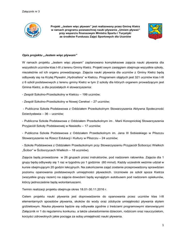 Załącznik nr 3 Projekt „Jestem więc pływam” jest realizowany przez Gminę Kietrz w ramach programu powszechnej nauki pływania „Umiem pływać” przy wsparciu finansowym Ministra Sportu i Turystyki ze środków Funduszu Zajęć Sportowych dla Uczniów Opis projektu „Jestem więc pływam” W ramach projektu „Jestem więc pływam” zaplanowano kompleksowe zajęcia nauki pływania dla wszystkich uczniów klas I-III z terenu Gminy Kietrz. Projekt swym zasięgiem obejmuje wszystkie szkoły, niezależnie od ich organu prowadzącego. Zajęcia nauki pływania dla uczniów z Gminy Kietrz będą odbywały się na Krytej Pływalni „Hydrosfera” w Kietrzu. Programem objętych jest 321 uczniów klas I-III z 6 szkół podstawowych z terenu gminy Kietrz w tym 2 szkoły dla których organem prowadzącym jest Gmina Kietrz, a dla pozostałych 4 stowarzyszenia: - Zespół Szkolno-Przedszkolny w Kietrzu – 199 uczniów; - Zespół Szkolno-Przedszkolny w Nowej Cerekwi – 27 uczniów; - Publiczna Szkoła Podstawowa z Oddziałem Przedszkolnym Stowarzyszenia Aktywna Społeczność Dzierżysławia – 36 – uczniów; - Publiczna Szkoła Podstawowa z Oddziałem Przedszkolnym im . Marii Konopnickiej Stowarzyszenia Przyjaciół Szkoły Podstawowej w Nasiedlu – 17 uczniów; - Publiczna Szkoła Podstawowa z Oddziałem Przedszkolnym im. Jana III Sobieskiego w Pilszczu Stowarzyszenie na Rzecz Edukacji i Kultury w Pilszczu – 24 uczniów; - Szkoła Podstawowa z Oddziałem Przedszkolnym przy Stowarzyszeniu Przyjaciół Ściborzyc Wielkich „Ścibor” w Ściborzycach Wielkich – 18 uczniów). Zajęcia będą prowadzone w 26 grupach przez instruktorów, pod nadzorem ratownika. Zajęcia dla 1 grupy będą odbywały się 1 raz w tygodniu po 1 godzinie (60 minut). Każdy uczestnik weźmie udział w kursie obejmującym 20 godzin lekcyjnych. Na zakończenie zajęć zostanie przeprowadzony sprawdzian poziomu opanowania podstawowych umiejętności pływackich. Uczniowie ze szkół spoza Kietrza (wszystkie grupy razem) na zajęcia dowożeni będą wynajętym autobusem pod nadzorem opiekunów, którzy jednocześnie będą wolontariuszami. Termin realizacji projektu obejmuje okres 18.01-30.11.2016 r. Celem projektu nauki pływania jest doprowadzenie do opanowania przez uczniów klas I-III elementarnych sposobów pływania, skoków do wody oraz zdobycie umiejętności pływania stylem grzbietowym. Nauka pływania będzie się odbywała zgodnie z treściami programowymi stanowiącymi Załącznik nr 1 do regulaminu konkursu. a także uświadomienie dzieciom, rodzicom oraz nauczycielom, korzyści zdrowotnych jakie pociąga za sobą umiejętność nauki pływania. 1 Załącznik nr 3 Przeprowadzenie zajęć wśród uczniów: – wpłynie dodatnio na ogólny rozwój fizyczny i sprawność dziecka, rozwinie jego uzdolnienia ruchowe i ukształtuje podstawowe zdolności motoryczne: siłę, wytrzymałość, szybkość i koordynację ruchową, – wpłynie pozytywnie na sferę psychiczną ćwiczącego poprzez wyrabianie m.in. takich cech osobowości jak: odwaga, zdyscyplinowanie, systematyczność, pracowitość, samodzielność, – korzystnie wpłynie na kształtowanie prawidłowej postawy ciała, a w przypadku już istniejących wad postawy umożliwi skuteczne ich korygowanie poprzez dobór odpowiednich ćwiczeń pływackich dostosowanych do zaistniałej wady, – zahartuje i uodporni organizm na przeziębienia, katary itp., – sprawi, że dziecko doskonalące umiejętności pływackie będzie pewniej i szybciej poruszać się w wodzie, – zachęci uczniów do uprawiania pływania przez całe życie, począwszy od wieku niemowlęcego aż do późnej starości, – poprawi bezpieczeństwo poruszania się w wodzie i zapobiegnie wypadkom utonięć, – sprawi, że młodzież w sposób przyjemny i pożyteczny będzie mogła spędzać wolny czas i znacznie zwiększy więzi integracyjne, – skieruje nadmiar energii zwłaszcza wśród dzieci ze środowisk dysfunkcyjnych na inne tory nie związane z patologiami społecznymi, – umożliwi uczniom wykazującym uzdolnienia w dziedzinie pływania do rozwijania i pogłębiania umiejętności w przyszłości i ułatwi zdobywanie kwalifikacji np. Karty Pływackiej, Ratownika WOPR, Instruktora Pływania MENiS. Uczestnicy podczas zajęć zostaną zapoznani z podstawowymi zasadami bezpiecznego przebywania w wodzie i w pobliżu akwenów wodnych. Projekt generuje koszty związane z dojazdem/transportem uczestników mieszkających poza Kietrzem, w związku z powyższym w budżecie projektu uwzględniano koszt transportu. W celu obniżenia kosztów transportu zaplanowano dowóz uczestników z danej miejscowości/szkoły dla wszystkich grup razem. Ponadto w celu zapewnienia realizacji 20 godzin zajęć na 1 uczestnika projektu, zajęcia będą realizowane zgodnie z harmonogramem od 18 stycznia do 30 lipca 2016 r. – dotyczy wszystkich uczniów dowożonych na zajęcia oraz uczniów1) klas III ZSP w Kietrzu, dla uczestników zajęć z klas I-II uczęszczających do ZSP w Kietrzu zaplanowano zajęcia zgodnie z harmonogramem od 18 stycznia do 30 listopada 2016 r. Co do zasady zajęcia dla 1 uczestnika realizowane będą z częstotliwością 1 raz w tygodniu, jednakże harmonogram uwzględnia wszystkie przerwy typu, ferie oraz świąteczne, okres egzaminów i grafik Krytej Pływalni. 2