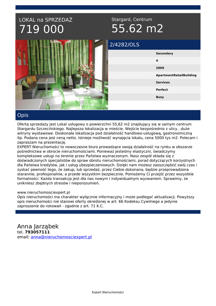 Stargard, Centrum LOKAL na SPRZEDAŻ 55.62 m2 719 000 2/4282/OLS Secondary 4 2009 ApartmentRetailBuilding Services Perfect Busy Opis Ofertą sprzedaży jest Lokal usługowy o powierzchni 55,62 m2 znajdujący się w samym centrum Stargardu Szczecińskiego. Najlepsza lokalizacja w mieście. Wejście bezpośrednio z ulicy , duże witryny wystawowe. Doskonała lokalizacja pod działalność handlowo-usługową, gastronomiczną itp. Podana cena jest ceną netto. Istnieje możliwość wynajęcia lokalu, cena 5000 tys m2. Polecam i zapraszam na prezentację. EXPERT Nieruchomości to nowoczesne biuro prowadzące swoją działalność na rynku w obszarze pośrednictwa w obrocie nieruchomościami. Ponieważ jesteśmy elastyczni, świadczymy kompleksowe usługi na terenie przez Państwa wyznaczonym. Nasz zespół składa się z doświadczonych specjalistów do spraw obrotu nieruchomościami, porad dotyczących korzystnych dla Państwa kredytów, jak i usług ubezpieczeniowych. Dzięki nam możesz zaoszczędzić swój czas i zyskać pewność tego, że zakup, lub sprzedaż, przez Ciebie dokonana, będzie przeprowadzona starannie, profesjonalnie, a przede wszystkim bezpiecznie. Pomożemy Ci przejść przez wszystkie formalności. Każda transakcja jest dla nas nowym i indywidualnym wyzwaniem. Sprawimy, że unikniesz zbędnych stresów i nieporozumień. www.nieruchomosciexpert.pl Opis nieruchomości ma charakter wyłącznie informacyjny i może podlegać aktualizacji. Powyższy opis nieruchomości nie stanowi oferty określonej w art. 66 Kodeksu Cywilnego a jedynie zaproszenie do rokowań - zgodnie z art. 71 K.C. Anna Jarząbek tel. 793057111 email: [email protected] Expert Nieruchomości Powered by TCPDF (www.tcpdf.org)