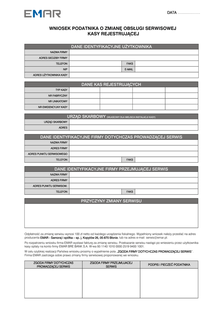 DATA ……………… WNIOSEK PODATNIKA O ZMIANĘ OBSŁUGI SERWISOWEJ KASY REJESTRUJĄCEJ DANE IDENTYFIKACYJNE UŻYTKOWNIKA NAZWA FIRMY ADRES SIEDZIBY FIRMY TELEFON FAKS NIP E-MAIL ADRES UŻYTKOWNIKA KASY DANE KAS REJESTRUJĄCYCH TYP KASY NR FABRYCZNY NR UNIKATOWY NR EWIDENCYJNY KASY URZĄD SKARBOWY (WŁAŚCIWY DLA MIEJSCA INSTALACJI KASY) URZĄD SKARBOWY ADRES DANE IDENTYFIKACYJNE FIRMY DOTYCHCZAS PROWADZĄCEJ SERWIS NAZWA FIRMY ADRES FIRMY ADRES PUNKTU SERWISOWEGO TELEFON FAKS DANE IDENTYFIKACYJNE FIRMY PRZEJMUJĄCEJ SERWIS NAZWA FIRMY ADRES FIRMY ADRES PUNKTU SERWISOW. TELEFON FAKS PRZYCZYNY ZMIANY SERWISU Odpłatność za zmianę serwisu wynosi 100 zł netto od każdego urządzenia fiskalnego. Wypełniony wniosek należy przesłać na adres producenta EMAR - Samoraj i spółka – sp. j, Kopytów 26, 05-870 Błonie, lub na adres e-mail: [email protected]. Po rozpatrzeniu wniosku firma EMAR wystawi fakturę za zmianę serwisu. Przekazanie serwisu nastąpi po wniesieniu przez użytkownika kasy opłaty na konto firmy EMAR BRE BANK S.A. W-wa 93 1140 1010 0000 2519 9400 1001. W celu szybkiej realizacji Państwa wniosku prosimy o wypełnienie pola „ZGODA FIRMY DOTYCHCZAS PROWADZĄCEJ SERWIS”. Firma EMAR zastrzega sobie prawo zmiany firmy serwisowej proponowanej we wniosku. ZGODA FIRMY DOTYCHCZAS PROWADZĄCEJ SERWIS ZGODA FIRMY PRZEJMUJACEJ SERWIS PODPIS i PIECZEĆ PODATNIKA
