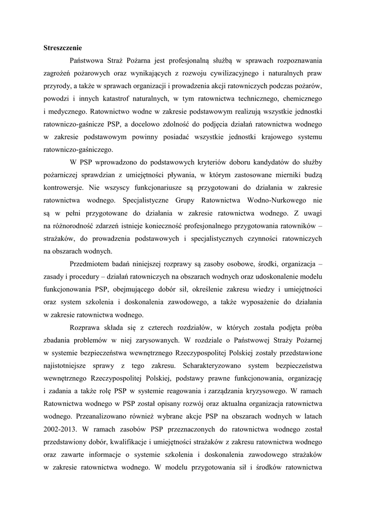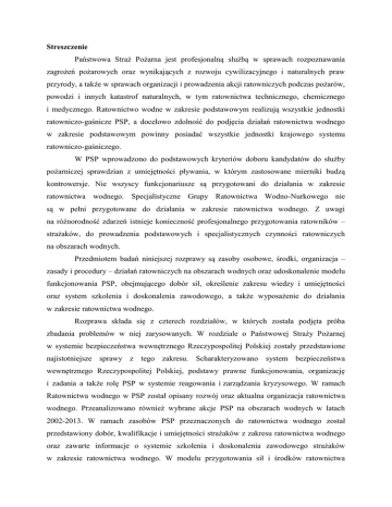 Streszczenie Państwowa Straż Pożarna jest profesjonalną służbą w sprawach rozpoznawania zagrożeń pożarowych oraz wynikających z rozwoju cywilizacyjnego i naturalnych praw przyrody, a także w sprawach organizacji i prowadzenia akcji ratowniczych podczas pożarów, powodzi i innych katastrof naturalnych, w tym ratownictwa technicznego, chemicznego i medycznego. Ratownictwo wodne w zakresie podstawowym realizują wszystkie jednostki ratowniczo-gaśnicze PSP, a docelowo zdolność do podjęcia działań ratownictwa wodnego w zakresie podstawowym powinny posiadać wszystkie jednostki krajowego systemu ratowniczo-gaśniczego. W PSP wprowadzono do podstawowych kryteriów doboru kandydatów do służby pożarniczej sprawdzian z umiejętności pływania, w którym zastosowane mierniki budzą kontrowersje. Nie wszyscy funkcjonariusze są przygotowani do działania w zakresie ratownictwa wodnego. Specjalistyczne Grupy Ratownictwa Wodno-Nurkowego nie są w pełni przygotowane do działania w zakresie ratownictwa wodnego. Z uwagi na różnorodność zdarzeń istnieje konieczność profesjonalnego przygotowania ratowników – strażaków, do prowadzenia podstawowych i specjalistycznych czynności ratowniczych na obszarach wodnych. Przedmiotem badań niniejszej rozprawy są zasoby osobowe, środki, organizacja – zasady i procedury – działań ratowniczych na obszarach wodnych oraz udoskonalenie modelu funkcjonowania PSP, obejmującego dobór sił, określenie zakresu wiedzy i umiejętności oraz system szkolenia i doskonalenia zawodowego, a także wyposażenie do działania w zakresie ratownictwa wodnego. Rozprawa składa się z czterech rozdziałów, w których została podjęta próba zbadania problemów w niej zarysowanych. W rozdziale o Państwowej Straży Pożarnej w systemie bezpieczeństwa wewnętrznego Rzeczypospolitej Polskiej zostały przedstawione najistotniejsze sprawy z tego zakresu. Scharakteryzowano system bezpieczeństwa wewnętrznego Rzeczypospolitej Polskiej, podstawy prawne funkcjonowania, organizację i zadania a także rolę PSP w systemie reagowania i zarządzania kryzysowego. W ramach Ratownictwa wodnego w PSP został opisany rozwój oraz aktualna organizacja ratownictwa wodnego. Przeanalizowano również wybrane akcje PSP na obszarach wodnych w latach 2002-2013. W ramach zasobów PSP przeznaczonych do ratownictwa wodnego został przedstawiony dobór, kwalifikacje i umiejętności strażaków z zakresu ratownictwa wodnego oraz zawarte informacje o systemie szkolenia i doskonalenia zawodowego strażaków w zakresie ratownictwa wodnego. W modelu przygotowania sił i środków ratownictwa wodnego PSP zostały zamieszczone wyniki badań ankietowych z charakterystyką badanej populacji oraz ich analizą i wnioskami. Określono kierunki zmian w podstawach formalnoprawnych realizacji zadań PSP w zakresie ratownictwa wodnego. Ponadto przedstawiono efektywny przebieg doboru i szkolenia strażaków – ratowników wodnych oraz zaproponowano standardy wyposażenia PSP w sprzęt ratownictwa wodnego. Na podstawie analizy wybranych działań i akcji ratowniczych na obszarach wodnych zostało stwierdzone, że nie wszyscy strażacy PSP są właściwie przygotowani do ratownictwa wodnego. Działania na obszarach wodnych nie powinny być ograniczone do działań nurkowych. Strażacy powinni posiadać wiedzę i umiejętności do prowadzenia działań na różnych zbiornikach wodnych, w warunkach szczególnych, w czasie powodzi, na wodach szybkopłynących lub pokrytych lodem. System organizacji szkoleń z zakresu ratownictwa wodnego w PSP w zasadzie został ograniczony do szkoleń nurkowych niezbędnych do podjęcia działań ratowniczych w zakresie specjalistycznym. Programy szkoleń nurkowych PSP objęły wąski zakres. Powinno się opracować programy szkolenia ratownictwa wodnego w zakresie podstawowym, z pomocami dydaktycznymi, materiałami w formie podręczników lub skryptów, z których strażacy PSP mogliby korzystać także podczas doskonalenia zawodowego. W pracy zaproponowano rozwiązania systemowe szkolenia oraz doskonalenia zawodowego strażaków PSP – ratowników wodnych. W związku z różnorodnością obszarów chronionych przez jednostki ratowniczogaśnicze PSP, wyposażenie w sprzęt ratownictwa wodnego powinno być adekwatne do specyfiki obszaru chronionego, a także do realizacji zadań przewidzianych w ramach odwodów operacyjnych. W pracy zostały wskazane propozycje rozwiązań w zakresie podstawowego wyposażenia PSP w sprzęt ratownictwa wodnego. Zmianie należy poddać proces przygotowywania zasobów osobowych PSP do działania w zakresie ratownictwa wodnego. Każdy strażak PSP powinien zgodnie z oczekiwaniami społecznymi być ratownikiem wszechstronnym o najwyższych kwalifikacjach, w tym przygotowanym do podejmowania akcji ratowniczych na obszarach wodnych w każdych warunkach. Celem badań było udoskonalenie modelu organizacji PSP do działań w ramach ratownictwa wodnego. Zakładany cel badań został osiągnięty. W pracy został zaproponowany model organizacji PSP do działań w ramach ratownictwa wodnego, obejmujący dobór sił, określenie zakresu wiedzy i umiejętności oraz system szkolenia i doskonalenia zawodowego, a także wyposażenie do działania w zakresie ratownictwa wodnego. Określono rolę PSP w obszarze zadań związanych z ratownictwem wodnym. Oceniono stopień przygotowania PSP do działań w obszarze zadań związanych z ratownictwem wodnym, a także zaproponowano niezbędne zmiany w przygotowaniu i organizacji sił i środków PSP do działań w obszarze zadań związanych z ratownictwem wodnym. Wskazano jak zwiększyć efektywność organizacji PSP do działań w ramach ratownictwa wodnego, co stanowiło główny problem badawczy niniejszej pracy. Problemy szczegółowe ukierunkowały badania na zadania jakie realizuje PSP w obszarze związanym z ratownictwem wodnym. Należy dokonać zmian w formach i metodach przygotowan