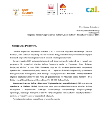 Dyrektorzy, Animatorzy Domów/Ośrodków Kultury realizujących Program Narodowego Centrum Kultury „Dom Kultury+ Inicjatywy lokalne” 2016 Szanowni Państwo, Centrum Wspierania Aktywności Lokalnej „CAL” – realizator Programu Narodowego Centrum Kultury „Dom Kultury+ Inicjatywy lokalne” wspiera domy/ośrodki kultury w realizacji inicjatyw lokalnych na podstawie zdiagnozowanych potrzeb lokalnego środowiska. Stowarzyszenie „CAL” jest organizatorem trzech konwentów odbywających się w ramach ww. programu dla wszystkich domów kultury biorących udział w Programie „Dom Kultury+ Inicjatywy lokalne” w roku 2016. Konwenty mają na celu zarówno podnoszenie kompetencji dyrektorów i animatorów instytucji kultury, jak i wymianę doświadczeń pomiędzy podmiotami biorącymi udział w Programie „Dom Kultury+ Inicjatywy lokalne”. Konwent w województwie śląskim zaplanowaliśmy w tym roku 28 października w Miejskim Domu Kultury – Dom Kultury im. Wiktorii Kubisz, ul. Słowackiego 17, 43-382 Bielsko-Biała. Narodowe Centrum Kultury i Centrum Wspierania Aktywności Lokalnej CAL zaprasza na spotkanie w Bielsku Białej dyrektorów oraz pracowników/animatorów domów kultury szczególnie z województw: śląskiego, dolnośląskiego małopolskiego, świętokrzyskiego, opolskiego, łódzkiego biorących udział w edycji Programu Dom Kultury+ Inicjatywy lokalne” zarówno w roku 2016 jak i w poprzednich edycjach. Poniżej przedstawiamy szczegółowy program konwentu. PROGRAM KONWENTU Miejsce: Miejski Dom Kultury – Dom Kultury im. Wiktorii Kubisz ul. Słowackiego 17 43-382 Bielsko-Biała Rejestracja uczestników, powitalna kawa i herbata 9.30-10.00 10.00 – 10.30 10.30 -13.30 13.30-13.45 13.45-14.15 14.15-14.30 14.30 -15.00 15.00 Rozpoczęcie konwentu, przywitanie uczestników przez organizatorów (Narodowe Centrum Kultury, Centrum Wspierania Aktywności Lokalnej CAL, Miejski Dom Kultury w Bielsku-Białej), „ Jak mówić o kulturze” - szkolenie z zakresu rzecznictwa i komunikacji domów kultury z różnymi interesariuszami. Zagadnienia szkoleniowe: 1. Fundamenty skutecznego wystąpienia. 2. Etos/logos/pathos, czyli trójkąt retoryczny Arystotelesa. 3. Jak dotrzeć do różnych odbiorców? Model Extended Disc. 4. Skutecznie o kulturze. Prowadząca: Natalia de Barbaro –psycholożka, socjolożka, specjalistka do spraw komunikacji społecznej. Od ponad 20 lat prowadzi szkolenia dla biznesu i organizacji pozarządowych, między innymi dla Fundacji Batorego, Szkoły Liderów PAFW, Kampanii Przeciw Homofobii, Idei Zmiany (w ramach Programu Rozwoju Bibliotek) Przerwa kawowa Prezentacje działań domów kultury uczestniczących w Programie Dom Kultury+ Inicjatywy Lokalne: - Dom Kultury + w Rudzie Śląskiej czyli Kameralne Familoki – Miejskie Centrum Kultury im. Henryka Bisty - Dom Kultury + Inicjatywy Lokalne = Rozwój lokalnej świadomości kulturalnej – Miejski Ośrodek Kultury w Żorach Program Dom Kultury+ Inicjatywy lokalne jako instrument wspierania budowy lokalnego kapitału społecznego. Refleksja na podstawie badań opinii beneficjentów – Paweł Kamiński Wyzwania dla domów kultury na przyszłość i rekomendacje do Programu Dom Kultury+ Inicjatywy lokalne 2017 Posiłek obiadowy Szanowni Państwo, prosimy o potwierdzenie udziału w konwencie do 24.10.2016; Centrum Wspierania Aktywności Lokalnej CAL Anna Czarnecka mail: [email protected], tel.: 667 820 755. Z poważaniem, Bohdan Skrzypczak Prezes Centrum Wspierania Aktywności Lokalnej CAL
