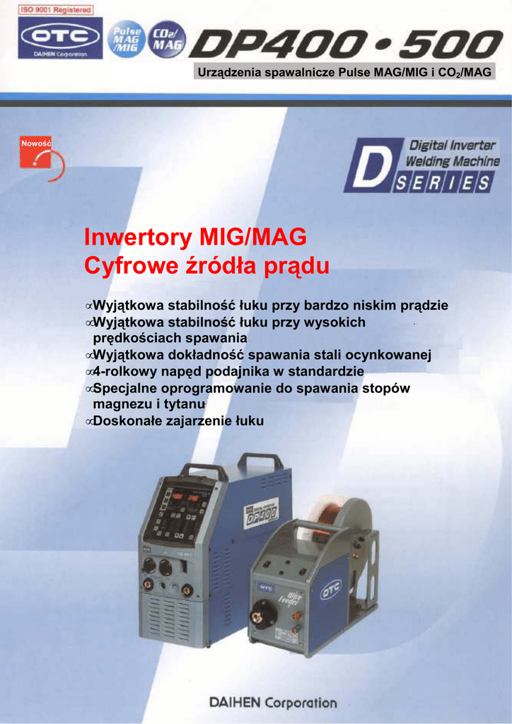 Urządzenia spawalnicze Pulse MAG/MIG i CO2/MAG Nowość Inwertory MIG/MAG Cyfrowe źródła prądu • Wyjątkowa stabilność łuku przy bardzo niskim prądzie • Wyjątkowa stabilność łuku przy wysokich prędkościach spawania • Wyjątkowa dokładność spawania stali ocynkowanej • 4-rolkowy napęd podajnika w standardzie • Specjalne oprogramowanie do spawania stopów magnezu i tytanu • Doskonałe zajarzenie łuku Najlepsze urządzenie z D-serii, do wysokojakościowego spawania • • • DP400•500 Źródło to oferuje optymalne własności spawania zarówno przy Pulsie jak równieŜ w standardowym trybie dla spawania materiałów takich jak: stal, stal stopowa, czy aluminium. Stal Stal Stopowa MIG Stal Stal Stopowa Stal • Stal stopowa MIG/MAG Puls Lepsze wyniki przy ocynkowanych materiałach! UmoŜliwia wysokiej jakości spawanie blach ocynkowanych redukując podtopienia. [Prąd: 170A, Prędkość spawania: 100cm/min, Drut: 1,2mm, Grub. mat.: 1,6mm] Redukcja odprysków! Niskie napięcie łuku umoŜliwia zdecydowaną redukcję odprysków. Stabilny łuk utrzymywany jest równieŜ przy zastosowaniu wysokich prędkości spawania. Odpryski (g/min) Prąd spawania: 150A, prędkość spawania 60cm/min Redukcja odprysków Konwencjonalne DP 400•500 Napięcie (V) CO2/MIG/MAG Zapewnia wysoką jakość oraz wysokie prędkości przy spawaniu cienkich materiałów. NatęŜenie: 125A Napięcie: 18V Prędkość: 150cm/min Średnica drutu: 1,2mm Grubość materiału: 1mm MoŜliwe jest spawanie cienkich materiałów metodą CO2/MAG, przy wprowadzeniu minimalnego ciepła i zachowaniu wysokiej jakości spawania bez podtopień. Miękki łuk zwiększa wydajność przy półautomatycznym spawaniu. Miękki łuk zwiększa stabilność parametrów przy wysokich prędkościach spawania. Charakterystyka łuku • • • Twardy łuk Do wysokich prędkości Stabilny łuk we wszystkich pozycjach Stabilny łuk takŜe przy długich przewodach • • • Miękki łuk Redukcja odprysków Płaska spoina Z wysokimi prądami MIG puls Wysoka stabilność łuku takŜe przy niskim prądzie spawania Nowsze pełnosynergiczne sterowanie! Drut: Φ1,2mm Grubość materiału Proces spawania: MIG Puls, Prąd spawania: 25A, Napięcie: 17V, Prędkość:70cm/min, Spoina: zakładkowa, Drut: Φ1,2mm, Grubość mater.: 0,8mm Stała długość łuku jest utrzymywanatakŜe przy długich przewodach Urządzenie konwencjonalne DP400•500 MoŜliwość spawania od 0,8mm [mm] Napięcie pomiędzy palnikiem, a materiałem MoŜliwe jest spawanie drutem Φ1,2mm przy 25A . MIG puls pozwala spawać materiały o grubości 0,8-1,0 mm 22 20 18 Strona + 16 Napięcie między Źródło palnikiem, a prądu materiałem 14 Strona - Standardowa synergia Synergia DP400•500 (V) Długość przewodu [70mm2] (m) Minimalne napięcie Zwiększona tolerancja napięcia i zwiększona stabilność łuku Przydatne zarówno przy stosowaniu wysokich prędkości, jak i przy spawaniu pierwszej warstwy, przy których stosuje się niskie napięcie. Łuk jest bardzo stabilny i skoncentrowany, co zapewnia wysoką jakość ze stałym wtopieniem. Drut: A4043 Φ1,6mm Zwiększona tolerancja napięcia Konwencjonalne DP400•500 (V) Prąd spawania (A) PodwyŜszenie jakości spawania przez funkcję Wave-Puls (Opcja)! Spoina podobna do spoiny z metody TIG. Idealny do stosowania ręcznego, automatyzacji i robotyzacji. Dzięki wyjątkowej kontroli odprowadzanego ciepła szczelina jest bardziej wypełniona, co podwyŜsza jakość spoiny przyspawaniu Obszar spawania dla Wave Puls i zautomatyzowanym. Standard Puls. Prąd: 100A, Napięcie: 18V, Prędkość:80cm/min, Widok spoiny Drut: Φ1,2mm, Grubość materiału: 2mm Grubość materiału: 2mm Zwiększony obszar spawania dla Wave Puls Spawanie wysokojakościowe Dzięki zastosowaniu opcji Wave Puls polepszone są właściwości metalurgiczne spoiny przez zmniejszenie ziarnistości struktury. Wyeliminowane są wady spoiny typu: pory i pęknięcia . Szczelina 1,5mm Szczelina Prąd: 160A, Napięcie: 19V, Prędkość: 60cm/min, Drut: Φ1,2mm, Grubość materiału: 4mm (mm) Szczelina 2,5mm Punkt centralny - kierunek + kierunek Szczelina Obszar spawania dla Standard Puls MIG Punkt środkowy drutu (mm) MIG Idealnie miękki łuk dla aluminium, polepsza wydajność szczególnie przy wysokich prądach. Spawanie DC MIG grubych elementów z aluminium wymaga stabilnego, miękkiego luku, tylko to daje gwarancję uzyskania wysokiej jakości spoiny. Proces spawania: DC MIG, Prąd: 250A, Napięcie: 27V, Prędkość: 40cm/min, Spoina: pachwinowa, Drut: Φ1,2mm, Grubość materiału.: 12mm, Gaz ochronny: Ar 20l/min Do spawanie wysokojakościowego Nowa charakterystyka obniŜa poziom hałasu łuku Nowy cyfrowy Turbo Start poprawia znacznie inicjację łuku Redukcja „głośności” łuku przy spawaniu Puls zmniejsza zmęczenie spawacza podczas pracy. Ilość właściwych startów Poziom głośności Ta wyjątkowa metoda zajarzenia umoŜliwia idealną inicjację łuku niezaleŜnie od spawanego materiału, co jest szczególnie korzystne przy automatyzacji i robotyzacji. Konwencjo -nalne Konwencjo -nalne Aluminium 50A Aluminium 100A Stal 100A Stal 150A Odległość pomiaru: 1 m Idealne spawarki do współpracy z robotami Parametry spawania Prąd spawania, napięcie Charakterystyka łuku Ustawienie Czas wypływu gazu parametrów Prędkość podawania drutu początku i końca łuku Czas wypełnienia krateru Kontrola anti-stick Ustawienie parametrów Puls Ustawienie rodzaju spawania Zmiana rodzaju spawania Monitor parametrów łuku (prąd, napięcie) Monitor błędów spawania Historia błędów Wykrywanie przerw łuku Kontrola wtopienia drutu Częstotliwość Wave Puls Typ Ŝelazny Typ Ŝelazny Typ nieŜelazny Puls OFF Puls OFF Puls ON Kontrola Kontrola długości łuku Puls ON Inteligentny filtr kontroli Cyfrowa idea tego urządzenia umoŜliwia 4 róŜne sposoby regulacji długości łuku. NaleŜy wybrać jedynie metodę spawania oraz rodzaj ma