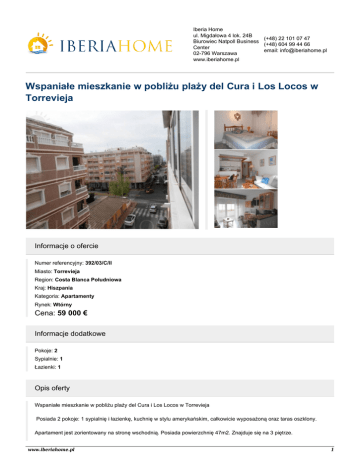 Iberia Home ul. Migdałowa 4 lok. 24B (+48) 22 101 07 47 Biurowiec Natpoll Business (+48) 604 99 44 66 Center email: [email protected] 02-796 Warszawa www.iberiahome.pl Wspaniałe mieszkanie w pobliżu plaży del Cura i Los Locos w Torrevieja Informacje o ofercie Numer referencyjny: 392/03/C/II Miasto: Torrevieja Region: Costa Blanca Południowa Kraj: Hiszpania Kategoria: Apartamenty Rynek: Wtórny Cena: 59 000 € Informacje dodatkowe Pokoje: 2 Sypialnie: 1 Łazienki: 1 Opis oferty Wspaniałe mieszkanie w pobliżu plaży del Cura i Los Locos w Torrevieja Posiada 2 pokoje: 1 sypialnię i łazienkę, kuchnię w stylu amerykańskim, całkowicie wyposażoną oraz taras oszklony. Apartament jest zorientowany na stronę wschodnią. Posiada powierzchnię 47m2. Znajduje się na 3 piętrze. www.iberiahome.pl 1 Mieszkanie jest umeblowane i gotowe do zamieszkania. W pobliżu znajdują się wszystkie usługi. Udogodnienia ● Taras ● Umeblowany www.iberiahome.pl 2