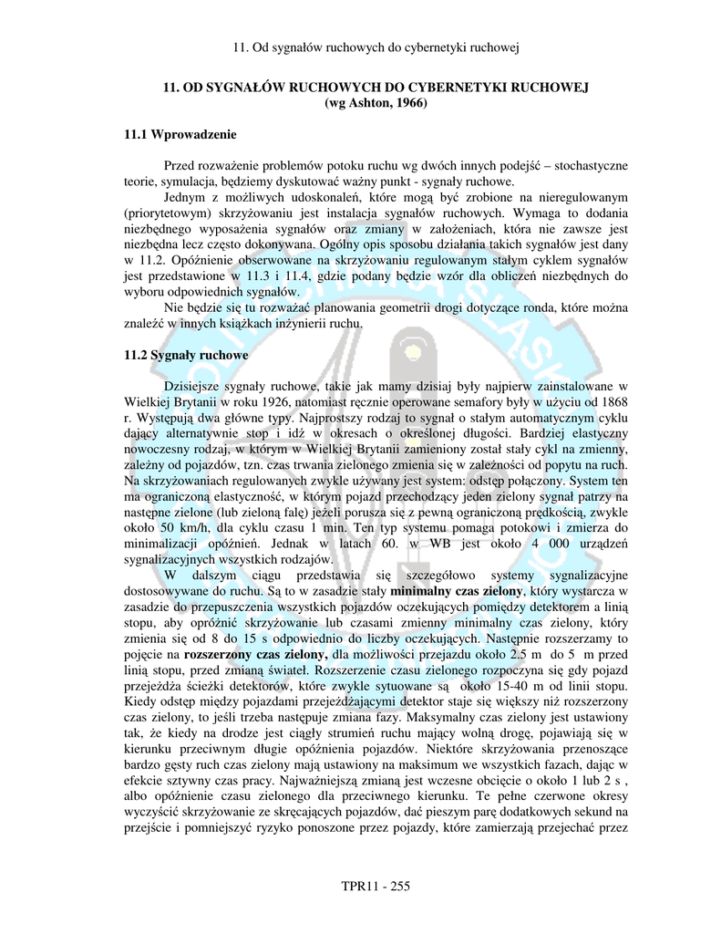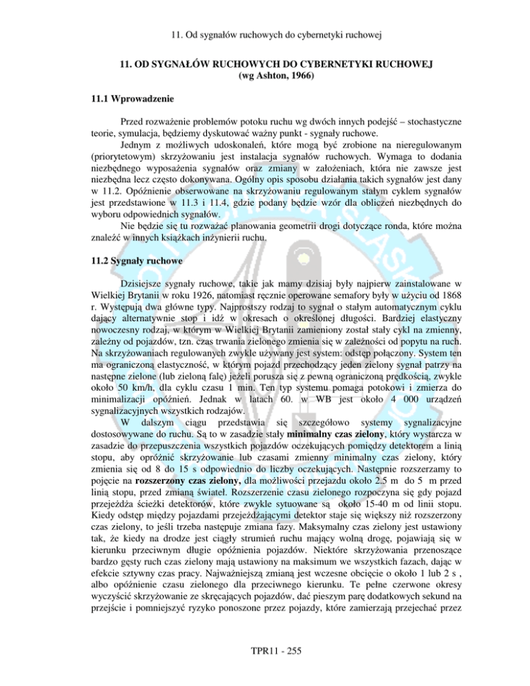 11. Od sygnałów ruchowych do cybernetyki ruchowej 11. OD SYGNAŁÓW RUCHOWYCH DO CYBERNETYKI RUCHOWEJ (wg Ashton, 1966) 11.1 Wprowadzenie Przed rozważenie problemów potoku ruchu wg dwóch innych podejść – stochastyczne teorie, symulacja, będziemy dyskutować ważny punkt - sygnały ruchowe. Jednym z możliwych udoskonaleń, które mogą być zrobione na nieregulowanym (priorytetowym) skrzyżowaniu jest instalacja sygnałów ruchowych. Wymaga to dodania niezbędnego wyposażenia sygnałów oraz zmiany w założeniach, która nie zawsze jest niezbędna lecz często dokonywana. Ogólny opis sposobu działania takich sygnałów jest dany w 11.2. Opóźnienie obserwowane na skrzyżowaniu regulowanym stałym cyklem sygnałów jest przedstawione w 11.3 i 11.4, gdzie podany będzie wzór dla obliczeń niezbędnych do wyboru odpowiednich sygnałów. Nie będzie się tu rozważać planowania geometrii drogi dotyczące ronda, które można znaleźć w innych książkach inżynierii ruchu. 11.2 Sygnały ruchowe Dzisiejsze sygnały ruchowe, takie jak mamy dzisiaj były najpierw zainstalowane w Wielkiej Brytanii w roku 1926, natomiast ręcznie operowane semafory były w użyciu od 1868 r. Występują dwa główne typy. Najprostszy rodzaj to sygnał o stałym automatycznym cyklu dający alternatywnie stop i idź w okresach o określonej długości. Bardziej elastyczny nowoczesny rodzaj, w którym w Wielkiej Brytanii zamieniony został stały cykl na zmienny, zależny od pojazdów, tzn. czas trwania zielonego zmienia się w zależności od popytu na ruch. Na skrzyżowaniach regulowanych zwykle używany jest system: odstęp połączony. System ten ma ograniczoną elastyczność, w którym pojazd przechodzący jeden zielony sygnał patrzy na następne zielone (lub zieloną falę) jeżeli porusza się z pewną ograniczoną prędkością, zwykle około 50 km/h, dla cyklu czasu 1 min. Ten typ systemu pomaga potokowi i zmierza do minimalizacji opóźnień. Jednak w latach 60. w WB jest około 4 000 urządzeń sygnalizacyjnych wszystkich rodzajów. W dalszym ciągu przedstawia się szczegółowo systemy sygnalizacyjne dostosowywane do ruchu. Są to w zasadzie stały minimalny czas zielony, który wystarcza w zasadzie do przepuszczenia wszystkich pojazdów oczekujących pomiędzy detektorem a linią stopu, aby opróżnić skrzyżowanie lub czasami zmienny minimalny czas zielony, który zmienia się od 8 do 15 s odpowiednio do liczby oczekujących. Następnie rozszerzamy to pojęcie na rozszerzony czas zielony, dla możliwości przejazdu około 2.5 m do 5 m przed linią stopu, przed zmianą świateł. Rozszerzenie czasu zielonego rozpoczyna się gdy pojazd przejeżdża ścieżki detektorów, które zwykle sytuowane są około 15-40 m od linii stopu. Kiedy odstęp między pojazdami przejeżdżającymi detektor staje się większy niż rozszerzony czas zielony, to jeśli trzeba następuje zmiana fazy. Maksymalny czas zielony jest ustawiony tak, że kiedy na drodze jest ciągły strumień ruchu mający wolną drogę, pojawiają się w kierunku przeciwnym długie opóźnienia pojazdów. Niektóre skrzyżowania przenoszące bardzo gęsty ruch czas zielony mają ustawiony na maksimum we wszystkich fazach, dając w efekcie sztywny czas pracy. Najważniejszą zmianą jest wczesne obcięcie o około 1 lub 2 s , albo opóźnienie czasu zielonego dla przeciwnego kierunku. Te pełne czerwone okresy wyczyścić skrzyżowanie ze skręcających pojazdów, dać pieszym parę dodatkowych sekund na przejście i pomniejszyć ryzyko ponoszone przez pojazdy, które zamierzają przejechać przez TPR11 - 255 11. Od sygnałów ruchowych do cybernetyki ruchowej żółte lub początek czasu czerwonego. Jak już wykazano w literaturze, takie założenie pomaga zredukować wypadki związane z kolizjami na skrzyżowaniu. W roku 1964 Ministerstwo Transportu WB rozważało wprowadzenie formy zmiennego cyklu odpowiedniego do warunków na drodze (a szczególnie na wielo pasowych drogach) przenoszących gęsty ruch, gdzie sygnalizacja działają w stałym cyklu, z powodu ciężkiego ruchu. Zwykle w systemach połączonych sygnalizatorów pojazdy czasem przybywają do następnego skrzyżowania tak szybko, że muszą stać i startować, opóźniając inne pojazdy, które poruszają się z odpowiednią prędkością. W niektórych systemach połączonych odpowiednia prędkość może się bardzo wahać w różnych częściach systemu i tu może być bardzo trudno kierowcy utrzymać właściwą prędkość dla płynnego przejścia przez cały system, mimo że z uwagi na tę prędkość (korzyści – JW.) są zawsze zwracane. W dodatku pojazdy wchodzące z bocznych dróg są często poza fazą płynności. Dlatego są tu pewne straty w takim rodzaju postępowania. Połączone systemy wymagają komputerów do sterowania indywidualnymi sygnalizatorami. Idea ta prowadzi do łączenia wielu skrzyżowań sterowanych przez jeden komputer centralny. 11.3 Wzór na opóźnienie na skrzyżowaniu z sygnalizatorami. W latach 60. Oceniono w WB, że łączne opóźnienia na skrzyżowaniach regulowanych wynoszą około 100 mln pojazdogodzin każdego roku. Z tego względu potencjał kosztów tkwiący we właściwej regulacji sygnalizatorów dla minimalizacji opóźnień jest warty rozważań. W dalszym ciągu rozważa się dwa wzory na średnie opóźnienie na skrzyżowaniu regulowanym. Wzór, który uzyskał Webster (1958), dla opóźnień jest wzorem empirycznym odnoszącym się do pojazdów przybywających losowo do sygnalizatorów o stałym cyklu. Wzór ten uzyskany został za pomocą symulacji komputerowej, przy założeniu losowych przyjazdów pojazdów, co oznacza wykładnicze odstępy. Teoretyczne metody dla obliczenia opóźnienia na skrzyżowaniu regulowanym o stałym cyklu nie były satysfakcjonujące, aż do pojawienia się wzorów Webstera. Wzór ten daje średnie opóźnienie na pojazd dla pojedynczego podejścia do skrzyżowania. Jest różn