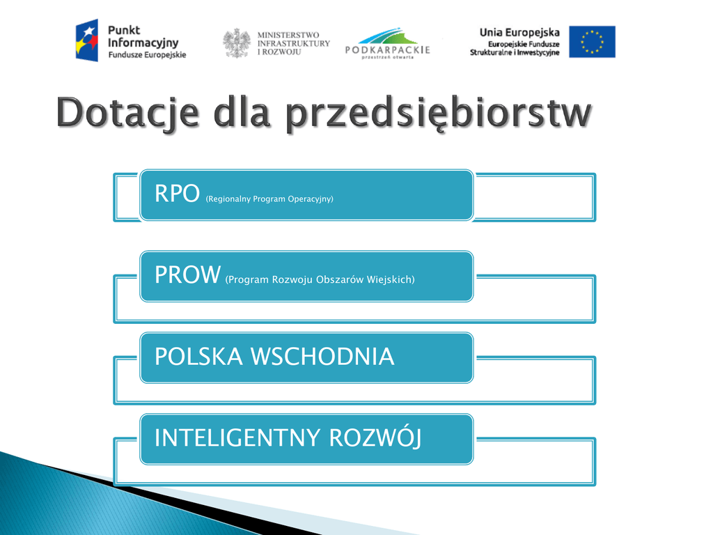 RPO (Regionalny Program Operacyjny) PROW (Program Rozwoju Obszarów Wiejskich) POLSKA WSCHODNIA INTELIGENTNY ROZWÓJ PROW (Program Rozwoju Obszarów Wiejskich) •Działanie: Rozwój przedsiębiorczości – Rozwój usług rolniczych •Działanie: Przetwórstwo i marketing produktów rolnych •Działanie: Zakładanie działalności gospodarczej i rozwój przedsiębiorczości (LEADER) •Działanie: Tworzenie i rozwój inkubatorów przetwórstwa lokalnego (LEADER) •Działanie: Premie na rozpoczęcie działalności pozarolniczej POLSKA WSCHODNIA •Działanie 1.3.1 Wdrażanie innowacji przez MŚP •Działanie 1.4 „Wzór na konkurencję" INTELIGENTNY ROZWÓJ •Działanie 2.3.4 „Ochrona własności przemysłowej" •Działanie 3.2.1 „Badania na rynek" •Działanie 2.3.2 „Bony na innowacje dla MŚP •Działanie 1.1.1 „Badania przemysłowe i prace rozwojowe realizowane przez przedsiębiorstwa” •Działanie 4.1.4 „Projekty aplikacyjne” PROGRAM ROZWOJU OBSZARÓW WIEJSKICH Rozwój przedsiębiorczości – Rozwój usług rolniczych Przetwórstwo i marketing produktów rolnych Zakładanie działalności gospodarczej i rozwój przedsiębiorczości (LEADER) Tworzenie i rozwój inkubatorów przetwórstwa lokalnego (LEADER) Premie na rozpoczęcie działalności pozarolniczej Rozwój przedsiębiorczości – Rozwój usług rolniczych • Wsparcie: 50% kosztów kwalifikowalnych, do 500 tys. zł w okresie realizacji Programu. Rozwój przedsiębiorczości – Rozwój usług rolniczych • Beneficjent: Osoba fizyczna, osoba prawna, jednostka organizacyjna nieposiadająca osobowości prawnej, prowadząca działalność gospodarczą w zakresie usług rolniczych jako mikro- lub małe przedsiębiorstwo przez co najmniej dwa lata przed złożeniem wniosku o przyznanie pomocy. Rozwój przedsiębiorczości – Rozwój usług rolniczych • Konieczność udokumentowania wykonywania usług rolniczych na rzecz podmiotów zewnętrznych na kwotę co najmniej 20 tys. Złotych brutto. Nie mniej niż 10 tys. W każdym roku. • Możliwość realizacji w dwóch etapach • Leasing kwalifikowalny Rozwój przedsiębiorczości – Rozwój usług rolniczych • Zakup/leasing nowych maszyn, narzędzi lub urządzeń do produkcji rolnej • Wdrożenia systemu zarządzania jakością • Opłat za patenty i licencje • Koszty ogólne (kosztorysy, raporty wypisy, biznesplan) • Koszt zakupu ciągnika nie więcej niż 50% pozostałych kosztów Rozwój przedsiębiorczości – Rozwój usług rolniczych • KRYTERIA OCENY 13 Przetwórstwo i marketing produktów rolnych • Beneficjent: • Podmiot, który ma zarejestrowaną działalność w zakresie przetwórstwa lub wprowadzania do obrotu produktów rolnych, działa jako przedsiębiorca wykonujący działalność jako mikro, małe lub średnie przedsiębiorstwo, • rolnik lub domownik podlegający ubezpieczeniu społecznemu rolników w pełnym zakresie (dotyczy rolników rozpoczynających działalności gospodarczą w zakresie przetwórstwa produktów rolnych). Przetwórstwo i marketing produktów rolnych • Poziom dofinansowania: 50% • 3 mln zł dla jednego beneficjenta w okresie realizacji Programu i nie mniej niż 100 tys. zł na operację, • nie więcej niż 300 tys. zł dla rolników rozpoczynających działalność w zakresie przetwórstwa produktów rolnych i nie mniej niż 10 tys. zł. Przetwórstwo i marketing produktów rolnych • Zobowiązanie do nabywania co najmniej 50% całkowitej ilości surowców niezbędnych do produkcji lub sprzedaży hurtowej na podstawie 3 letnich umów. Przetwórstwo i marketing produktów rolnych – Koszty kwalifikowane • Budowa lub modernizacja zakładów przetwórstwa lub infrastruktury handlu hurtowego produktami rolnymi • Zakup maszyn i urządzeń • Operacje związane ze sprzedażą detaliczną (rolnik) • Ogólne • Realizacja od dnia zawarcia umowy. Przetwórstwo i marketing produktów rolnych – kryteria oceny • Kryteria oceny 16 Zakładanie działalności gospodarczej i rozwój przedsiębiorczości (LEADER) • Wsparcie: 300 tys. zł - limit na operacje dotyczące rozwoju przedsiębiorczości • 100 tys. zł. na operację z zakresu rozpoczęcia działalności gospodarczej. Tworzenie i rozwój inkubatorów przetwórstwa lokalnego (LEADER) • Wsparcie: 500 tys. zł na utworzenie inkubatora przetwórstwa lokalnego Premie na rozpoczęcie działalności pozarolniczej • Premia w wysokości 100 tys. zł wypłacana w ratach: I rata – 80% kwoty pomocy, II rata – 20% kwoty pomocy. Premie na rozpoczęcie działalności pozarolniczej • Beneficjenci: „Płatności dla rolników przekazujących małe gospodarstwa” lub Ubezpieczony KRUS • Wielkość ekonomiczna nie większa niż 15 tys. euro, • Płatności za rok poprzedzający rok złożenia • Stworzenie miejsca pracy 2.3.4 „Ochrona własności przemysłowej" 3.2.1 „Badania na rynek" 2.3.2 „Bony na innowacje dla MŚP 1.1.1 „Badania przemysłowe i prace rozwojowe realizowane przez przedsiębiorstwa” 4.1.4 „Projekty aplikacyjne” INTELIGENTNY ROZWÓJ Program INTELIGENTNY ROZWÓJ 2.3.4 „Ochrona własności przemysłowej" Termin: od 22 października 2015 do 31 marca 2016 r. Uzyskanie prawa ochrony własności przemysłowej (tj.: patentów, praw ochronnych na wzory użytkowe) K.K. Intensywn. pomocy Od 10 000 do 1 000 000 zł 50% Dla MŚP www.parp.gov.pl Program INTELIGENTNY ROZWÓJ Poddziałanie 3.2.1 „Badania na rynek" Termin: od 31 sierpnia do 30 września 2015 r. * *do dnia 28 października 2015 r Realizacja projektów dotyczących wdrożenia wyników prac badawczo-rozwojowych przeprowadzonych przez wnioskodawcę samodzielnie lub na jego zlecenie, prowadzących do wprowadzenia na rynek nowych bądź znacząco ulepszonych produktów. K.K. Intensywn. pomocy Powyżej 10 mln zł 35-70% Dla MŚP www.parp.gov.pl Program INTELIGENTNY ROZWÓJ Poddziałanie 2.3.2 „Bony na innowacje dla MŚP Termin: od 31 sierpnia do 30 grudnia 20